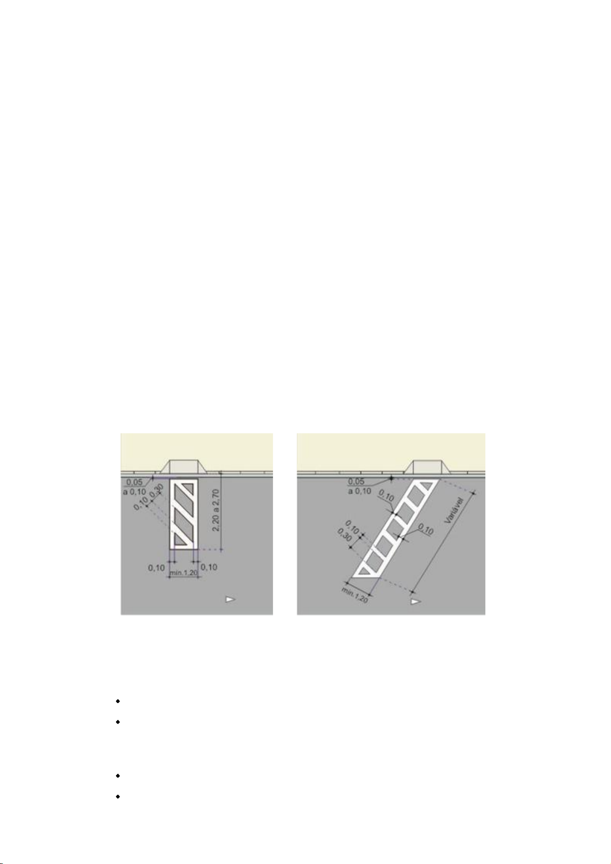ANEXO I SINALIZAÇÃO DE VAGAS RESERVADAS A PESSOA COM DEFICIÊNCIA COM COMPROMETIMENTO DE MOBILIDADE As vagas reservadas a pessoa com deficiência com comprometimento de mobilidade devem ser dimensionadas de forma a garantir, tanto para o condutor quanto para o conduzido, o embarque e desembarque, bem como o acesso ao local de interesse. A sinalização é composta por: 1. Sinalização horizontal Cada vaga reservada deve ser demarcada com a marca delimitadora de estacionamento regulamentado e com o Símbolo Internacional de Acesso - SIA. 1.1. Marca delimitadora de estacionamento regulamentado Largura de 0,10m a 0,20m, na cor branca. 1.2. Área de proteção de estacionamento Trata-se de uma marca de canalização destinada a permitir o embarque e desembarque com segurança, da pessoa com deficiência com comprometimento da mobilidade. Deve estar sempre associada a marca delimitadora de estacionamento regulamentado. Deve possuir largura mínima de 1,20m e ser demarcada na cor branca, podendo ser compartilhada por 2 vagas e dispensada quando a vaga é adjacente a uma faixa de travessia de pedestres, ou quando a vaga tem largura mínima de 3,60m, ver item 3.2.1 deste Anexo. Figura 1 No caso de desnível entre a área de proteção de estacionamento e o passeio deve ser feito rebaixamento do piso com rampa de acesso e abas laterais. O rebaixamento deve estar associado a área de proteção de estacionamento. A rampa de acesso deve: ter largura mínima de 1,20m; ter inclinação constante e de no máximo 8,33%. A rampa de acesso não deve: apresentar desnível (degrau) na junção com a pista; possuir piso tátil de alerta. As abas laterais devem, sempre que possível, ter uma inclinação de 8.33%, admitindo-se nos casos de impraticabilidade uma largura mínima de 0,50m. No caso de interferências físicas com impossibilidade de remoção, tais como árvores, jardins, poços de visita, colunas e outros obstáculos, as abas podem ser dispensadas. A Figura 2 apresenta um rebaixamento padrão. Entende-se por impraticabilidade, conforme disposições contidas na NBR 9050, a condição ou conjunto de condições físicas ou legais que possam impedir a adaptação de edificações, mobiliário, equipamentos ou elementos a acessibilidade. Figura 2 Outros arranjos geométricos de acesso ao passeio podem ser utilizados desde que sejam garantidos as condições de acessibilidade da pessoa com deficiência com comprometimento de mobilidade, especialmente cadeirantes. A Figura 3 apresenta um exemplo de aplicação. Figura 3 1.3. Símbolo Internacional de Acesso (SIA) Toda vaga reservada deve ser demarcada com a marca delimitadora de estacionamento regulamentado e com o Símbolo Internacional de Acesso – SIA devendo sempre estar voltado para o lado direito. Nos casos em que é necessário dar contraste com o pavimento deve ser utilizado o SIA com orla. Figura 4 sem orla com orla Quadro 1 – Características do Símbolo Internacional de Acesso (SIA) Dimensões Lado – L(m) Orla – L1(m) Cor Mínimas 0,80 0,04 Fundo azul Pictograma e orla externa brancos Recomendadas 1,0 0,05 Quadro 2 - Coordenadas Cromáticas - Sinalização Horizontal Cor x y Y Mínimo Máximo Branca 0,355 0,355 75 - 0,305 0,305 0,285 0,325 0,335 0,375 Azul 0,180 0,260 5 15 0,220 0,200 0,250 0,200 0,260 0,280 1.4. Numeração Todas as vagas reservadas em áreas de estacionamento privado de uso coletivo devem ser numeradas. O numeral deve ter altura de 0,10m, na cor branca, inserido num retângulo azul, conforme exemplo de aplicação da Figura 5, exceto quando o pavimento for também azul, conforme Figura 6. Figura 5 Figura 6 A seguir, é apresentado o esquema de locação da numeração na vaga. Figura 7 Figura 8 2. Sinalização Vertical Fica a critério do órgão ou entidade de trânsito com circunscrição sobre a via o uso do sinal vertical de regulamentação “Estacionamento Regulamentado” – R-6b, com a mensagem “COM CREDENCIAL” e Símbolo Internacional de Acesso- SIA, conforme desenho da Figura 9, podendo ser acrescentadas informações, conforme exemplo da Figura 10. Figura 9 Figura 10 3. Dimensões e critérios de colocação A seguir são apresentados os critérios para dimensionamento das vagas e colocação da sinalização horizontal destinada ao estacionamento de veículos para pessoas com deficiência com comprometimento de mobilidade. 3.1. Vaga paralela ao fluxo veicular A vaga destinada ao estacionamento deve ter comprimento mínimo de 5,0m e largura mínima de 2,20m. O Símbolo Internacional de Acesso - SIA deve ser locado conforme demonstrado nas Figuras 11 e 12. Uma vaga em paralelo Figura 11 Duas vagas em paralelo. Figura 12 3.2. Vaga em ângulo em relação ao fluxo veicular. 3.2.1. Vaga perpendicular A vaga destinada ao estacionamento deve ter comprimento mínimo de 5,0m e largura mínima de 2,40m, Figura 13. No caso de vagas sem a necessidade do uso de área de proteção de estacionamento a vaga deve ter largura mínima de 3,60m, Figura 14. O Símbolo Internacional de Acesso - SIA deve ser locado conforme demonstrado nas Figuras 13 e 14. Figura 13 Figura 14 3.2.2. Vaga oblíqua A vaga destinada ao estacionamento deve ter comprimento mínimo de 5,0m e largura mínima de 2,40m, exceto em situações em que não é possível garantir a operação de embarque e desembarque de ambos os lados do veículo. Essa condição ocorre em geral devido à dificuldade da manobra à ré para o estacionamento do veículo, devendo a largura da vaga ser de no mínimo 3,30m, Figura 15. O Símbolo Internacional de Acesso - SIA deve ser locado conforme demonstrado na Figura 15. Figura 15 GR= guia rebaixada 4. Vagas numeradas em estabelecimentos privados de uso coletivo As vagas numeradas devem respeitar as dimensões dispostas no item 3. O Símbolo Internacional de Acesso - SIA e a numeração devem ser locados conforme Figuras 16 a 19 e obedecendo as disposições do item 1.3. 4.1. Vaga paralela ao fluxo veicular com