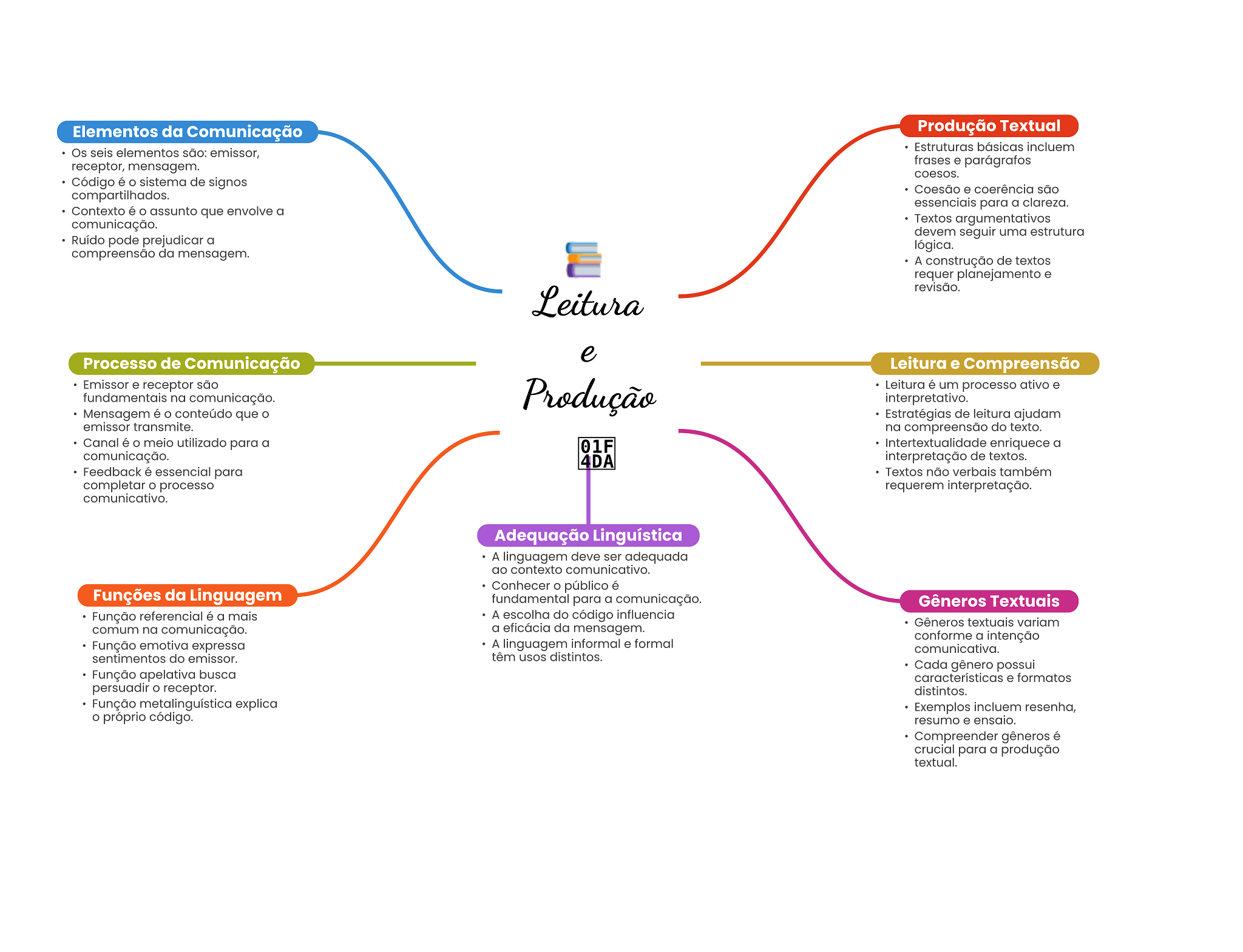 Elementos da Comunicação Produção Textual Estruturas básicas incluem Os seis elementos são: emissor, receptor, mensagem. frases e parágrafos coesos. Código é sistema de signos Coesão e coerência são compartilhados. essenciais para a clareza. Contexto é assunto que envolve a comunicação. Textos argumentativos devem seguir uma estrutura Ruído pode prejudicar a lógica. compreensão da mensagem. A construção de textos requer planejamento e revisão. Leitura e Processo de Comunicação Leitura e Compreensão Emissor e receptor são Produção Leitura é um processo ativo e fundamentais na comunicação. interpretativo. Mensagem é conteúdo que Estratégias de leitura ajudam emissor transmite. na compreensão do texto. Canal é meio utilizado para a 01F Intertextualidade enriquece a comunicação. 4DA interpretação de textos. Feedback é essencial para Textos não verbais também completar processo requerem interpretação. comunicativo. Adequação Linguística A linguagem deve ser adequada ao contexto comunicativo. Conhecer público é Funções da Linguagem fundamental para a comunicação. Gêneros Textuais Função referencial é a mais A escolha do código influencia Gêneros textuais variam comum na comunicação. a eficácia da mensagem. conforme a intenção Função emotiva expressa A linguagem informal e formal comunicativa. sentimentos do emissor. têm usos distintos. Cada gênero possui Função apelativa busca características e formatos persuadir receptor. distintos. Função metalinguística explica Exemplos incluem resenha, próprio código. resumo e ensaio. Compreender gêneros é crucial para a produção textual.