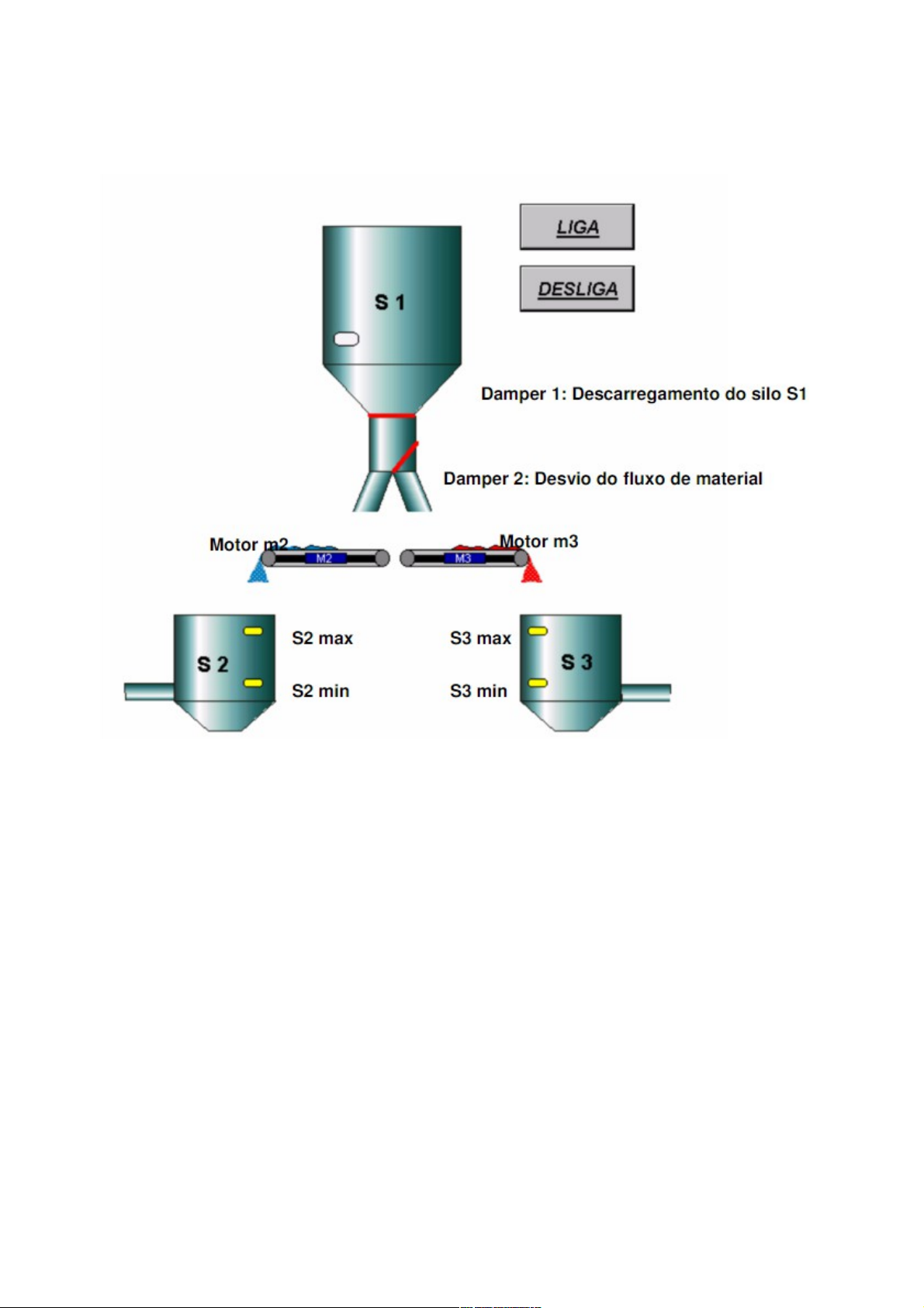 Lista Exercícios 2 - Ladder . 1- Um sistema de silos é utilizado para manter um processo sempre alimentado. Para tal um silo de grãos alimenta outros dois conforme a figura abaixo: Variáveis de Entrada X:0 BOTAO_LIG Botão Liga X:1 BOTAO_DES Botão Desliga X:2 S1_MIN Mínimo Silo 1 atingido X:3 S2_MIN Mínimo Silo 2 atingido X:4 S2_MAX Máximo Silo 2 atingido X:5 S3_MIN Mínimo Silo 3 atingido X:6 S3_MAX Máximo Silo 3 atingido Variáveis de Saída Y:0 MOTOR_2 Aciona motor 2 Y:1 MOTOR_3 Aciona motor 3 Y:2 DAMPER_1 Fecha Damper 1 Y:3 DAMPER_2 Direciona Damper 2 para o Silo 2 O sistema deve funcionar da seguinte maneira: Damper D1 do silo 1 despeja o material no desviador até que o detetor de nível máximo do silo que está sendo carregado seja atingido (S2_MAX ou S3_MAX) ou até ser atingido o nível mínimo no Silo 1 (S1_MIN).O Damper 1 é aberto novamente quando o nível mínimo de um dos dois silos (S2_MIN ou S3_MIN) for atingido. O Damper 2 é ativado/desativado pelo sensor de mínimo dos silos de carregamento direcionando-o para este silo. Após Construir uma lógica que atenda essas especificações, adicione a seguinte condição: após atingir o nível máximo do silo, que está sendo enchido, o dumper 1 deve fechar, mas o motor correspondente deve continuar ligado por 20 segundos, a fim de que não restem grãos sobre a esteira. Somente após o motor que estava ligado desligar (esteira parar), é que deve-se voltar a alimentar os silos dada a necessidade. 2 - Pretende-se transferir peças, entre duas esteiras transportadoras, que fazem entre si um ângulo de 90°. A colocação em funcionamento e parada das esteiras é feita através de contatos tipo botoeira, respectivamente s2 e s0. A parada só deve ocorrer no final de cada ciclo, mas, o sistema também deve ser provido de parada de emergência (pe) que possibilite, a qualquer momento, por ação sobre um botão (s1), a imediata suspensão das ações em curso. Pressionado s2, as esteiras entram em movimento. A esteira 1, que transporta peças, coloca-as em frente do detector s3 que, ao detectá-las, dá ordem de avanço ao cilindro A (A+). Este empurra-as para a esteira 2 até ser atuado o sensor magnético a1 existente no corpo do cilindro. Ao ser atuado o sensor a1, o cilindro A recua (A-) até atuar o sensor a0. Com este sensor atuado, quando chegar uma nova peça, detectada por s3, o ciclo volta a repetir-se. O cilindro A é de duplo efeito controlado por válvulas de dupla ação. 3 - Pretende-se implementar um programa que permita ao operador mediante uma botoeira de START arrancar com uma esteira para descarga de um produto. A esteira deve manter-se em movimento durante 5 Seg. por forma a garantir o escoamento do produto. 4 – Pretende-se implementar um programa que permita ao operador mediante um seletor ON/OFF ativar uma sequência de descarga de produto para uma esteira. Para esse efeito, a eletroválvula existente no silo de descarga deve, a cada 15 segundos, permanecer aberta por 10 segundos. A seguinte figura exemplifica o processo: 5 - Pretende-se controlar a linha de encaixotamento de maçãs representada na figura abaixo: Ao sinal de START, a esteira das caixas entra em funcionamento. O sensor das caixas (SE2)ao detectar uma caixa desliga o a esteira das caixas e aciona a esteira das maçãs. O sensor dasmaçãs (SE1) detecta as maçãs que entram na caixa. Após a caixa receber 10 maçãs, a esteiradas maçãs desliga e a das caixas entra em funcionamento.O sinal de STOP desliga todo o processo. Entradas: Start, Stop, Sensor maças, Sensor caixa; Saídas: Motor esteira caixa, Motor esteira maçãs