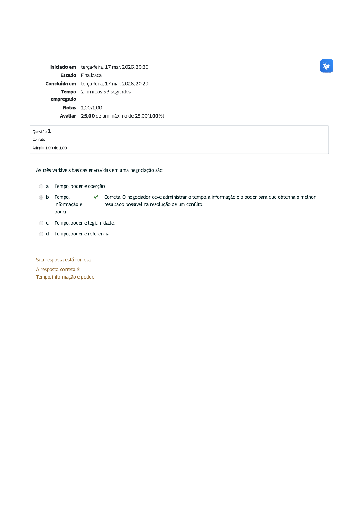 17/03/2026, 20:29 Exercício Avaliativo - Módulo 4: Revisão da tentativa https://mooc41.escolavirtual.gov.br/mod/quiz/review.php?attempt=22654113&cmid=355520 1/2 Iniciado em terça-feira, 17 mar. 2026, 20:26 Estado Finalizada Concluída em terça-feira, 17 mar. 2026, 20:29 Tempo empregado 2 minutos 53 segundos Notas 1,00/1,00 Avaliar 25,00 de um máximo de 25,00(100%) Questão 1 Correto Atingiu 1,00 de 1,00 As três variáveis básicas envolvidas em uma negociação são: a. Tempo, poder e coerção. b. Tempo, informação e poder. Correta. O negociador deve administrar o tempo, a informação e o poder para que obtenha o melhor resultado possível na resolução de um con�ito. c. Tempo, poder e legitimidade. d. Tempo, poder e referência. Sua resposta está correta. A resposta correta é: Tempo, informação e poder. 17/03/2026, 20:29 Exercício Avaliativo - Módulo 4: Revisão da tentativa https://mooc41.escolavirtual.gov.br/mod/quiz/review.php?attempt=22654113&cmid=355520 2/2
