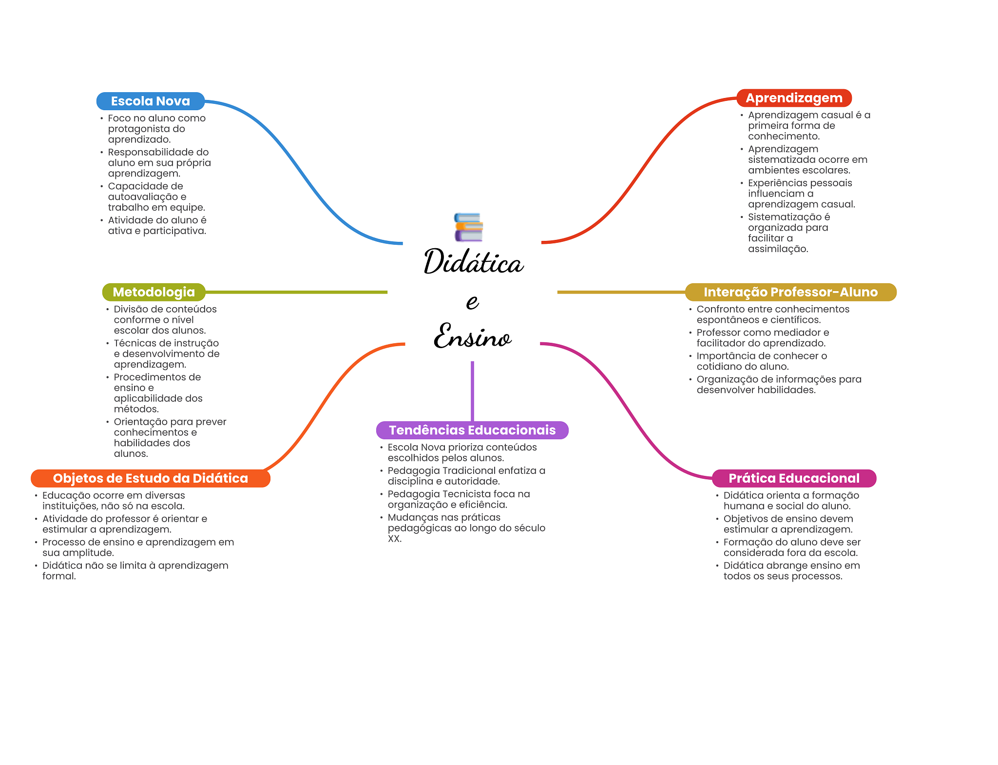Escola Nova Aprendizagem Foco no aluno como Aprendizagem casual é a protagonista do primeira forma de aprendizado. conhecimento. Responsabilidade do Aprendizagem aluno em sua própria sistematizada ocorre em aprendizagem. ambientes escolares. Capacidade de Experiências pessoais autoavaliação e influenciam a trabalho em equipe. aprendizagem casual. Atividade do aluno é Sistematização é ativa e participativa. organizada para facilitar a assimilação. Didática Metodologia Interação Professor-Aluno Divisão de conteúdos e Confronto entre conhecimentos conforme nível espontâneos e científicos. escolar dos alunos. Técnicas de instrução Ensino Professor como mediador e facilitador do aprendizado. e desenvolvimento de Importância de conhecer aprendizagem. cotidiano do aluno. Procedimentos de Organização de informações para ensino e desenvolver habilidades. aplicabilidade dos métodos. Orientação para prever conhecimentos e Tendências Educacionais habilidades dos Escola Nova prioriza conteúdos alunos. escolhidos pelos alunos. Pedagogia Tradicional enfatiza a Objetos de Estudo da Didática disciplina e autoridade. Prática Educacional Educação ocorre em diversas Pedagogia Tecnicista foca na Didática orienta a formação instituições, não só na escola. organização e eficiência. humana e social do aluno. Atividade do professor é orientar e Mudanças nas práticas Objetivos de ensino devem estimular a aprendizagem. pedagógicas ao longo do século estimular a aprendizagem. Processo de ensino e aprendizagem em XX. Formação do aluno deve ser sua amplitude. considerada fora da escola. Didática não se limita à aprendizagem Didática abrange ensino em formal. todos os seus processos.