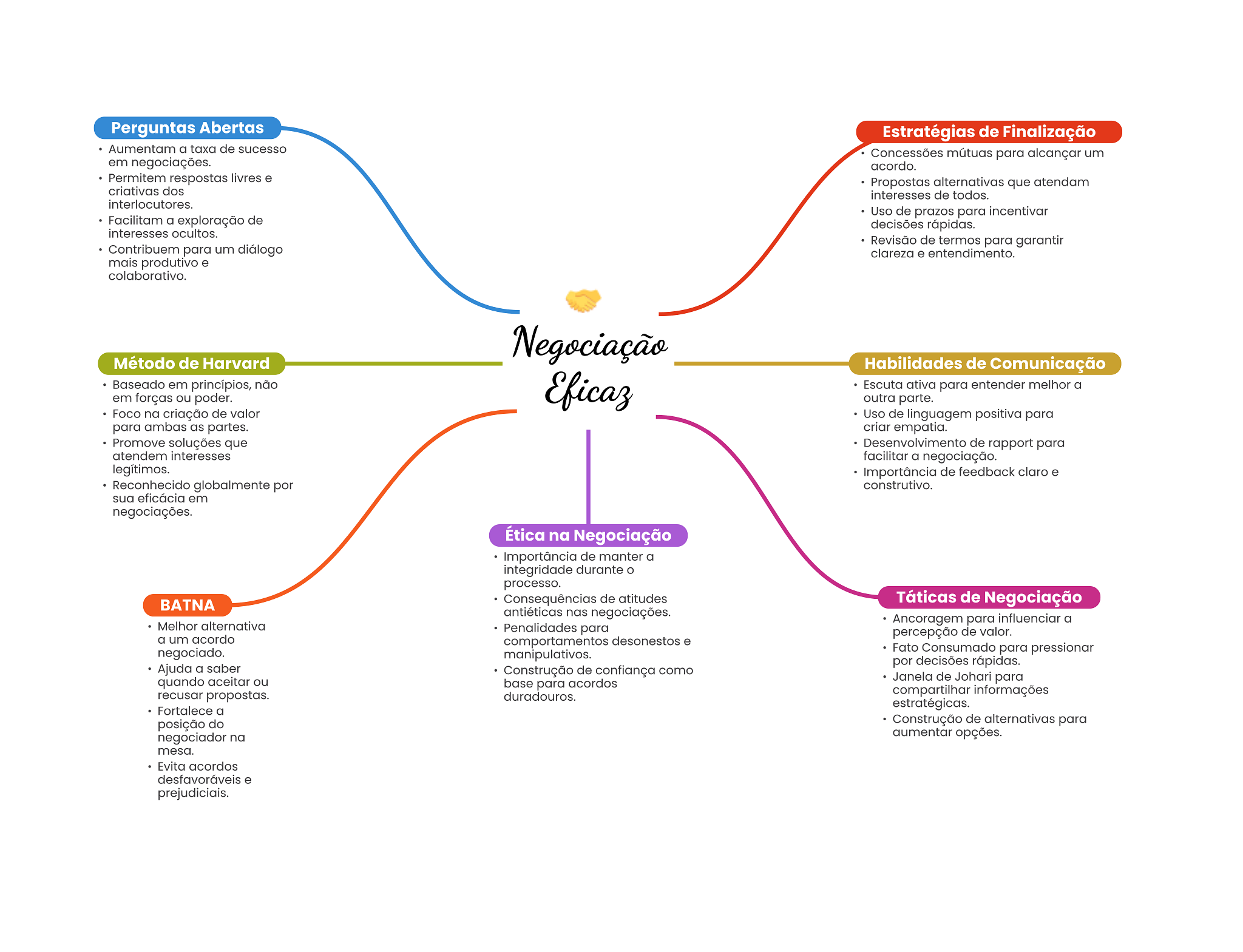 Perguntas Abertas Estratégias de Finalização Aumentam a taxa de sucesso Concessões mútuas para alcançar um em negociações. acordo. Permitem respostas livres e Propostas alternativas que atendam criativas dos interesses de todos. interlocutores. Uso de prazos para incentivar Facilitam a exploração de decisões rápidas. interesses ocultos. Revisão de termos para garantir Contribuem para um diálogo clareza e entendimento. mais produtivo e colaborativo. Negociação Método de Harvard Habilidades de Comunicação Baseado em princípios, não Eficaz Escuta ativa para entender melhor a em forças ou poder. outra parte. Foco na criação de valor Uso de linguagem positiva para para ambas as partes. criar empatia. Promove soluções que Desenvolvimento de rapport para atendem interesses facilitar a negociação. legítimos. Importância de feedback claro e Reconhecido globalmente por construtivo. sua eficácia em negociações. Ética na Negociação Importância de manter a integridade durante O processo. BATNA Consequências de atitudes Táticas de Negociação antiéticas nas negociações. Ancoragem para influenciar a Melhor alternativa Penalidades para percepção de valor. a um acordo comportamentos desonestos e negociado. manipulativos. Fato Consumado para pressionar por decisões rápidas. Ajuda a saber Construção de confiança como quando aceitar ou base para acordos Janela de Johari para recusar propostas. duradouros. compartilhar informações estratégicas. Fortalece a posição do Construção de alternativas para negociador na aumentar opções. mesa. Evita acordos desfavoráveis e prejudiciais.