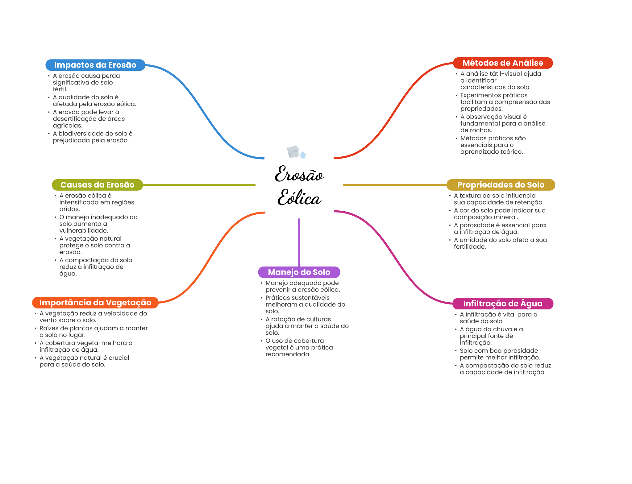 Impactos da Erosão Métodos de Análise A erosão causa perda A análise tátil-visual ajuda significativa de solo a identificar fértil. características do solo. A qualidade do solo é Experimentos práticos afetada pela erosão eólica. facilitam a compreensão das A erosão pode levar à propriedades. desertificação de áreas A observação visual é agrícolas. fundamental para a análise de rochas. A biodiversidade do solo é prejudicada pela erosão. Métodos práticos são essenciais para aprendizado teórico. Erosão Causas da Erosão Propriedades do Solo A erosão eólica é Eólica A textura do solo influencia intensificada em regiões sua capacidade de retenção. áridas. A cor do solo pode indicar sua manejo inadequado do composição mineral. solo aumenta a A porosidade é essencial para vulnerabilidade. a infiltração de água. A vegetação natural A umidade do solo afeta a sua protege solo contra a fertilidade. erosão. A compactação do solo reduz a infiltração de água. Manejo do Solo Manejo adequado pode prevenir a erosão eólica. Práticas sustentáveis Importância da Vegetação melhoram a qualidade do Infiltração de Água A vegetação reduz a velocidade do solo. A infiltração é vital para a vento sobre solo. A rotação de culturas saúde do solo. Raízes de plantas ajudam a manter ajuda a manter a saúde do solo. A água da chuva é a solo no lugar. principal fonte de A cobertura vegetal melhora a uso de cobertura infiltração. infiltração de água. vegetal é uma prática recomendada. Solo com boa porosidade A vegetação natural é crucial permite melhor infiltração. para a saúde do solo. A compactação do solo reduz a capacidade de infiltração.