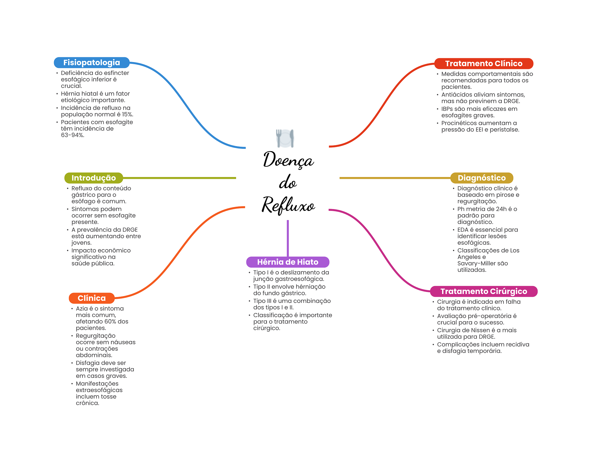 Fisiopatologia Tratamento Clínico Deficiência do esfíncter Medidas comportamentais são esofágico inferior é recomendadas para todos os crucial. pacientes. Hérnia hiatal é um fator Antiácidos aliviam sintomas, etiológico importante. mas não previnem a DRGE. Incidência de refluxo na IBPs são mais eficazes em população normal é 15%. esofagites graves. Pacientes com esofagite Procinéticos aumentam a têm incidência de pressão do EEI e peristalse. 63-94%. Doença Introdução do Diagnóstico Refluxo do conteúdo Diagnóstico clínico é gástrico para baseado em pirose e esôfago é comum. Refluxo regurgitação. Sintomas podem Ph metria de 24h é ocorrer sem esofagite padrão para presente. diagnóstico. A prevalência da DRGE EDA é essencial para está aumentando entre identificar lesões jovens. esofágicas. Impacto econômico Classificações de Los significativo na Angeles e saúde pública. Hérnia de Hiato Savary-Miller são Tipo é O deslizamento da utilizadas. junção gastroesofágica. Tipo envolve hérniação do fundo gástrico. Tratamento Cirúrgico Clínica Tipo III é uma combinação Cirurgia é indicada em falha Azia é sintoma dos tipos e II. do tratamento clínico. mais comum, Classificação é importante Avaliação pré-operatória é afetando 60% dos para O tratamento crucial para O sucesso. pacientes. cirúrgico. Cirurgia de Nissen é a mais Regurgitação utilizada para DRGE. ocorre sem náuseas Complicações incluem recidiva ou contrações e disfagia temporária. abdominais. Disfagia deve ser sempre investigada em casos graves. Manifestações extraesofágicas incluem tosse crônica.