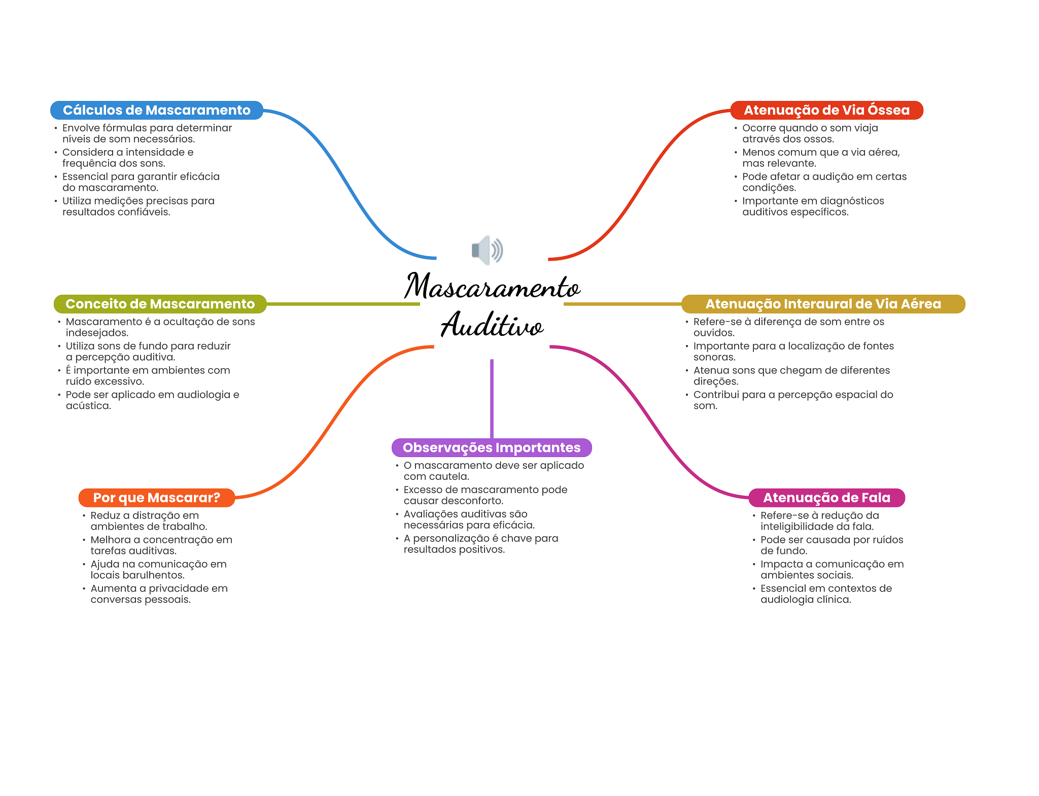 Cálculos de Mascaramento Atenuação de Via Óssea Envolve fórmulas para determinar Ocorre quando som viaja níveis de som necessários. através dos OSSOS. Considera a intensidade e Menos comum que a via aérea, frequência dos sons. mas relevante. Essencial para garantir eficácia Pode afetar a audição em certas do mascaramento. condições. Utiliza medições precisas para Importante em diagnósticos resultados confiáveis. auditivos específicos. Mascaramento Conceito de Mascaramento Atenuação Interaural de Via Aérea Mascaramento é a ocultação de sons Auditivo Refere-se à diferença de som entre os indesejados. ouvidos. Utiliza sons de fundo para reduzir Importante para a localização de fontes a percepção auditiva. sonoras. É importante em ambientes com Atenua sons que chegam de diferentes ruído excessivo. direções. Pode ser aplicado em audiologia e Contribui para a percepção espacial do acústica. som. Observações Importantes mascaramento deve ser aplicado com cautela. Excesso de mascaramento pode Por que Mascarar? causar desconforto. Atenuação de Fala Reduz a distração em Avaliações auditivas são Refere-se à redução da ambientes de trabalho. necessárias para eficácia. inteligibilidade da fala. Melhora a concentração em A personalização é chave para Pode ser causada por ruídos tarefas auditivas. resultados positivos. de fundo. Ajuda na comunicação em Impacta a comunicação em locais barulhentos. ambientes sociais. Aumenta a privacidade em Essencial em contextos de conversas pessoais. audiologia clínica.