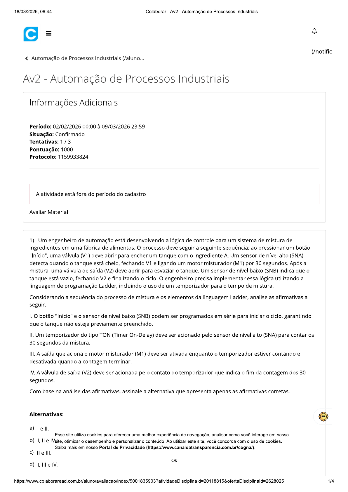 18/03/2026, 09:44 Colaborar Av2 Automação de Processos Industriais III (/notific18/03/2026, 09:44 Colaborar Av2 Automação de Processos Industriais e) I, II, III e IV. Alternativa assinalada 2) Em uma indústria química, a manutenção de um reator é uma atividade de alto risco e custo. Uma parada não programada para manutenção corretiva pode interromper a produção por dias. Para evitar isso, a empresa investiu em um sistema de automação que monitora continuamente a vibração e a temperatura dos mancais do motor que aciona o agitador do reator. Os dados são coletados e analisados por um software que utiliza algoritmos para identificar padrões que antecedem uma falha. Quando sistema detecta um aumento gradual na vibração que foge do padrão normal de operação, ele gera um alerta para a equipe de manutenção, permitindo que uma intervenção seja planejada e executada durante uma parada programada, antes que a falha catastrófica ocorra. tipo de estratégia de manutenção implementada pela indústria química, baseada no monitoramento contínuo e na análise de dados para prever falhas, é corretamente classificado como: Alternativas: a) Manutenção Corretiva, pois a ação só é tomada após a detecção de um sintoma de falha. b) Manutenção Preventiva, pois as intervenções são realizadas em intervalos de tempo fixos, independentemente da condição do equipamento. c) Manutenção Detectiva, focada exclusivamente em testar os sistemas de alarme e proteção do equipamento. Manutenção de Oportunidade, que consiste em realizar reparos somente quando equipamento já está parado d) por outro motivo. e) Manutenção Preditiva, pois se baseia na análise de dados em tempo real para prever a Alternativa assinalada degradação e determinar momento ideal para a intervenção. 3) Uma pequena empresa de manufatura deseja automatizar uma prensa para estampar peças metálicas. processo é simples: um operador posiciona a peça, afasta-se e pressiona dois botões simultaneamente (um para cada mão, como medida de segurança). A prensa então avança, estampa a peça por 5 segundos e recua. Para este projeto, a equipe de engenharia precisa escolher um Controlador Lógico Programável (CLP). As necessidades de entradas e saídas são fixas e bem definidas: três entradas digitais (botão 1, botão 2, sensor de prensa recuada) e duas saídas digitais (motor de avanço, motor de recuo). orçamento é limitado e não há previsão de expansão futura para este equipamento específico. A simplicidade na instalação e manutenção é um fator prioritário. Com base nas características do processo e nos requisitos do projeto da prensa, qual tipo de CLP seria o mais adequado para esta aplicação? Alternativas: Um CLP modular, pois permite a adição futura de módulos de comunicação em rede para integração com outros a) sistemas da fábrica. b) Um CLP compacto, pois integra em uma única unidade a CPU, a fonte de alimentação e Alternativa assinalada um número fixo de entradas e saídas, atendendo aos requisitos com menor custo. c) Um CLP de grande porte com alta capacidade de processamento, para garantir a execução precisa da temporização de 5 segundos. d) Um CLP modular, pois oferece maior flexibilidade para trocar a CPU por uma mais potente caso o processo se torne mais complexo. Esse site utiliza cookies para oferecer uma melhor experiência de navegação, analisar como você interage em nosso Um personalizar conteúdo Ao utilizar este site com de ssidade cookies de hardware e) mais em nosso Portal de Privacidade dedicado para controle. 2/418/03/2026, 09:44 Colaborar Av2 Automação de Processos Industriais 4) Uma indústria de cosméticos está automatizando seu processo de fabricação de emulsões, que envolve a mistura precisa de múltiplos ingredientes líquidos e em pó em um reator. processo é complexo e não se limita a uma sequência simples de ligar e desligar válvulas. CLP responsável pelo controle deve executar algoritmos para calcular a massa exata de cada componente com base em uma receita selecionada em uma IHM, corrigindo as quantidades em tempo real de acordo com a densidade do material, que varia com a temperatura. Além disso, o sistema deve executar laços de repetição (loops) para dosagens fracionadas, manipular vetores de dados (arrays) para armazenar os parâmetros de cada lote e gerar um relatório de produção com cálculos estatísticos ao final do processo. A equipe de engenharia de automação busca a linguagem de programação que ofereça maior flexibilidade e poder computacional para implementar essas tarefas. Considerando a complexidade da aplicação, que envolve cálculos matemáticos avançados, manipulação de estruturas de dados e algoritmos complexos, qual linguagem de programação, dentre as padronizadas pela norma IEC 61131-3, é a mais adequada para programar o CLP? Alternativas: A linguagem Ladder (LD), pois sua estrutura gráfica baseada em contatos e bobinas é ideal para a execução de a) cálculos matemáticos e manipulação de vetores de dados. b) A linguagem Grafcet (SFC), pois sua principal finalidade é a implementação de algoritmos de controle de processo e funções matemáticas complexas. A linguagem Texto Estruturado (ST), pois é uma linguagem de alto nível, com sintaxe c) similar a linguagens como o Pascal, projetada para tarefas que exigem algoritmos Alternativa assinalada complexos, laços condicionais e cálculos. Diagrama de Blocos de Função (FBD), pois é a linguagem mais eficiente para criar lógicas sequenciais que d) dependem de múltiplas receitas e parâmetros variáveis. A Lista de Instruções (IL), pois é a linguagem de mais baixo nível, o que a torna a mais simples e intuitiva para e) programadores implementarem funções de tratamento de dados. 5) Uma usina hidrelétrica opera com múltiplas turbinas e geradores distribuídos por uma grande área. A equipe de operação prec