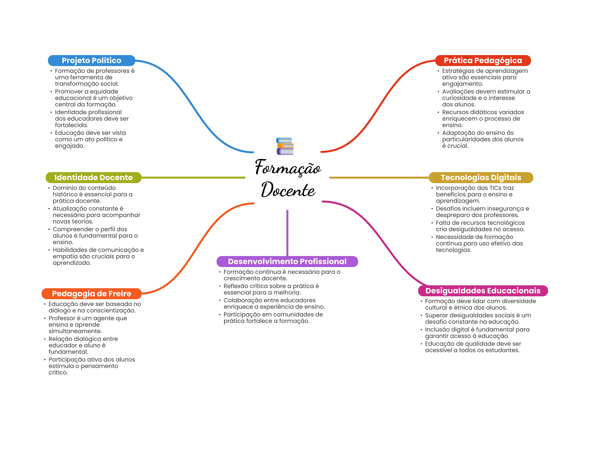 Projeto Político Prática Pedagógica Formação de professores é Estratégias de aprendizagem uma ferramenta de ativa são essenciais para transformação social. engajamento. Promover a equidade Avaliações devem estimular a educacional é um objetivo curiosidade e interesse central da formação. dos alunos. Identidade profissional Recursos didáticos variados dos educadores deve ser enriquecem O processo de fortalecida. ensino. Educação deve ser vista Adaptação do ensino às como um ato político e particularidades dos alunos engajado. é crucial. Formação Identidade Docente Tecnologias Digitais Domínio do conteúdo histórico é essencial para a Docente Incorporação das TICs traz benefícios para ensino e prática docente. aprendizagem. Atualização constante é Desafios incluem insegurança e necessária para acompanhar despreparo dos professores. novas teorias. Falta de recursos tecnológicos Compreender perfil dos cria desigualdades no acesso. alunos é fundamental para O Necessidade de formação ensino. contínua para uso efetivo das Habilidades de comunicação e tecnologias. empatia são cruciais para aprendizado. Desenvolvimento Profissional Formação contínua é necessária para O crescimento docente. Reflexão crítica sobre a prática é Pedagogia de Freire essencial para a melhoria. Desigualdades Educacionais Colaboração entre educadores Educação deve ser baseada no Formação deve lidar com diversidade enriquece a experiência de ensino. cultural e étnica dos alunos. diálogo e na conscientização. Participação em comunidades de Professor é um agente que Superar desigualdades sociais é um prática fortalece a formação. ensina e aprende desafio constante na educação. Inclusão digital é fundamental para Relação dialógica entre garantir acesso à educação. educador e aluno é Educação de qualidade deve ser fundamental. acessível a todos OS estudantes. Participação ativa dos alunos estimula pensamento crítico.