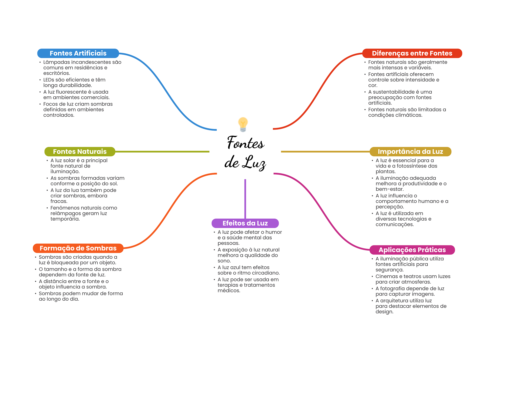 Fontes Artificiais Diferenças entre Fontes Lâmpadas incandescentes são Fontes naturais são geralmente comuns em residências e mais intensas e variáveis. escritórios. Fontes artificiais oferecem LEDs são eficientes e têm controle sobre intensidade e longa durabilidade. cor. A luz fluorescente é usada A é uma em ambientes comerciais. preocupação com fontes Focos de luz criam sombras artificiais. definidas em ambientes Fontes naturais são limitadas a controlados. condições climáticas. Fontes Fontes Naturais Importância da Luz A luz solar é a principal fonte natural de de Luz A luz é essencial para a vida e a fotossíntese das iluminação. plantas. As sombras formadas variam A iluminação adequada conforme a posição do sol. melhora a produtividade e A luz da lua também pode bem-estar. criar sombras, embora A luz influencia fracas. comportamento humano e a Fenômenos naturais como percepção. relâmpagos geram luz A luz é utilizada em temporária. diversas tecnologias e Efeitos da Luz comunicações. A luz pode afetar humor e a saúde mental das pessoas. Formação de Sombras A exposição à luz natural Aplicações Práticas Sombras são criadas quando a melhora a qualidade do luz é bloqueada por um objeto. sono. A iluminação pública utiliza tamanho e a forma da sombra A luz azul tem efeitos fontes artificiais para sobre ritmo circadiano. segurança. dependem da fonte de luz. Cinemas e teatros usam luzes A distância entre a fonte e A luz pode ser usada em para criar atmosferas. objeto influencia a sombra. terapias e tratamentos médicos. A fotografia depende de luz Sombras podem mudar de forma para capturar imagens. ao longo do dia. A arquitetura utiliza luz para destacar elementos de design.
