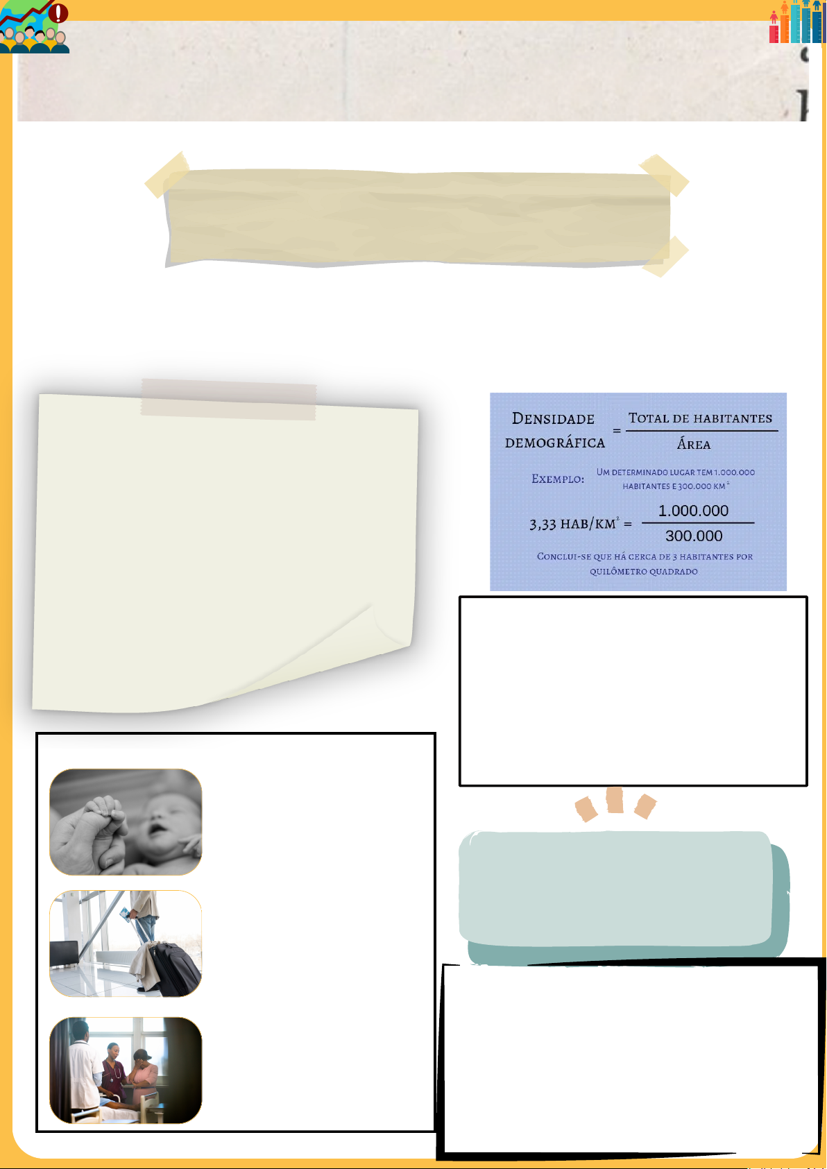 QUANTOS SOMOS? Atividade: A População do Brasil Nome do Aluno(a): _______________________________________ Data: ____/____/____ Professora: Juliana Fortunato Componente Curricular: Geografia De acordo com o Censo Demográfico 2022 do IBGE, a população brasileira é de 203.080.756 habitantes. Vamos descobrir como as pessoas se movimentam e mudam o Brasil? A população do Brasil está sempre mudando. Mais pessoas nascem, outras morrem e muitas se mudam de um lugar para outro. Onde Moram as Pessoas no Brasil? No Brasil, nem todo lugar tem a mesma quantidade de pessoas. Algumas cidades são cheias, outras têm poucas pessoas. A densidade demográfica é calculada dividindo a população total de uma região pela sua área total. O resultado é expresso em habitantes por quilômetro quadrado (hab/km²). Exemplo de como calcular a densidade demográfica. Por Que a População Muda? A população do Brasil muda por 3 motivos principais: NASCIMENTOS: Bebês que chegam! MORTES: Pessoas que nos deixam. MIGRAÇÕES: Pessoas que se mudam de um lugar para outro. Ligue as imagens às palavras corretas: NASCIMENTOS MIGRAÇÕES MORTES Migrar é Mudar de Lugar! Migração é quando as pessoas se mudam de um lugar para outro. Elas podem ir para outra cidade, outro estado ou até outro país. Complete as frases com as palavras do quadro: CASA - TRABALHO - PAÍS João saiu da sua ___________ na zona rural para ir trabalhar na cidade. Maria foi procurar um novo ______________ em outro estado. Algumas pessoas saem do Brasil para morar em outro _______________.