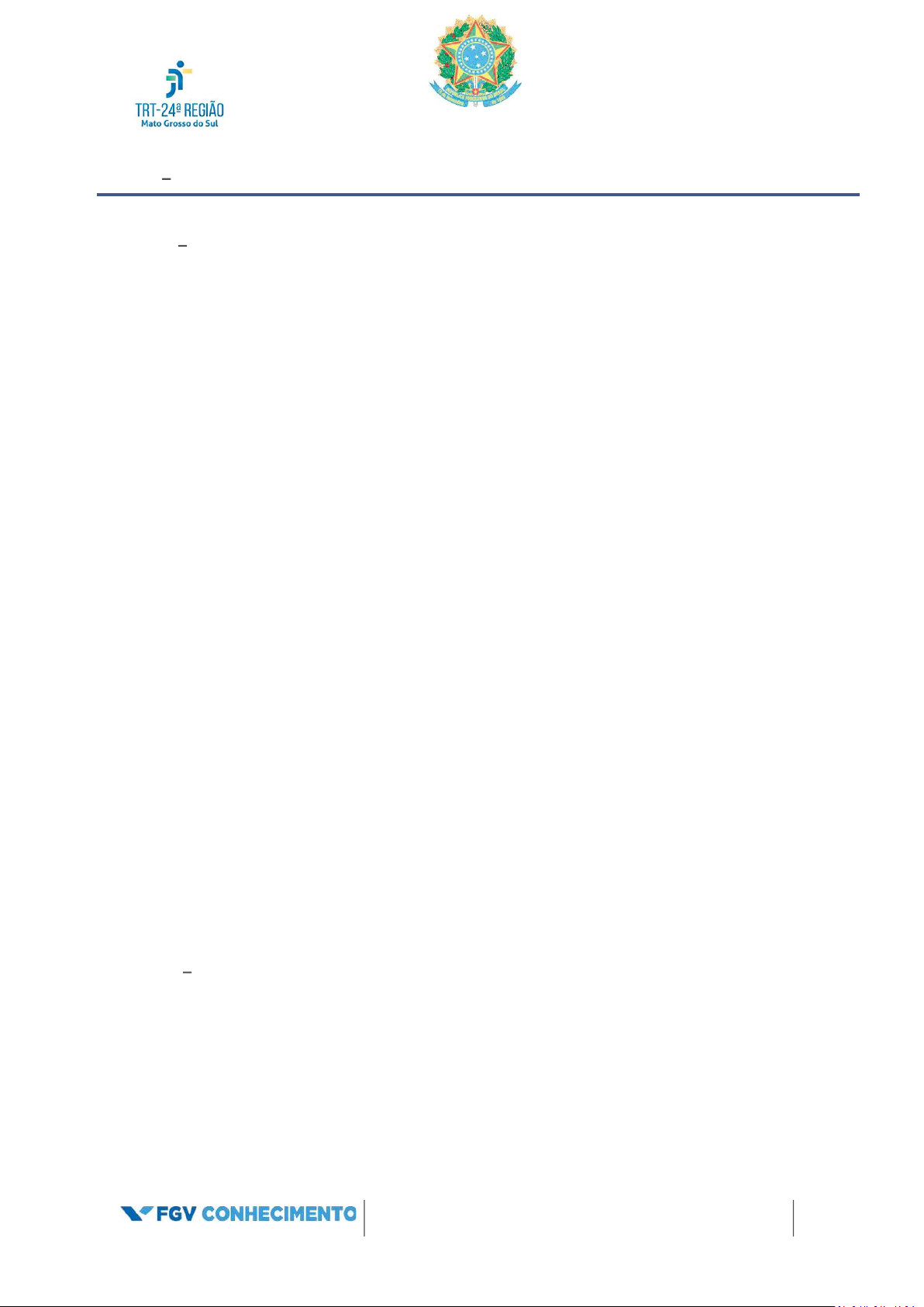 PODER JUDICIÁRIO JUSTIÇA DO TRABALHO TRIBUNAL REGIONAL DO TRABALHO DA 24ª REGIÃO TRIBUNAL REGIONAL DO TRABALHO DA 24ª REGIÃO | CONCURSO PÚBLICO 2024 35 ANEXO I CONTEÚDO PROGRAMÁTICO CARGOS DE NÍVEL SUPERIOR (ANALISTA JUDICIÁRIO) MÓDULO I CONHECIMENTOS BÁSICOS LÍNGUA PORTUGUESA 1. Interpretação e compreensão de texto. Organização estrutural dos textos. 2. Marcas de textualidade: coesão, coerência e intertextualidade. 3. Modos de organização discursiva: descrição, narração, exposição, argumentação e injunção; características específicas de cada modo. 4. Tipos textuais: informativo, publicitário, propagandístico, normativo, didático e divinatório; características específicas de cada tipo. Textos literários e não literários. 5. Tipologia da frase portuguesa. 6. Estrutura da frase portuguesa: operações de deslocamento, substituição, modificação e correção. Problemas estruturais das frases. Norma culta. Pontuação e sinais gráficos. Organização sintática das frases: termos e orações. Ordem direta e inversa. 7. Tipos de discurso. 8. Registros de linguagem. Funções da linguagem. 9. Elementos dos atos de comunicação. 10. Estrutura e formação de palavras. Formas de abreviação. 11. Classes de palavras; os aspectos morfológicos, sintáticos, semânticos e textuais de substantivos, adjetivos, artigos, numerais, pronomes, verbos, advérbios, conjunções e interjeições; os modalizadores. 12. Semântica: sentido próprio e figurado; antônimos, sinônimos, parônimos e hiperônimos. Polissemia e ambiguidade. Os dicionários: tipos; a organização de verbetes. 13. Vocabulário: neologismos, arcaísmos, estrangeirismos; latinismos. 14. Ortografia e acentuação gráfica. A crase. RACIOCÍNIO LÓGICO-MATEMÁTICO Lógica: proposições, conectivos, equivalências lógicas, quantificadores e predicados. Conjuntos e suas operações, diagramas. Números inteiros, racionais e reais e suas operações, porcentagem e juros. Proporcionalidade direta e inversa. Medidas de comprimento, área, volume, massa e tempo. Estrutura lógica de relações arbitrárias entre pessoas, lugares, objetos ou eventos fictícios; dedução de novas informações das relações fornecidas e avaliação das condições usadas para estabelecer a estrutura daquelas relações. Compreensão e análise da lógica de uma situação, utilizando as funções intelectuais: raciocínio verbal, raciocínio matemático, raciocínio sequencial, orientação espacial e temporal, formação de conceitos, discriminação de elementos. Compreensão de dados apresentados em gráficos e tabelas. Raciocínio lógico envolvendo problemas aritméticos, geométricos e matriciais. Problemas de contagem e noções de probabilidade. Geometria básica: ângulos, triângulos, polígonos, distâncias, proporcionalidade, perímetro e área. Noções de estatística: média, moda, mediana e desvio padrão. Plano cartesiano: sistema de coordenadas, distância. Problemas de lógica e raciocínio. MÓDULO II CONHECIMENTOS ESPECÍFICOS BÁSICOS (exceto área Judiciária) Legislação Institucional: 1. Estrutura e Funcionamento do Tribunal Regional do Trabalho da 24ª Região (TRT- MS): Composição e competências do TRT-MS: Estrutura organizacional, cargos e funções principais, competência jurisdicional e administrativa. Organização das Varas do Trabalho: Jurisdição e funcionamento das Varas do Trabalho no Estado do Mato Grosso do Sul. Regimento Interno do TRT-MS: Disposições gerais, procedimentos administrativos e jurisdicionais, normas de atuação dos órgãos colegiados e judicantes. Atribuições dos magistrados: Direitos, deveres e responsabilidades de desembargadores e juízes no âmbito do TRT-MS. 2. Estatuto dos Servidores Públicos Federais (Lei nº 8.112/1990): Regime Jurídico dos Servidores Públicos Federais: Abrangência e disposições gerais. Direitos e deveres dos servidores: Direitos funcionais e PODER JUDICIÁRIO JUSTIÇA DO TRABALHO TRIBUNAL REGIONAL DO TRABALHO DA 24ª REGIÃO TRIBUNAL REGIONAL DO TRABALHO DA 24ª REGIÃO | CONCURSO PÚBLICO 2024 39 categoria; categoria diferenciada; das convenções e dos acordos coletivos de trabalho. Do direito de greve; dos serviços essenciais. Da renúncia e transação. Do teletrabalho (Lei nº 13.467/2017). Dano moral nas relações de trabalho. Súmulas e Orientações da Jurisprudência uniformizada do Tribunal Superior do Trabalho sobre Direito do Trabalho. Súmulas Vinculantes do Supremo Tribunal Federal relativas ao Direito do Trabalho. Instruções e atos Normativos do TST em matéria de Direito do Trabalho. Reforma Trabalhista Lei 13.467, de 2017. Acidentes do Trabalho. Princípios gerais de responsabilidade civil trabalhista. Assédio moral e sexual. Princípios da igualdade e da não discriminação. Direito Processual do Trabalho: Da Justiça do Trabalho: organização e competência. Das Varas do Trabalho, dos Tribunais Regionais do Trabalho e do Tribunal Superior do Trabalho. Dos serviços auxiliares da Justiça do Trabalho: das secretarias das Varas do Trabalho; dos distribuidores; dos oficiais de justiça e oficiais de justiça avaliadores. Dos Peritos Judiciais: responsabilidade pelos honorários periciais, Gratuidade de Justiça. Do Ministério Público do Trabalho: organização e competência. Do processo judiciário do trabalho: princípios gerais do processo trabalhista (aplicação subsidiária do CPC). Prescrição e decadência. Prescrição intercorrente. Dos atos, termos e prazos processuais. Da distribuição. Do valor da causa no Processo do Trabalho; Das custas e emolumentos. Custas e emolumentos para a Fazenda Pública. Hipóteses de isenção. Das partes e procuradores; do jus postulandi; da substituição e representação processuais. Da representação da massa falida e das empresas em Recuperação judicial. Do litisconsórcio no Processo do Trabalho; da assistência judiciária; dos honor