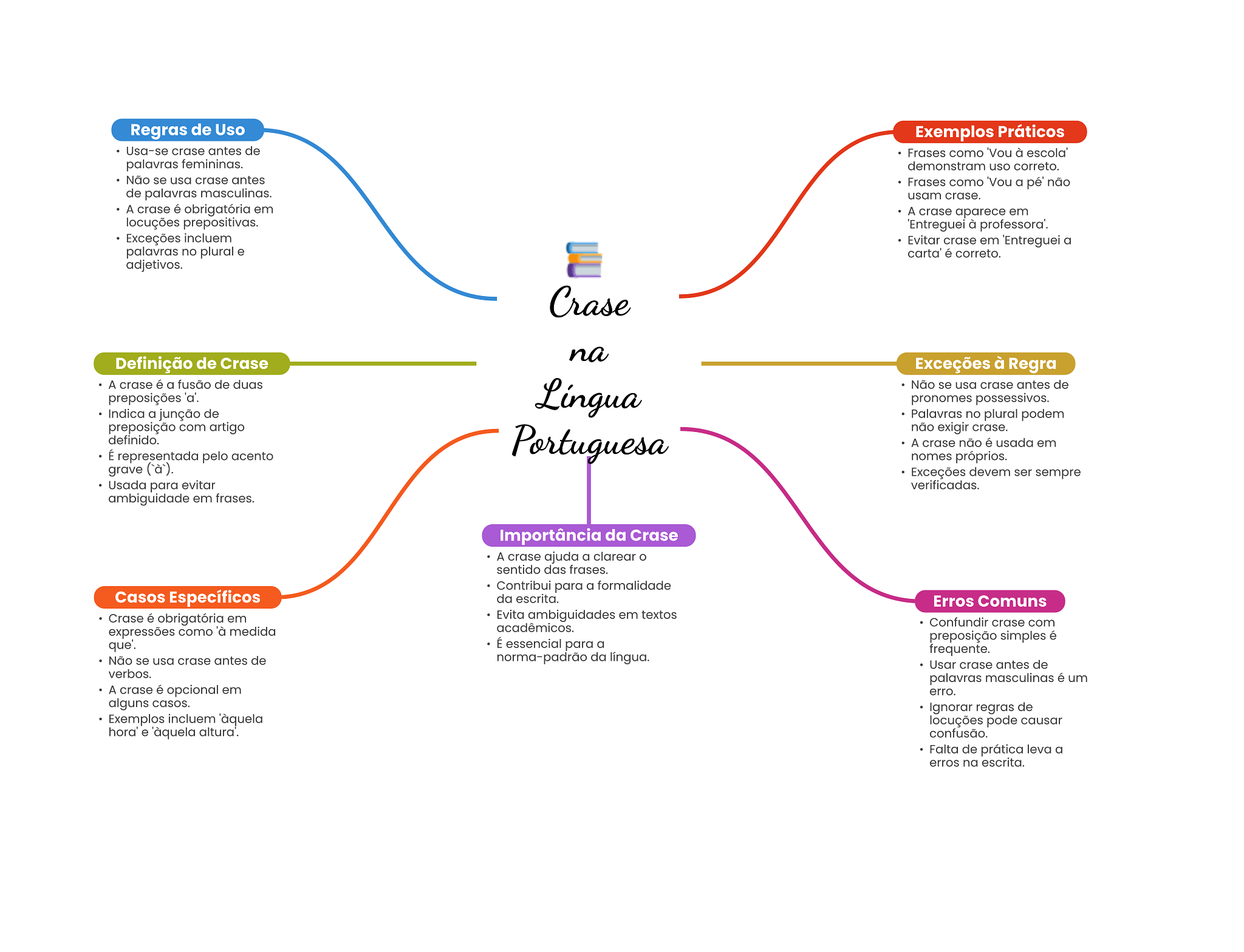 Regras de Uso Exemplos Práticos Usa-se crase antes de Frases como 'Vou à palavras femininas. demonstram uso correto. Não se usa crase antes Frases como Vou a pé' não de palavras masculinas. usam crase. A crase é obrigatória em A crase aparece em locuções prepositivas. à professora. Exceções incluem Evitar crase em a palavras no plural e carta' é correto. adjetivos. Crase na Definição de Crase Exceções à Regra A crase é a fusão de duas Língua Não se usa crase antes de preposições 'a'. pronomes possessivos. Indica a junção de Palavras no plural podem preposição com artigo não exigir crase. definido. É representada pelo acento Portuguesa A crase não é usada em nomes próprios. grave Exceções devem ser sempre Usada para evitar verificadas. ambiguidade em frases. Importância da Crase A crase ajuda a clarear sentido das frases. Contribui para a formalidade Casos Específicos da escrita. Erros Comuns Crase é obrigatória em Evita ambiguidades em textos expressões como 'à medida acadêmicos. Confundir crase com preposição simples é que'. É essencial para a frequente. Não se usa crase antes de norma-padrão da língua. Usar crase antes de verbos. palavras masculinas é um A crase é opcional em erro. alguns casos. Ignorar regras de Exemplos incluem locuções pode causar hora' e 'àquela confusão. Falta de prática leva a erros na escrita.