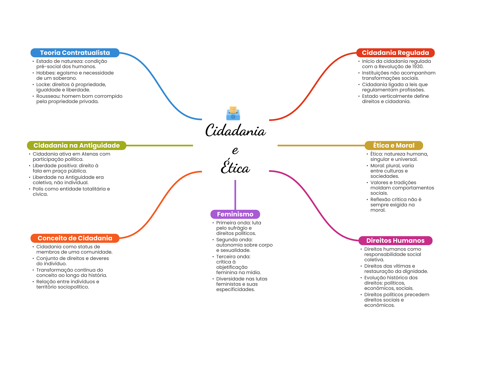 Teoria Contratualista Cidadania Regulada Estado de natureza: condição Início da cidadania regulada pré-social dos humanos. com a Revolução de 1930. Hobbes: egoísmo e necessidade Instituições não acompanham de um soberano. transformações sociais. Locke: direitos à propriedade, Cidadania ligada a leis que igualdade e liberdade. regulamentam profissões. Rousseau: homem bom corrompido Estado verticalmente define pela propriedade privada. direitos e cidadania. Cidadania Cidadania na Antiguidade Ética e Moral Cidadania ativa em Atenas com e Ética: natureza humana, participação política. Ética singular e universal. Liberdade positiva: direito à Moral: plural, varia fala em praça pública. entre culturas e Liberdade na Antiguidade era sociedades. coletiva, não individual. Valores e tradições Polis como entidade totalitária e moldam comportamentos cívica. sociais. Reflexão crítica não é sempre exigida na moral. Feminismo Primeira onda: luta pelo sufrágio e direitos políticos. Conceito de Cidadania Segunda onda: Direitos Humanos Cidadania como status de autonomia sobre corpo e sexualidade. Direitos humanos como membros de uma comunidade. Conjunto de direitos e deveres Terceira onda: responsabilidade social do indivíduo. crítica à coletiva. objetificação Direitos das vítimas e Transformação contínua do feminina na mídia. restauração da dignidade. conceito ao longo da história. Diversidade nas lutas Evolução histórica dos Relação entre indivíduos e feministas e suas direitos: políticos, território sociopolítico. especificidades. econômicos, sociais. Direitos políticos precedem direitos sociais e econômicos.