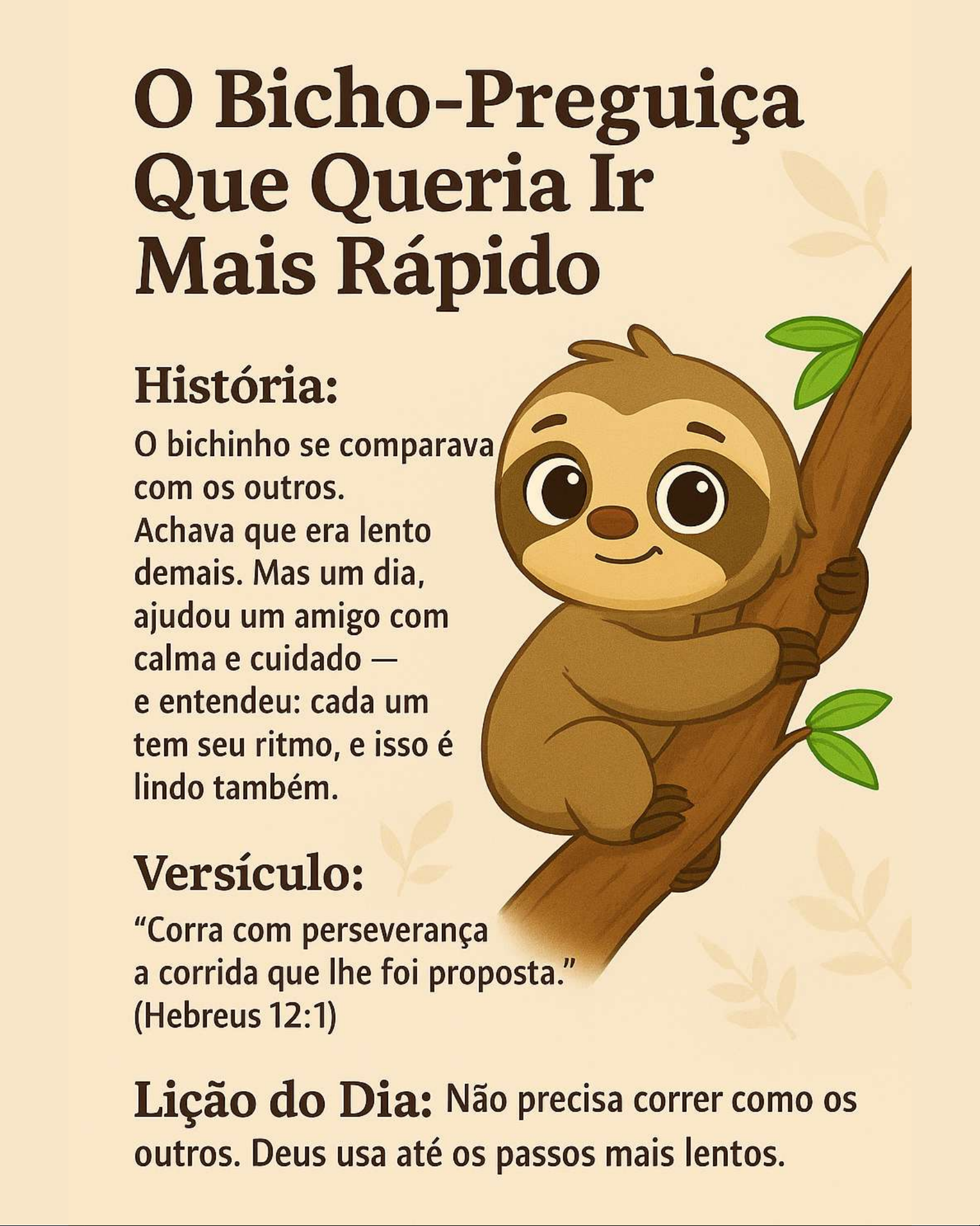 presente - mas empatia é o que nos aproxima. "Sejam fortes e corajosos." (Josué 1:9) Lição do Dia: Sua força é um presente use com amor e coragem. O Tubarão Que Queria Ser Legal Deus te vê — e te acha maravilhosa. 📖 “Não se cansem de fazer o bem.” Lição do Dia: Com Deus, você é capaz de muito mais do que pensa. A Foca Que Tinha Vergonha de Cair História: A focazinha vivia tentando equilibrar a bola no nariz, mas sempre deixava cair. Quando errava, todos riam - e ela queria sumir. Até que um dia, um filhotinho aplaudiu e disse: "Você não desistiu!" E foi ali que ela entendeu: tentar de novo é mais bonito do que acertar sempre Versículo: "Sete vezes cairá o justo e se levantará." (Provérbios 24:16) Lição do dia Errar faz parte — o importante é levantar e continuar.