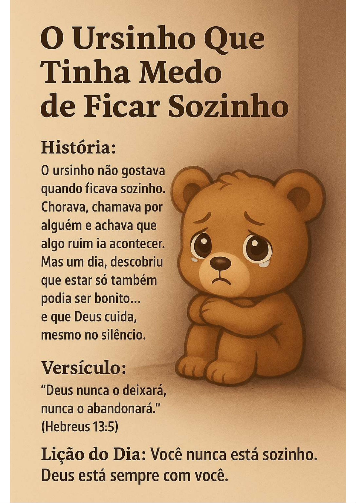 Ursinho Que Tinha Medo de Ficar Sozinho História: 0 ursinho não gostava quando ficava sozinho. Chorava, chamava por alguém e achava que algo ruim ia acontecer. Mas um dia, descobriu que estar só também podia ser bonito e que Deus cuida, mesmo no silêncio. Versículo: "Deus nunca deixará, nunca abandonará." (Hebreus 13:5) Lição do Dia: Você nunca está sozinho. Deus está sempre com você.Lobinho Orgulhoso História: lobinho queria mostrar que dava conta de tudo sozinho. Carregavá mais peso do que aguentava, mas nunca pedia ajuda. Um dia, cansado, caiu no chão... e descobriu que dividir fardo deixava caminhada mais leve. Versículo: "Levem os fardos pesados uns dos outros." (Gálatas 6:2) Lição do Dia: Pedir ajuda não é sinal de fraqueza. É prova de sabedoria e humildade.A Meia Que Tinha Medo de Errar História: A meinha queria ser perfeita. Morria de medo de escorregar ou furar. Um dia, caiu no chão e chorou. Mas ali, ouviu baixinho: "Mesmo assim, eu ainda te amo." E entendeu... errar faz parte de aprender. Versículo: meu poder se aperfeiçoa na fraqueza." (2 Corintios 12:9) Lição do Dia: Não tenha medo de errar. É assim que você cresce.Ratinho Bagunceiro História: ratinho deixava tudo espalhado: brinquedos, livros e até comida. Depois não achava nada e ficava bravo. Um dia, percebeu que arrumar não era chato, mas um jeito de cuidar do que era seu. Versículo: "Tudo deve ser feito com decência e ordem." (1 Corintios 14:40) Lição do Dia: Organizar as coisas é também organizar coração.Espelhinho Que Só Via Defeitos História: espelhinho se achava felo. Só enxergava suas manchas e riscos. Um dia, uma criança sorriu diante dele... e ele percebeu que refletir amor era mais bonito do que parecer perfeito. Versículo: Senhor não vé como homem vê." (1 Samuel 16:7) Lição do Dia: Você é mais do que aparência. que importa é que você rflete.A Corujinha Que Só Queria Ter Razão História: A corujinha sempre queria estar certa. Discutia, interrom- pia e não ouvia ninguém. Um dia, percebeu que ouvir podia ensinar mais do que falar. E entendeu que sabedoria também é saber calar. Versículo: "Seja pronto para ouvir e tardio para falar." (Tiago 1:19) Lição do Dia: Ouvir os outros é um jeito de crescer em sabedoriaria.Cisne Que Se Comparava Demais História: cisne vivia olhando os outros: queria as penas do pavão, canto do rouxinol, a força do leão. Mas um dia, ao ver seu reflexo na água, percebeu que já carregava uma beleza única. Versículo: "Eu Te louvo, porque me fizeste de modo especíal e admirável. (Salmo 139:14) Lição do Dia: Comparar tira a alegria. Valorize quem você é, do jeitinho que foiMacaquinho Que Só Queria Telinha História: macaquinho passava horas olhando a telinha. Esquecia de brincar, correr e até de conversar. Um dia, a bateria acabou... e ele descobriu que brincar de verdade era muito mais divertido. Versículo: "Há tempo para todo propósito debaixo do céu." (Eclesiastes 3:1) Lição do Dia: A telinha pode esperar. que vale mesmo é viver momento de verdade.Gatinho Que Fugiu do Banho História: Mingau adorava brincar no quintal. mas sempre corria para se esconder quando era hora do banho. Um dia, percebeu que ficar limpinho também podia ser gostoso. Versículo: MSe lavados forem os pecados, eles se tornarão brancos como a neve. (Isaías 1:18) Lição do Dia: Cuidar do corpo é um jeito de cuidar de si com amor.A Raposinha Mandona História: A raposinha queria mandar em tudo: no jogo, na fila, até na conversa. Mas um dia, ficou sozinha e percebeu que amigos não se controlam, se conquistam com carinho. Versículo: "Quem quiser ser maior, que sirva aos outros." (Mateus 23:11) Lição do Dia: Ser líder é cuidar com amor, não impor própria vontade.Porquinho Que Voltou a Sorrir História: porquinho ficou triste porque de- rrubou bolo que sua mãe havia feito. Achou que ela ficaria brava e não quis sair do quarto. Mas a mãe entrou, deu um abraço e disse que amava mesmo assim. Ele percebeu que amor é mais forte que os erros. Versículo: amor nunca se acaba." (1 Corintíos 13:8 - NTLH) Lição do Dia: amor de Deus é maior que nossos erros.Beija-Flor Que Agradeceu a Chuva História: beija-flor ficou triste porque a chuva não deixava ele visitar as flores. Mas, quando sol voltou, percebeu que as flores estavam cheias de néctar. Ele entendeu que a chuva tambêm é bênção. Versículo: "Ele envia a chuva e faz crescer a plantação." (Mateus 15:45 - NTLH) Lição do Dia: Tudo que Deus faz tem um propósito, até a chuva nos dias cinzentos.A Tartaruga Que Não Desistiu da Corrida História: A tartaruga começou a corrida com muito mais rápidos. Todos riram dela, mas ela continuou passo a passo. Chegou ao final e descobriu que perserverar é mais importante que ser râpido. Versículo: "Corram de tal modo que alcancem prêmio." (1 Coríntios 9:24 - NTLH) Lição do Dia: Com paciência e firmeza, Deus nos ajuda a completar a corrida da vida.Esquilo Que Aqueceu Corações História: esquilo percebeu que tinha mais nozes do que precisava para inverno. Ao ver outros animais com fome e frio, decidiu compartilhar. Ele descobriu que um gesto de amor aquece mais que qualquer cobertor e que ajudar espalha a bondade de Deus pelo mundo. Versículo: "Repartam com os que vocês têm." (Hebreus 13:16 - NTLH) Lição do Dia: A generosidade enche a alma de alegria e deixa coração mais cheio que qualquer despensa.A Galinha Que Protegeu Seus Pintinhos História: A galinha viu uma sombra de gavião no céu. Rapidamente chamou seus pintinhos e os escondeu debaixo das asas. Eles ficaram seguros até perigo passar. Ela sabia que proteger é um ato de amor. Versículo: "Ele cobrirá com as suas penas, e debaixo das suas asas você estará seguro." (Salmo 91:4 - NTLH) Lição do Dia: Deus também nos protege debaixo de Suas asas.Coelhinho Que Dividiu Sua Toca História: coelhinho tinha uma toca quentinha e cheia de palha macia, Em