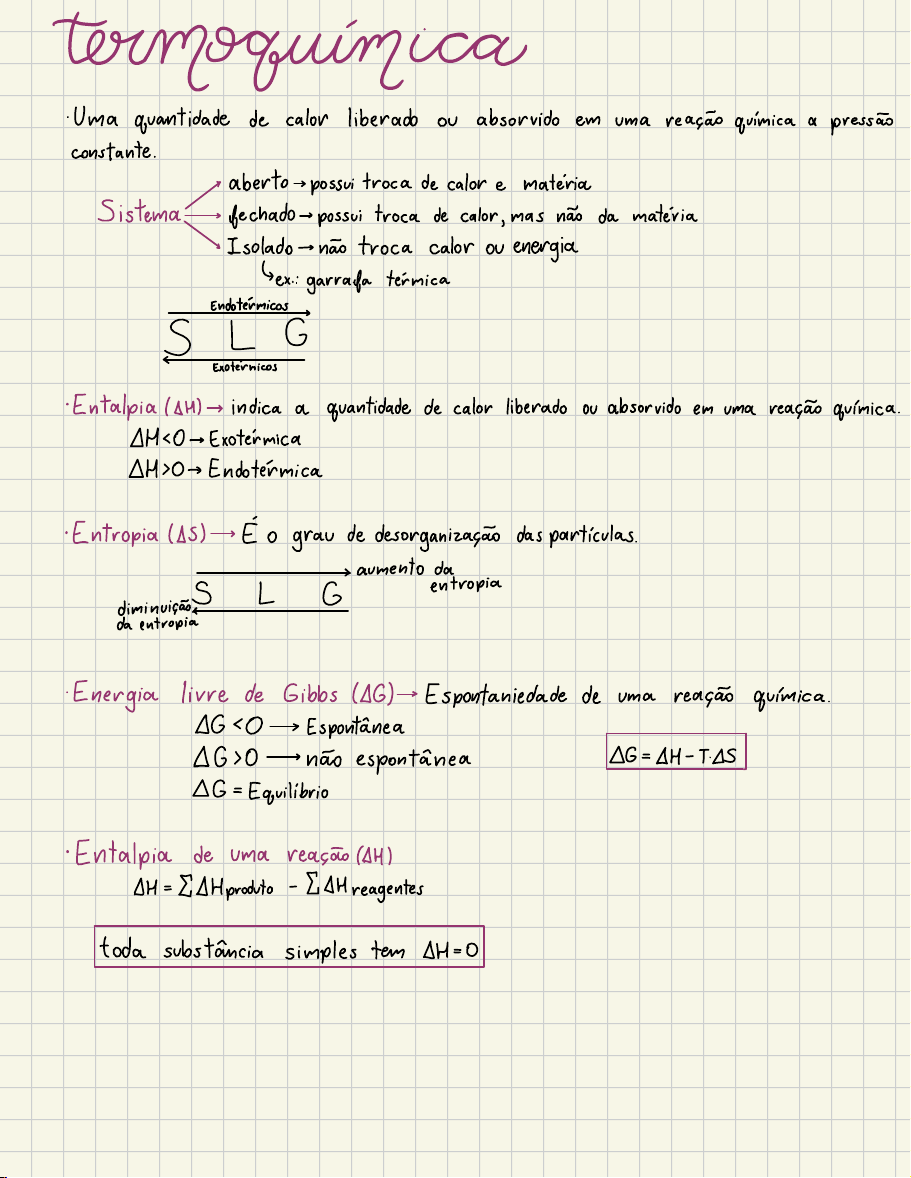 termoquímica Uma quantidade de calor liberado ou absorvido em uma reação química a pressão constante. > aberto , possui troca de calor e matéria Sistema · fechado , possui troca de calor , mas não da matéria ~ Isolado, não troca calor or energia Sex garrafa térmica Endotérmicos > SLG > Exotérmicos · Entalpia (AH) s indica a quantidade de calor liberado ou absorvido em uma reação química . H aumento da entropiaSLG diminuição da entropia · Energia livre de Gibbs (AG) - Espontaniedade de uma reação química. AG10 > Espontânea G = SH - T.JS . 160:não espontânea G = Equilibrio · Entalpia de uma reação (DH) IH = &AHproduto - FAH reagentes toda substância simples tem AH = 0