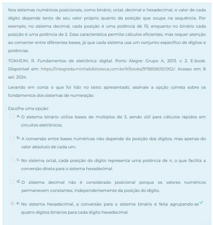 Nos sistemas numéricos posicionais, como binário, octal, decimal e hexadecimal, O valor de cada dígito depende tanto de seu valor próprio quanto da posição que ocupa na sequência. Por exemplo, no sistema decimal, cada posição é uma potência de 10, enquanto no binário cada posição é uma potência de 2. Essa característica permite cálculos eficientes, mas requer atenção ao converter entre diferentes bases, já que cada sistema usa um conjunto específico de dígitos e potências. TOKHEIM, R. Fundamentos de eletrônica digital. Porto Alegre: Grupo A, 2013. V. 2. E-book. Disponível em: em: 8 set. 2024. Levando em conta O que foi lido no texto apresentado, assinale a opção correta sobre fundamentos dos sistemas de numeração. Escolha uma opção: a. O sistema binário utiliza bases de múltiplos de 3, sendo útil para cálculos rápidos em circuitos eletrônicos. b. A conversão entre bases numéricas não depende da posição dos dígitos, mas apenas do valor absoluto de cada um. C. No sistema octal, cada posição do dígito representa uma potência de 4, O que facilita a conversão direta para sistema hexadecimal. d. O sistema decimal não é considerado posicional porque valores numéricos permanecem constantes, da posição do dígito. e. No sistema hexadecimal, a conversão para sistema binário é feita agrupando-se quatro dígitos binários para cada dígito hexadecimal.