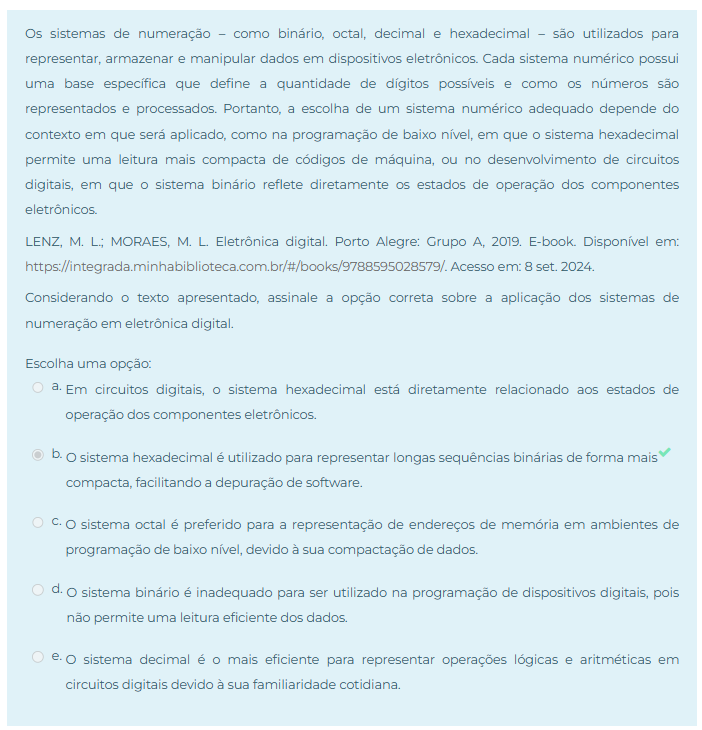 Os sistemas de numeração como binário, octal, decimal e hexadecimal são utilizados para representar, armazenar e manipular dados em dispositivos eletrônicos. Cada sistema numérico possui uma base específica que define a quantidade de dígitos e como números são representados e processados. Portanto, a escolha de um sistema numérico adequado depende do contexto em que será aplicado, como na programação de baixo nível, em que O sistema hexadecimal permite uma leitura mais compacta de de máquina, ou no desenvolvimento de circuitos digitais, em que O sistema binário reflete diretamente estados de operação dos componentes eletrônicos. LENZ, M. L.; MORAES, M. L. Eletrônica digital. Porto Alegre: Grupo A, 2019. Disponível em: em: 8 set. 2024. Considerando O texto apresentado, assinale a opção correta sobre a aplicação dos sistemas de numeração em eletrônica digital. Escolha uma opção: a. Em circuitos digitais, O sistema hexadecimal está diretamente relacionado aos estados de operação dos componentes eletrônicos. b. O sistema hexadecimal é utilizado para representar longas sequências binárias de forma mais compacta, facilitando a depuração de software. C. O sistema octal é preferido para a representação de endereços de em ambientes de programação de baixo devido à sua compactação de dados. d. O sistema é inadequado para ser utilizado na programação de dispositivos digitais, pois não permite uma leitura eficiente dos dados. e. O sistema decimal é O mais eficiente para representar operações lógicas e aritméticas em circuitos digitais devido à sua familiaridade cotidiana.