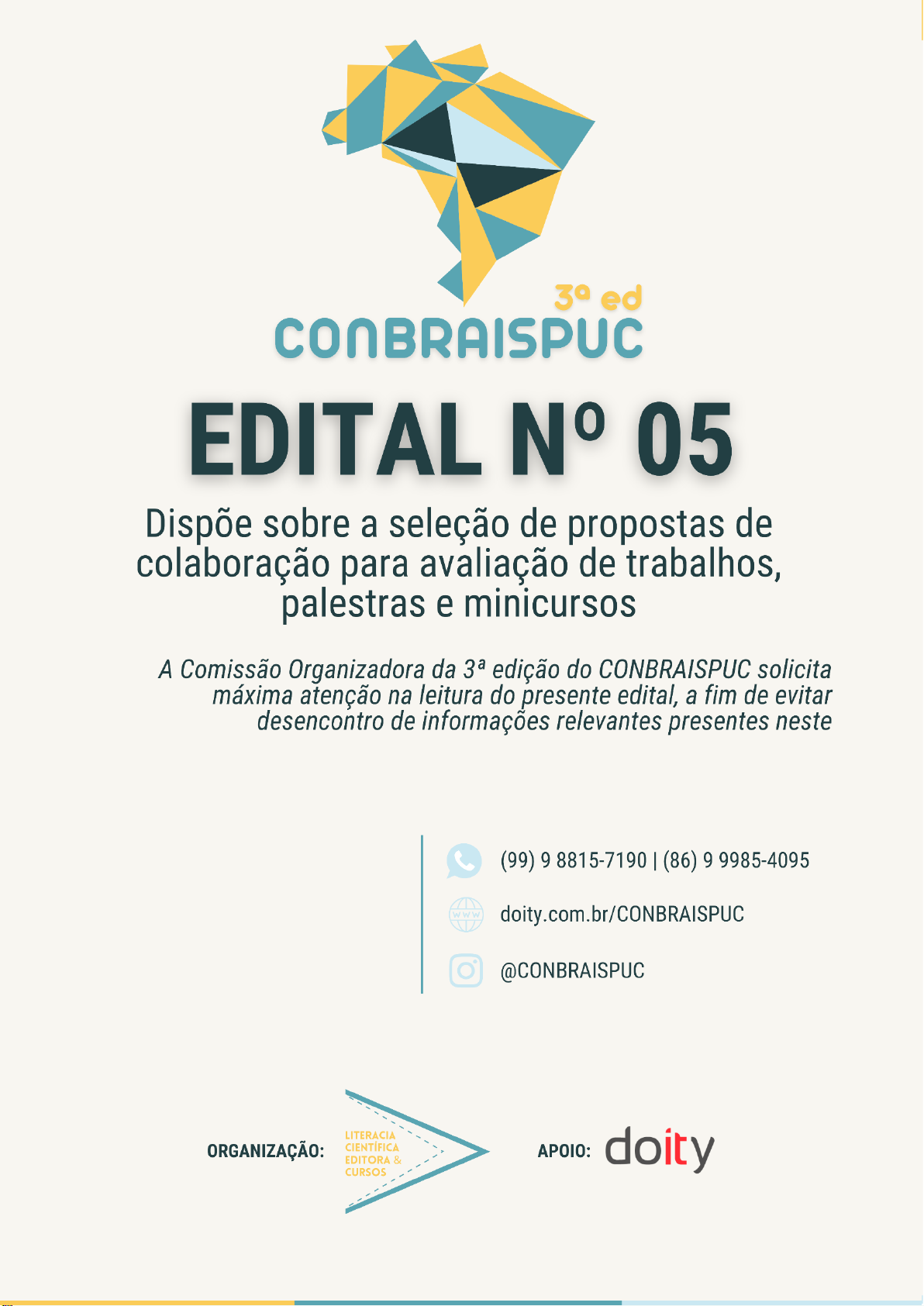 EDITAL NORMATIVO PARA COLABORAÇÃO NÃO REMUNERADA NO CONGRESSO BRASILEIRO INTEGRADO EM SAÚDE PÚBLICA E COLETIVA (CONBRAISPUC) - 3ª EDIÇÃO As Comissões Científica e de Programação do CONGRESSO BRASILEIRO INTEGRADO EM SAÚDE PÚBLICA E COLETIVA (CONBRAISPUC) - 3ª EDIÇÃO, com o tema “Produção do Cuidado, Redes de Atenção e Integralidade”, torna público o edital N° 05/2026, que dispõe sobre a seleção de propostas de colaboração para avaliação de trabalhos, palestras, minicursos e mesas-redondas no CONBRAISPUC - 3ª EDIÇÃO, que será realizado em 22 de agosto de 2026 por meio de plataforma digital. 1. DAS ATIVIDADES 1.1 O proponente poderá colaborar com o CONBRAISPUC - 3ª EDIÇÃO nas seguintes atividades: 1.1.1 Avaliação de trabalhos científicos (resumos simples e expandidos e capítulos); 1.1.2 Palestra; 1.1.3 Minicurso; 2. DA SUBMISSÃO DE PROPOSTAS 2.1 A submissão de propostas será por meio do endereço eletrônico cientificaconbraispuc@gmail.com e se encerrará às 23:59h do dia 01 de julho de 2026. 2.2 Somente serão aceitas propostas de indivíduos que já tenham concluído curso superior (bacharelado, licenciatura ou tecnólogo). 2.3 Os autores das propostas selecionadas terão ISENÇÃO na taxa de inscrição no evento. Contudo, aqueles proponentes que se inscreverem de maneira paga no evento antes do resultado da seleção não terão estorno do valor investido. 2.4 A isenção da taxa de inscrição no evento dá direito à submissão de resumos simples e expandidos e publicação de tais resumos nos anais do CONBRAISPUC - 3ª EDIÇÃO, caso estes sejam aceitos. A isenção NÃO cobre a taxa de publicação de capítulos, haja vista os custos com editoração, diagramação, manutenção da Editora e despesas com o DOI individual do capítulo. Se for do interesse do colaborador publicar capítulo, este deve efetuar o pagamento da taxa de publicação estabelecida no edital Nº 04/2026 do CONBRAISPUC - 3ª EDIÇÃO. 2.5 As propostas inscritas devem, OBRIGATORIAMENTE, estar em convergência com o tema central do CONBRAISPUC - 3ª EDIÇÃO: “Produção do Cuidado, Redes de Atenção e Integralidade”. 2.6 As propostas devem também estar de acordo com algum dos eixos temáticos do CONBRAISPUC - 3ª EDIÇÃO, a saber: 2.6.1 Produção do Cuidado e Práticas em Saúde: abrange estudos e experiências relacionadas aos modos de produzir cuidado nos diferentes pontos da rede, considerando abordagens clínicas, coletivas, territoriais e centradas na pessoa, família e comunidade. 2.6.2 Redes de Atenção à Saúde e Integração do Cuidado: destinado a trabalhos que discutam a organização, funcionamento e integração das Redes de Atenção à Saúde (RAS), com foco na continuidade, coordenação e integralidade do cuidado. 2.6.3 Integralidade, Equidade e Determinantes Sociais da Saúde: reúne produções que abordem a integralidade do cuidado articulada à equidade, aos determinantes sociais da saúde e às necessidades de diferentes grupos populacionais. 2.6.4 Modelos de Atenção, Linhas de Cuidado e Redes Temáticas: focaliza análises e experiências sobre modelos assistenciais e linhas de cuidado em redes temáticas, considerando diferentes condições e agravos à saúde. 2.6.5 Trabalho em Saúde, Educação Permanente e Produção do Cuidado: direcionado a estudos que discutam o trabalho em saúde, os processos formativos e a educação permanente como elementos estruturantes da produção do cuidado. 2.6.6 Gestão, Planejamento e Avaliação das Redes de Atenção: abrange análises sobre gestão, planejamento, monitoramento e avaliação das redes e serviços de saúde, com foco na qualificação da integralidade do cuidado. 2.6.7 Tecnologias, Inovação e Informação na Produção do Cuidado: contempla estudos e experiências sobre o uso de tecnologias duras, leves-duras e leves, inovação organizacional e sistemas de informação no apoio à integralidade do cuidado. 2.6.8 Participação Social, Controle Social e Produção do Cuidado: reúne trabalhos que discutem o papel da participação social e do controle social na qualificação do cuidado e das redes de atenção. 2.6.9 Transversalidades: reúne atividades que abordem temas transversais, interseccionais e emergentes que perpassam a produção do cuidado, a organização das redes de atenção e a efetivação da integralidade em saúde. Acolhe produções que contribuam para ampliar o olhar sobre a integralidade do cuidado e fortalecer respostas mais equitativas e resolutivas no âmbito da saúde pública e coletiva mailto:cientificaconbraispuc@gmail.com 3. DAS PROPOSTAS PARA AVALIAÇÃO DE RESUMOS E CAPÍTULOS 3.1 Para se inscrever o proponente deve enviar sua proposta ao endereço cientificaconbraispuc@gmail.com anexando o CURRÍCULO LATTES ATUALIZADO NOS ÚLTIMOS TRÊS MESES em formato .pdf e as seguintes informações no corpo do e- mail: 3.1.1 NOME COMPLETO; 3.1.2 CELULAR (preferencialmente WhatsApp); 3.1.3 MUNICÍPIO DE RESIDÊNCIA + ESTADO; 3.1.4 PROFISSÃO; 3.1.5 TITULAÇÃO (graduado, especialista, mestre, doutor ou pós-graduando); 3.1.6 AFILIAÇÃO INSTITUCIONAL (instituição a qual está ou esteve vinculado recentemente); 3.1.7 EIXO TEMÁTICO DE PREFERÊNCIA (vide item 2.6 deste edital); 3.1.8 EXPERIÊNCIA COM AVALIAÇÃO DE TRABALHOS EM EVENTO? (Em caso afirmativo, listar quais); 3.1.9 ARTIGOS COMPLETOS PUBLICADOS EM PERIÓDICOS CIENTÍFICOS? (Em caso afirmativo, listar principais produções recentes). 3.2 Com relação ao envio do e-mail, o assunto/título deve ser “PROPOSTA - ATIVIDADE REQUERIDA”. Exemplo: “PROPOSTA - AVALIAÇÃO DE TRABALHOS CIENTÍFICOS”. 3.3 Proponentes que enviarem e-mails com informações incompletas serão desclassificados. Portanto, atente-se ao item 3.1 e seus subitens. 3.4 Mesmo com a indicação do eixo temático de preferência (subitem 3.1.7) para avaliação de resumos e capítulos, o proponente que for selecionado pod
