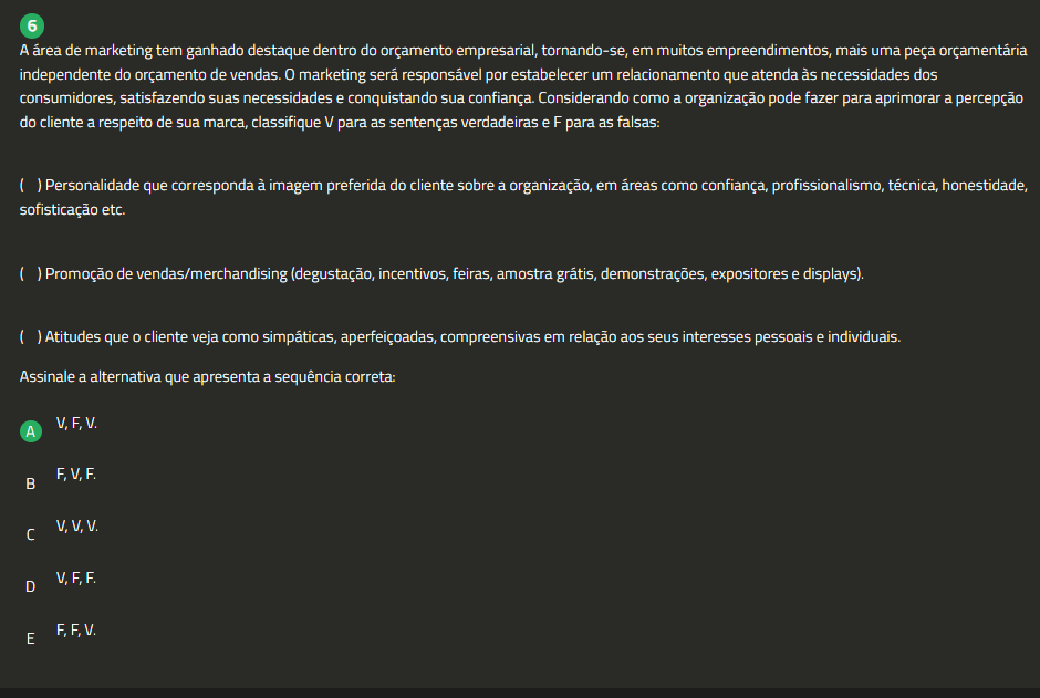 6 A área de marketing tem ganhado destaque dentro do orçamento empresarial, tornando-se, em muitos empreendimentos, mais uma peça orçamentária independente do orçamento de vendas. 0 marketing será responsável por estabelecer um relacionamento que atenda às necessidades dos consumidores, satisfazendo suas necessidades e conquistando sua confiança. Considerando como a organização pode fazer para aprimorar a percepção do cliente a respeito de sua marca, classifique V para as sentenças verdadeiras eF para as falsas: ( ) Personalidade que corresponda à imagem preferida do cliente sobre a organização, em áreas como confiança, profissionalismo, técnica, honestidade, sofisticação etc. Promoção de vendas/merchandising (degustação, incentivos, feiras, amostra grátis, demonstrações, expositores e displays). Atitudes que cliente veja como simpáticas, aperfeiçoadas, compreensivas em relação aos seus interesses pessoais e individuais. Assinale a alternativa que apresenta a sequência correta: A V,F,V. F,V,F. V,F,F. D F,F,V. E
