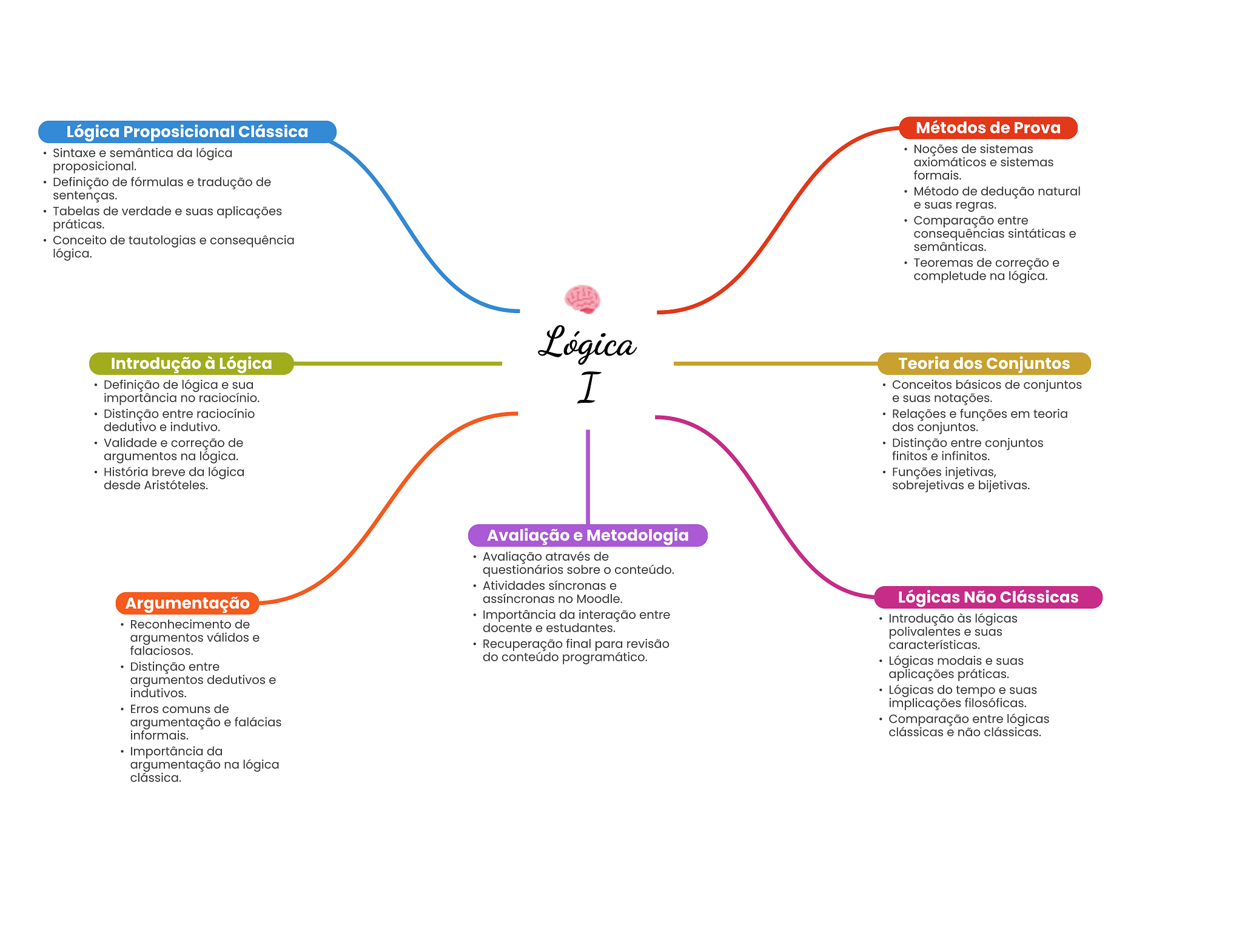 Lógica Proposicional Clássica Métodos de Prova Sintaxe e semântica da lógica Noções de sistemas proposicional. axiomáticos e sistemas formais. Definição de fórmulas e tradução de sentenças. Método de dedução natural Tabelas de verdade e suas aplicações e suas regras. práticas. Comparação entre Conceito de tautologias e consequência consequências sintáticas e semânticas. lógica. Teoremas de correção e completude na lógica. Lógica Introdução à Lógica Teoria dos Conjuntos Definição de lógica e sua I Conceitos básicos de conjuntos importância no raciocínio. e suas notações. Distinção entre raciocínio Relações e funções em teoria dedutivo e indutivo. dos conjuntos. Validade e correção de Distinção entre conjuntos argumentos na lógica. finitos e infinitos. História breve da lógica Funções injetivas, desde Aristóteles. sobrejetivas e bijetivas. Avaliação e Metodologia Avaliação através de questionários sobre conteúdo. Atividades síncronas e Argumentação assíncronas no Moodle. Lógicas Não Clássicas Importância da interação entre Reconhecimento de Introdução às lógicas docente e estudantes. argumentos válidos e polivalentes e suas falaciosos. Recuperação final para revisão características. do conteúdo programático. Distinção entre Lógicas modais e suas argumentos dedutivos e aplicações práticas. indutivos. Lógicas do tempo e suas Erros comuns de implicações filosóficas. argumentação e falácias Comparação entre lógicas informais. clássicas e não clássicas. Importância da argumentação na lógica clássica.