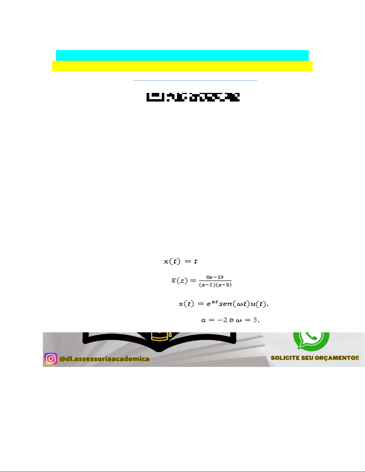 MAPA - SINAIS E SISTEMAS LINEARES - 51_2026 Assessoria nos seus TRABALHOS entre em contato com a DL ASSESSORIA E-mail: assessoriaacademicadl@gmail.com · (15) 99143-3322 QUESTÃO 1 A disciplina de Sinais e Sistemas Lineares está presente em diversos aspectos do nosso cotidiano. Por meio dela, é possível extrair informações da natureza — seja a partir de um sinal analógico ou digital —, processá-las e utilizá-las de forma eficiente. Um exemplo simples é a comunicação entre duas pessoas, que ocorre por meio de sinais de voz, seja em uma conversa presencial ou através de telefones e dispositivos conectados à internet. Na verdade, os sinais e sistemas estão presentes em praticamente todos os ambientes em que vivemos. No contexto da engenharia, sistemas de modulação e transmissão de sinais — como circuitos eletrônicos — são frequentemente modelados por equações diferenciais. A solução dessas equações descreve o comportamento dinâmico do sistema. Para simplificar sua resolução, utiliza-se a transformada, uma ferramenta matemática que converte equações diferenciais em equações algébricas, facilitando a análise e o projeto de circuitos. Como visto em aula, as aplicações desses conceitos são vastas, abrangendo áreas como telecomunicações, processamento de imagens, sistemas médicos e muitas outras, demonstrando a importância fundamental dos sinais e sistemas lineares na tecnologia moderna. 1) Calcule a transformada de Laplace de e demonstre todo o equacionamento, passo a passo. 2) Calcule a transformada Z inversa do sinal e demonstre todo o equacionamento, passo a passo. 3) Calcule a transformada de Laplace do sinal . A partir do resultado da transformada de Laplace do sinal, encontre a Função de Transferência de um sistema de malha fechada unitário (ganho =1), sendo . 23 Bons estudos!! image0.wmf image5.wmf image1.wmf image2.wmf image3.wmf image4.wmf