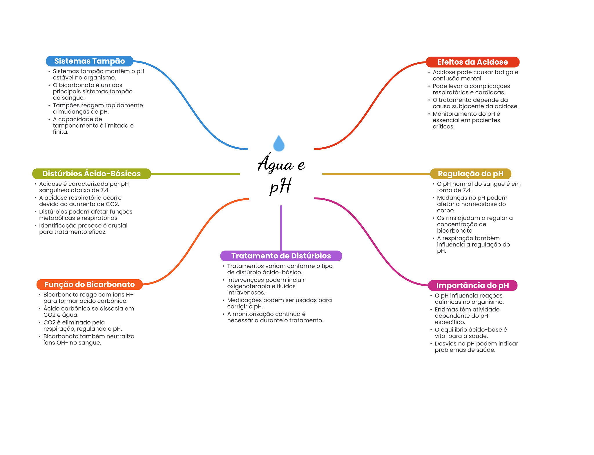Sistemas Tampão Efeitos da Acidose Sistemas tampão mantêm pH Acidose pode causar fadiga e estável no organismo. confusão mental. bicarbonato é um dos Pode levar a complicações principais sistemas tampão respiratórias e cardíacas. do sangue. tratamento depende da Tampões reagem rapidamente causa subjacente da acidose. a mudanças de pH. Monitoramento do pH é A capacidade de essencial em pacientes tamponamento é limitada e críticos. finita. Água e Distúrbios Ácido-Básicos Regulação do pH Acidose é caracterizada por pH pH pH normal do sangue é em sanguíneo abaixo de 7,4. torno de 7,4. A acidose respiratória ocorre Mudanças no pH podem devido ao aumento de CO2. afetar a homeostase do Distúrbios podem afetar funções corpo. metabólicas e respiratórias. Os rins ajudam a regular a Identificação precoce é crucial concentração de para tratamento eficaz. bicarbonato. A respiração também influencia a regulação do pH. Tratamento de Distúrbios Tratamentos variam conforme tipo de distúrbio ácido-básico. Intervenções podem incluir Função do Bicarbonato oxigenoterapia e fluidos Importância do pH Bicarbonato reage com íons H+ intravenosos. pH influencia reações para formar ácido carbônico. Medicações podem ser usadas para químicas no organismo. Ácido carbônico se dissocia em corrigir pH. Enzimas têm atividade CO2 e água. A monitorização contínua é dependente do pH CO2 é eliminado pela necessária durante tratamento. específico. respiração, regulando pH. equilíbrio ácido-base é Bicarbonato também neutraliza vital para a saúde. no sangue. Desvios no pH podem indicar problemas de saúde.