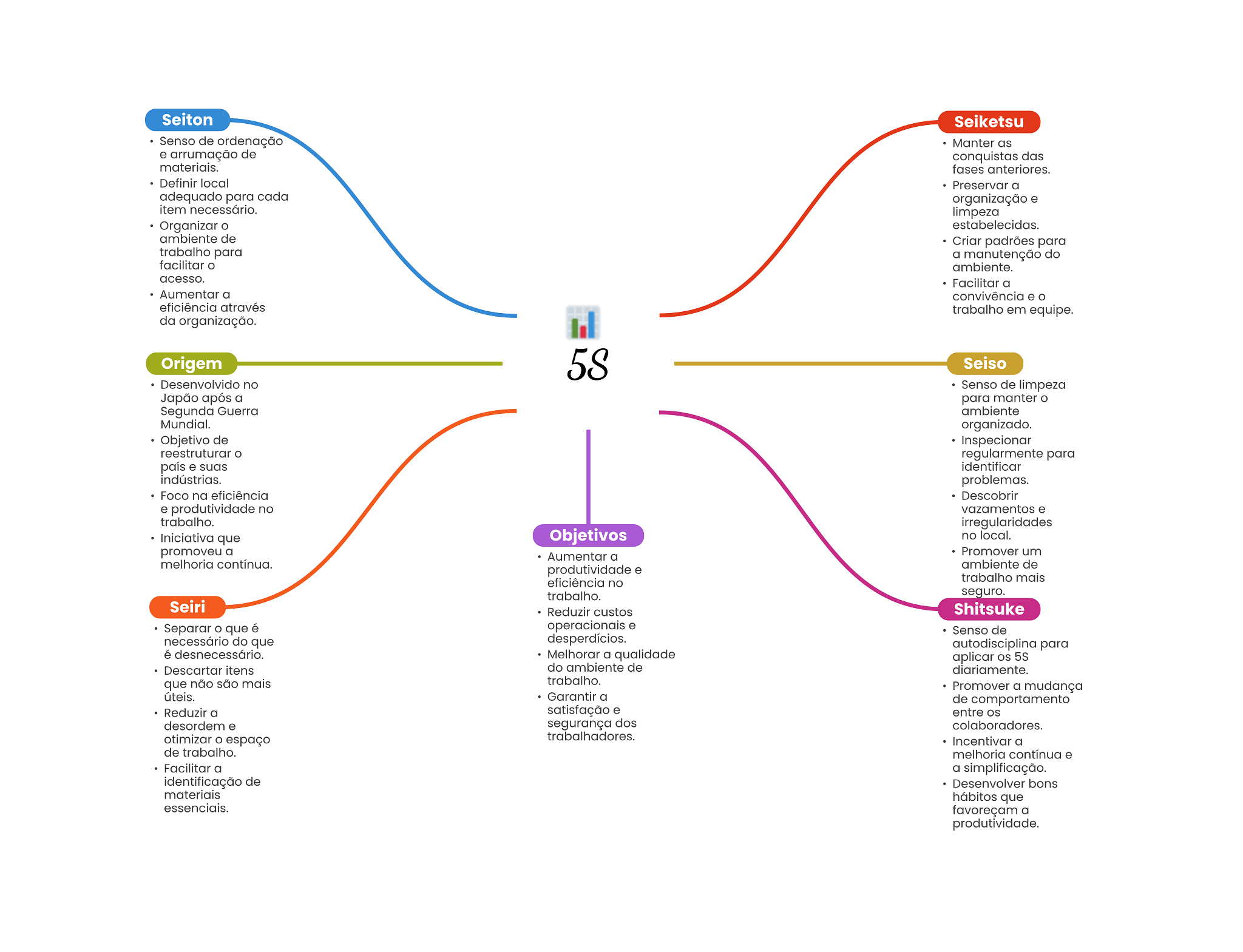 Seiton Seiketsu Senso de ordenação Manter as e arrumação de conquistas das materiais. fases anteriores. Definir local Preservar a adequado para cada organização e item necessário. limpeza Organizar estabelecidas. ambiente de Criar padrões para trabalho para a manutenção do facilitar ambiente. acesso. Facilitar a Aumentar a convivência e eficiência através trabalho em equipe. da organização. Origem 5S Seiso Desenvolvido no Senso de limpeza Japão após a para manter Segunda Guerra ambiente Mundial. organizado. Objetivo de Inspecionar reestruturar regularmente para país e suas identificar indústrias. problemas. Foco na eficiência Descobrir e produtividade no vazamentos e trabalho. irregularidades Iniciativa que Objetivos no local. promoveu a Aumentar a Promover um melhoria contínua. ambiente de produtividade e eficiência no trabalho mais trabalho. seguro. Seiri Reduzir custos Shitsuke Separar que é operacionais e Senso de necessário do que desperdícios. autodisciplina para é desnecessário. Melhorar a qualidade aplicar 5S Descartar itens do ambiente de diariamente. que não são mais trabalho. Promover a mudança úteis. Garantir a de comportamento Reduzir a satisfação e entre OS desordem e segurança dos colaboradores. otimizar espaço trabalhadores. Incentivar a de trabalho. melhoria contínua e Facilitar a a simplificação. identificação de Desenvolver bons materiais hábitos que essenciais. favoreçam a produtividade.