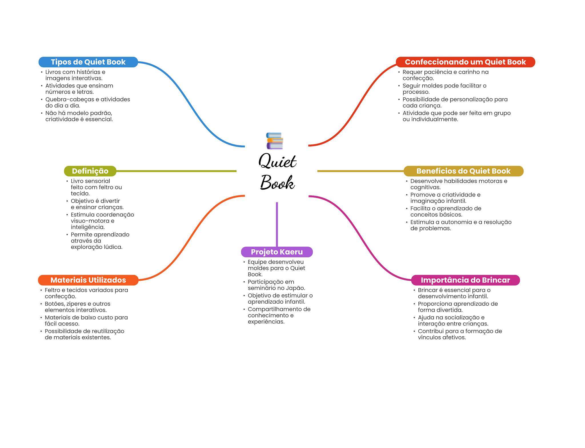 Tipos de Quiet Book Confeccionando um Quiet Book Livros com histórias e Requer paciência e carinho na imagens interativas. confecção. Atividades que ensinam Seguir moldes pode facilitar números e letras. processo. Quebra-cabeças e atividades Possibilidade de personalização para do dia a dia. cada criança. Não há modelo padrão, Atividade que pode ser feita em grupo criatividade é essencial. ou individualmente. Quiet Definição Benefícios do Quiet Book Livro sensorial Book Desenvolve habilidades motoras e feito com feltro ou cognitivas. tecido. Promove a criatividade e Objetivo é divertir imaginação infantil. e ensinar crianças. Facilita aprendizado de Estimula coordenação conceitos básicos. visuo-motora e Estimula a autonomia e a resolução inteligência. de problemas. Permite aprendizado através da exploração lúdica. Projeto Kaeru Equipe desenvolveu moldes para O Quiet Book. Materiais Utilizados Participação em Importância do Brincar Feltro e tecidos variados para seminário no Japão. Brincar é essencial para confecção. Objetivo de estimular desenvolvimento infantil. Botões, zíperes e outros aprendizado infantil. Proporciona aprendizado de elementos interativos. Compartilhamento de forma divertida. Materiais de baixo custo para conhecimento e Ajuda na e fácil acesso. experiências. interação entre crianças. Possibilidade de reutilização Contribui para a formação de de materiais existentes. vínculos afetivos.