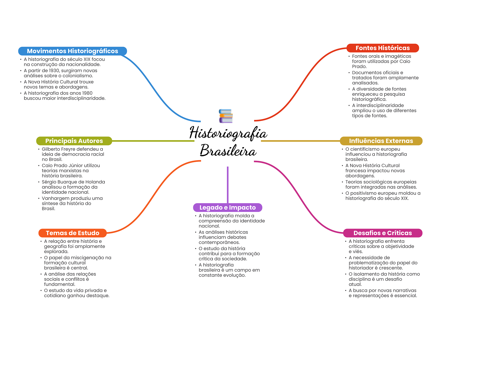 Fontes Históricas Movimentos Historiográficos Fontes orais e imagéticas A historiografia do século XIX focou foram utilizadas por Caio na construção da nacionalidade. Prado. A partir de 1930, surgiram novas Documentos oficiais e análises sobre colonialismo. tratados foram amplamente A Nova História Cultural trouxe analisados. novos temas e abordagens. A diversidade de fontes A historiografia dos anos 1980 enriqueceu a pesquisa buscou maior interdisciplinaridade. historiográfica. A interdisciplinaridade ampliou uso de diferentes tipos de fontes. Historiografia Principais Autores Influências Externas Gilberto Freyre defendeu a ideia de democracia racial Brasileira cientificismo europeu influenciou a historiografia no Brasil. brasileira. Caio Prado Júnior utilizou A Nova História Cultural teorias marxistas na francesa impactou novas história brasileira. abordagens. Sérgio Buarque de Holanda Teorias sociológicas europeias analisou a formação da foram integradas nas análises. identidade nacional. positivismo europeu moldou a Vanhargem produziu uma historiografia do século XIX. síntese da história do Brasil. Legado e Impacto A historiografia molda a compreensão da identidade nacional. Temas de Estudo As análises históricas Desafios e Críticas influenciam debates A relação entre história e contemporâneos. A historiografia enfrenta geografia foi amplamente estudo da história críticas sobre a objetividade explorada. e viés. contribui para a formação papel da miscigenação na crítica da sociedade. A necessidade de formação cultural A historiografia problematização do papel do brasileira é central. historiador é crescente. brasileira é um campo em A análise das relações constante evolução. isolamento da história como sociais e conflitos é disciplina é um desafio fundamental. atual. estudo da vida privada e A busca por novas narrativas cotidiano ganhou destaque. e representações é essencial.