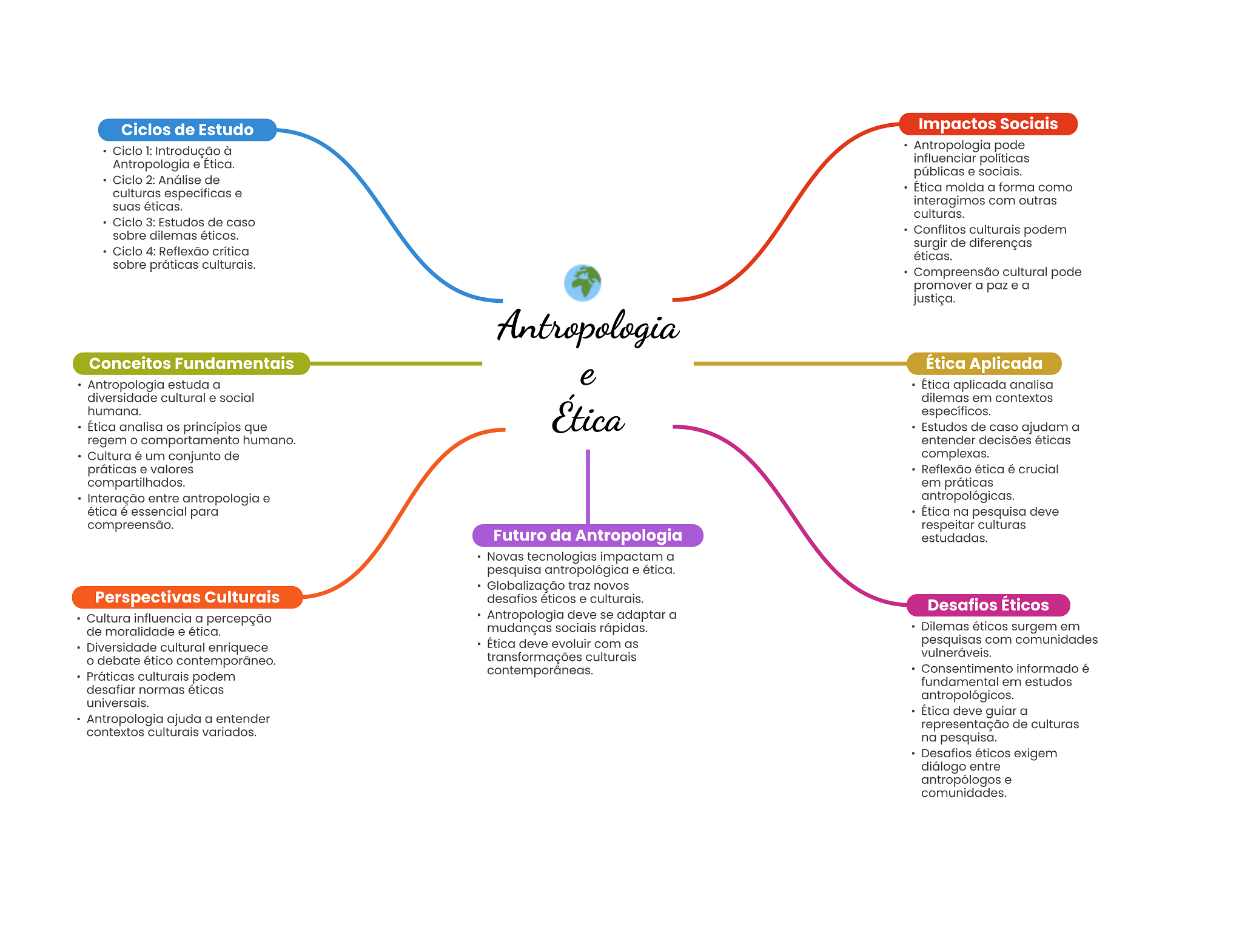 Ciclos de Estudo Impactos Sociais Ciclo 1: Introdução à Antropologia pode Antropologia e Ética. influenciar políticas públicas e sociais. Ciclo 2: Análise de Ética molda a forma como culturas específicas e suas éticas. interagimos com outras culturas. Ciclo 3: Estudos de caso sobre dilemas éticos. Conflitos culturais podem surgir de diferenças Ciclo 4: Reflexão crítica éticas. sobre práticas culturais. Compreensão cultural pode promover a paz e a justiça. Antropologia Conceitos Fundamentais Ética Aplicada e Antropologia estuda a Ética aplicada analisa diversidade cultural e social dilemas em contextos humana. Ética analisa princípios que Ética específicos. Estudos de caso ajudam a regem O comportamento humano. entender decisões éticas Cultura é um conjunto de complexas. práticas e valores Reflexão ética é crucial compartilhados. em práticas Interação entre antropologia e antropológicas. ética é essencial para Ética na pesquisa deve compreensão. respeitar culturas Futuro da Antropologia estudadas. Novas tecnologias impactam a pesquisa antropológica e ética. Globalização traz novos Perspectivas Culturais desafios éticos e culturais. Desafios Éticos Cultura influencia a percepção Antropologia deve se adaptar a de moralidade e ética. mudanças sociais rápidas. Dilemas éticos surgem em Diversidade cultural enriquece Ética deve evoluir com as pesquisas com comunidades transformações culturais vulneráveis. O debate ético contemporâneo. contemporâneas. Consentimento informado é Práticas culturais podem fundamental em estudos desafiar normas éticas antropológicos. universais. Ética deve guiar a Antropologia ajuda a entender representação de culturas contextos culturais variados. na pesquisa. Desafios éticos exigem diálogo entre antropólogos e comunidades.