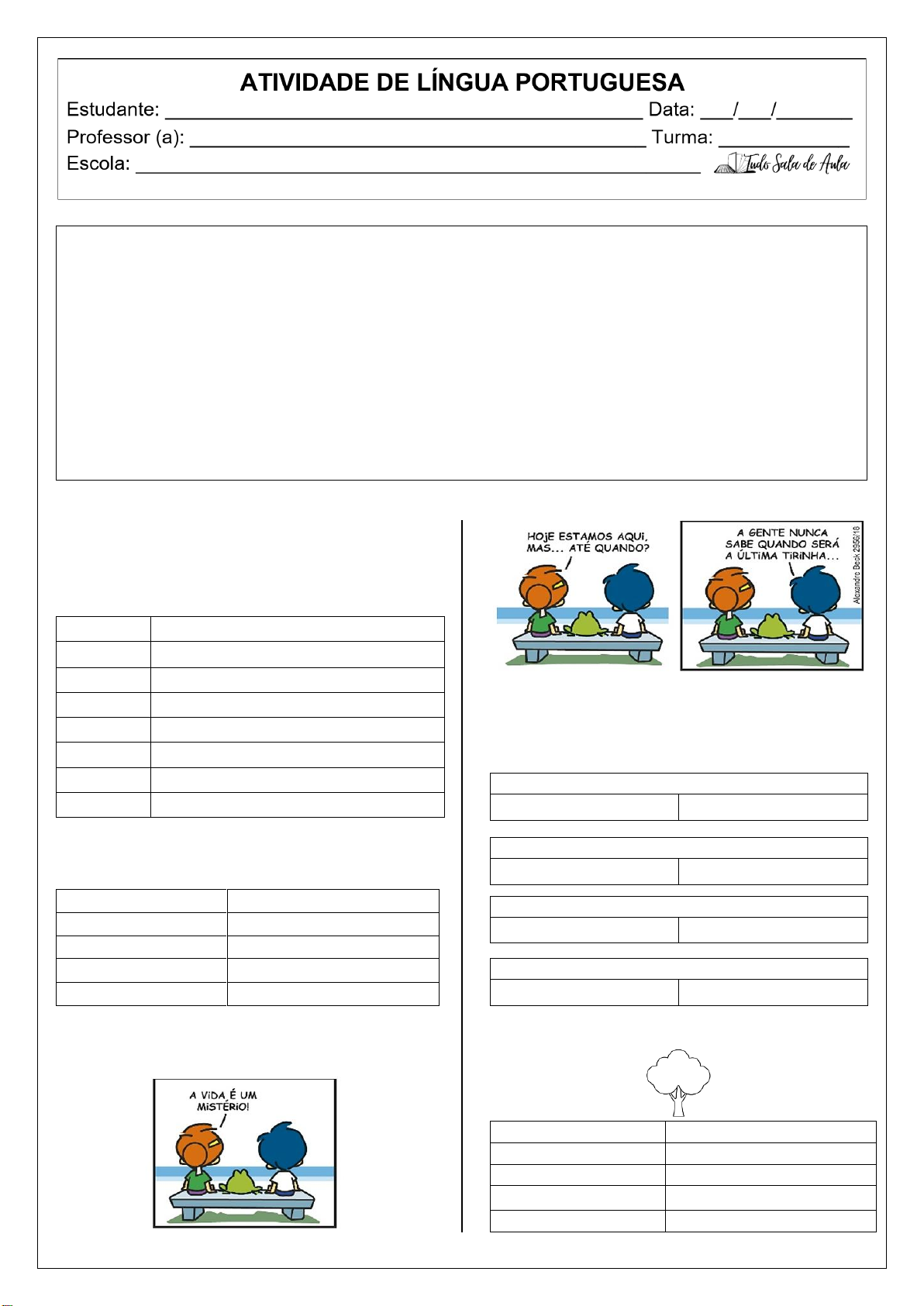 🔎 SAIBA MAIS: A sílaba tônica é a sílaba "forte" de uma palavra, aquela que a gente fala com mais força. Em algumas palavras, a sílaba tônica tem um acento, como o agudo (´) ou o circunflexo (ˆ), para nos ajudar a descobrir qual é a mais forte. Essas palavras podem se classificar como: ▶ Oxítonas: a última sílaba tônica. Ex: Ca-fé ▶ Paroxítonas: a penúltima sílaba tônica. Ex: Es-co-la ▶ Proparoxítonas: a antepenúltima sílaba tônica. Ex: Sábado 📚 Atividades ___________________________ 1. Observe as palavras, separe-as em sílabas e destaque (circule) a sílaba tônica de cada uma. COPO CAVALO MAÇÃ ÁRVORE PAPÉL FÁBULA CAFÉ SOFÁ 2. Circule a sílaba tônica de cada palavra e escreva. BA – NA – NA JA – CA – RÉ PE – DA – ÇO TE – LE – FO – NE MÁ – GI – CO 3. Leia a tirinha de Armandinho, de Alexandre Beck, e, depois, responda. https://www.tumblr.com/tirasarmandinho Faça a separação silábica das palavras da tirinha e classifique-as em oxítona, paroxítona ou proparoxítona. MISTÉRIO QUANDO SERÁ ÚLTIMA 4. Obedeça ao comando de cada item abaixo. Nome da imagem: Separação silábica: Número de sílabas: Sílaba tônica: Classificação: https://www.tudosaladeaula.com/ https://www.tudosaladeaula.com/ https://www.tudosaladeaula.com/ https://www.tudosaladeaula.com/ Nome da imagem: Separação silábica: Número de sílabas: Sílaba tônica: Classificação: Nome da imagem: Separação silábica: Número de sílabas: Sílaba tônica: Classificação: Nome da imagem: Separação silábica: Número de sílabas: Sílaba tônica: Classificação: Observe um trecho de uma HQ e responda às questões 5 e 6. HQ "O sumiço dos pais do Cascão" – Arquivos Turma da Mônica 5. Observe a palavra “BANHO” no texto. Escreva qual é a sílaba tônica (a mais forte) dessa palavra e a classifique. _______________________________________ _______________________________________ 6. Encontre, na tirinha, uma palavra que seja paroxítona acentuada. Depois, circule a sílaba tônica. _______________________________________ _______________________________________ Leia o poema de Vinicius de Moraes e responda. O GATO Com a pança mole, De barriga para o ar, No meio da sala, Dormia o Gato a roncar. Quando o Dono voltou, O Gato se esticou, Seu corpo felpudo, E foi comer a ração. Não tem beleza, Mas tem um jeito, De ser um amigo E fazer tudo direitinho. Vinicius de Moraes 7. Leia as palavras abaixo retiradas do texto e identifique a sílaba tônica de cada uma: Ração: ____________ Esticou: ______________ Pança: _____________ Gato: _______________ 8. Classifique as palavras abaixo quanto à posição da sílaba tônica: AVÓ MÉDICO FÁCIL CADERNO CAFÉ MATEMÁTICA LÂMPADA MESA TAMBÉM OXÍTONAS PAROXÍTONAS PROPAROXÍTONAS 9. Divida as palavras em sílabas, colocando cada uma em um quadrinho e, depois, pinte a sílaba tônica. RONCAR _____ _____ BARRIGA _____ _____ _____ ESTICOU _____ _____ _____ AMIGO _____ _____ _____ 10. Escreva o seu primeiro nome, separe suas sílabas e classifique-o quanto ao número de sílabas. Tudo Sala de Aula https://arquivosturmadamonica.blogspot.com/2025/09/hq-o-sumico-dos-pais-do-cascao.html?utm_source=chatgpt.com https://www.tudosaladeaula.com/ https://www.tudosaladeaula.com/ https://www.tudosaladeaula.com/ https://www.tudosaladeaula.com/