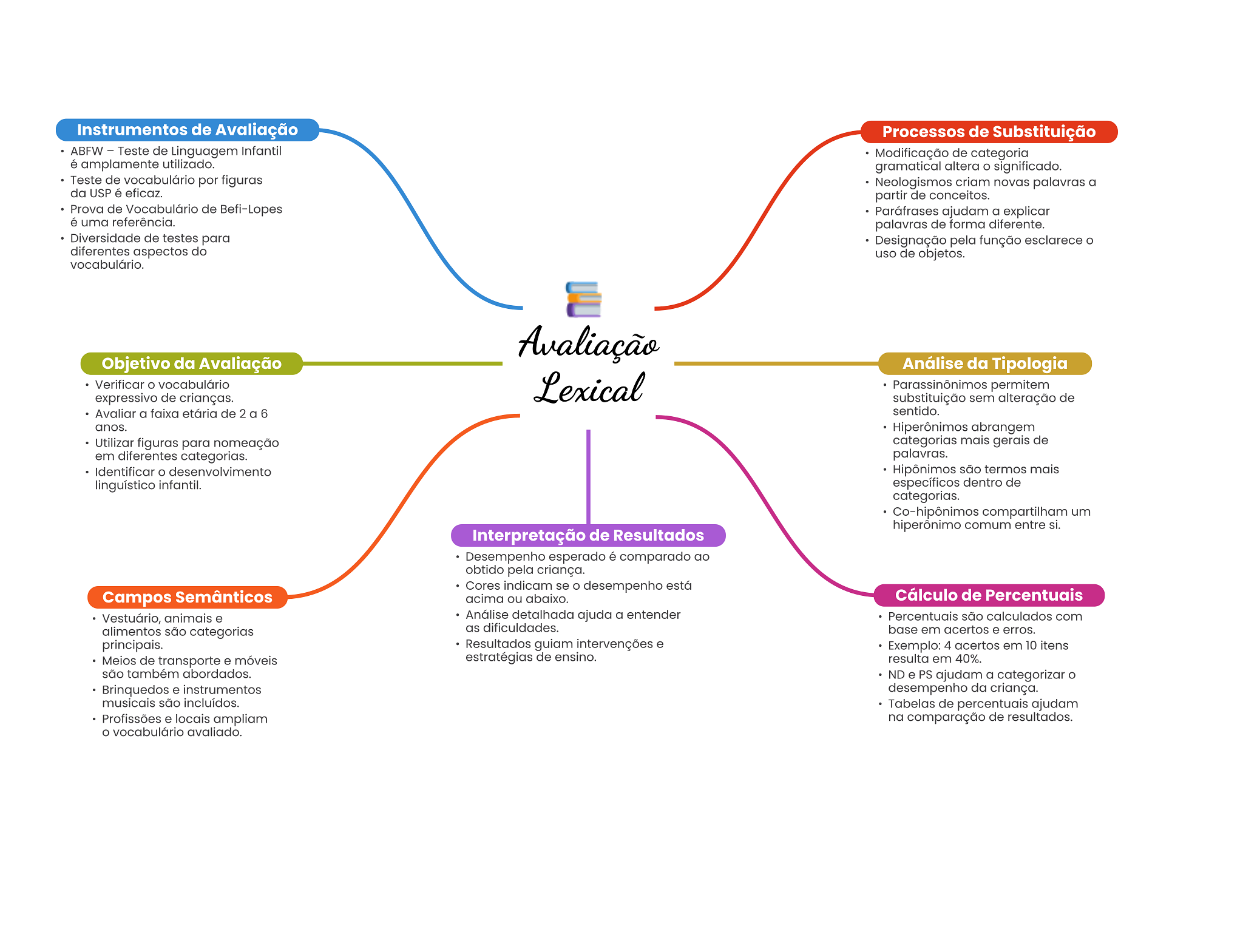 Instrumentos de Avaliação Processos de Substituição ABFW Teste de Linguagem Infantil Modificação de categoria é amplamente utilizado. gramatical altera significado. Teste de vocabulário por figuras Neologismos criam novas palavras a da USP é eficaz. partir de conceitos. Prova de Vocabulário de Befi-Lopes Paráfrases ajudam a explicar é uma referência. palavras de forma diferente. Diversidade de testes para Designação pela função esclarece diferentes aspectos do uso de objetos. vocabulário. Avaliação Objetivo da Avaliação Análise da Tipologia Verificar vocabulário expressivo de crianças. Lexical Parassinônimos permitem substituição sem alteração de Avaliar a faixa etária de 2 a 6 sentido. anos. Hiperônimos abrangem Utilizar figuras para nomeação categorias mais gerais de em diferentes categorias. palavras. Identificar desenvolvimento Hipônimos são termos mais linguístico infantil. específicos dentro de categorias. Co-hipônimos compartilham um hiperônimo comum entre si. Interpretação de Resultados Desempenho esperado é comparado ao obtido pela criança. Cores indicam se O desempenho está Campos Semânticos acima ou abaixo. Cálculo de Percentuais Vestuário, animais e Análise detalhada ajuda a entender Percentuais são calculados com alimentos são categorias as dificuldades. base em acertos e erros. principais. Resultados guiam intervenções e Exemplo: 4 acertos em 10 itens Meios de transporte e móveis estratégias de ensino. resulta em 40%. são também abordados. ND e PS ajudam a categorizar Brinquedos e instrumentos desempenho da criança. musicais são incluídos. Tabelas de percentuais ajudam Profissões e locais ampliam na comparação de resultados. vocabulário avaliado.