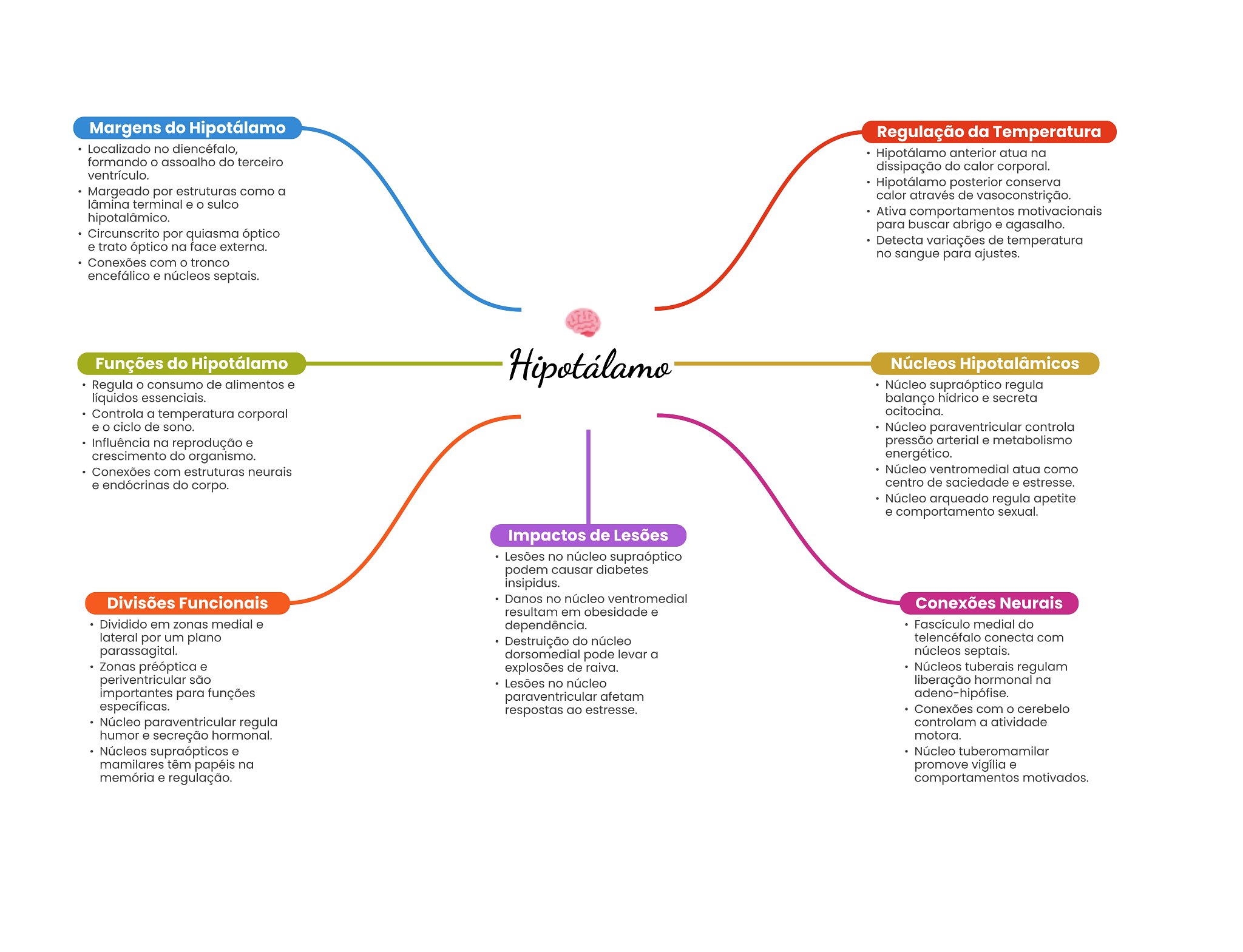 Margens do Hipotálamo Regulação da Temperatura Localizado no diencéfalo, Hipotálamo anterior atua na formando assoalho do terceiro dissipação do calor corporal. ventrículo. Hipotálamo posterior conserva Margeado por estruturas como a calor através de vasoconstrição. lâmina terminal e sulco hipotalâmico. Ativa comportamentos motivacionais para buscar abrigo e agasalho. Circunscrito por quiasma óptico e trato óptico na face externa. Detecta variações de temperatura no sangue para ajustes. Conexões com tronco encefálico e núcleos septais. Funções do Hipotálamo Hipotálamo Núcleos Hipotalâmicos Regula consumo de alimentos e Núcleo supraóptico regula líquidos essenciais. balanço hídrico e secreta Controla a temperatura corporal ocitocina. e ciclo de sono. Núcleo paraventricular controla Influência na reprodução e pressão arterial e metabolismo crescimento do organismo. energético. Conexões com estruturas neurais Núcleo ventromedial atua como e endócrinas do corpo. centro de saciedade e estresse. Núcleo arqueado regula apetite e comportamento sexual. Impactos de Lesões Lesões no núcleo supraóptico podem causar diabetes insipidus. Divisões Funcionais Danos no núcleo ventromedial Conexões Neurais resultam em obesidade e Dividido em zonas medial e dependência. Fascículo medial do lateral por um plano Destruição do núcleo telencéfalo conecta com parassagital. dorsomedial pode levar a núcleos septais. Zonas préóptica e explosões de raiva. Núcleos tuberais regulam periventricular são Lesões no núcleo liberação hormonal na importantes para funções paraventricular afetam adeno-hipófise. específicas. respostas ao estresse. Conexões com cerebelo Núcleo paraventricular regula controlam a atividade humor e secreção hormonal. motora. Núcleos supraópticos e Núcleo tuberomamilar mamilares têm papéis na promove vigília e memória e regulação. comportamentos motivados.
