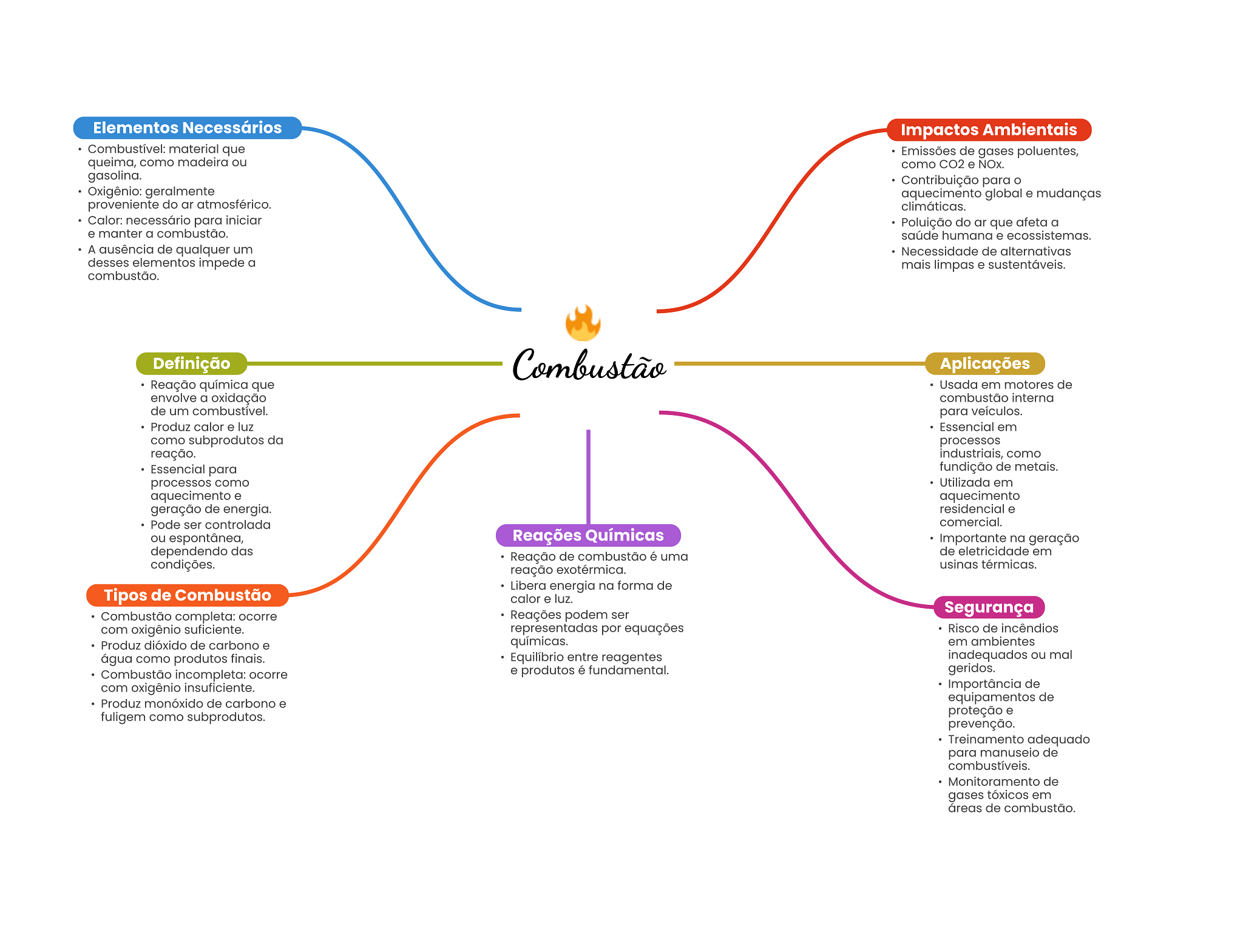 Elementos Necessários Impactos Ambientais Combustível: material que Emissões de gases poluentes, queima, como madeira ou como CO2 e NOx. gasolina. Contribuição para Oxigênio: geralmente aquecimento global e mudanças proveniente do ar atmosférico. climáticas. Calor: necessário para iniciar Poluição do ar que afeta a e manter a combustão. saúde humana e ecossistemas. A ausência de qualquer um Necessidade de alternativas desses elementos impede a mais limpas e sustentáveis. combustão. Definição Combustão Aplicações Reação química que Usada em motores de envolve a oxidação combustão interna de um combustível. para veículos. Produz calor e luz Essencial em como subprodutos da processos reação. industriais, como Essencial para fundição de metais. processos como Utilizada em aquecimento e aquecimento geração de energia. residencial e Pode ser controlada comercial. ou espontânea, Reações Químicas Importante na geração dependendo das Reação de combustão é uma de eletricidade em condições. reação exotérmica. usinas térmicas. Libera energia na forma de Tipos de Combustão calor e luz. Combustão completa: ocorre Reações podem ser Segurança com oxigênio suficiente. representadas por equações Risco de incêndios Produz dióxido de carbono e químicas. em ambientes água como produtos finais. Equilíbrio entre reagentes inadequados ou mal Combustão incompleta: ocorre e produtos é fundamental. geridos. com oxigênio insuficiente. Importância de Produz monóxido de carbono e equipamentos de fuligem como subprodutos. proteção e prevenção. Treinamento adequado para manuseio de combustíveis. Monitoramento de gases tóxicos em áreas de combustão.
