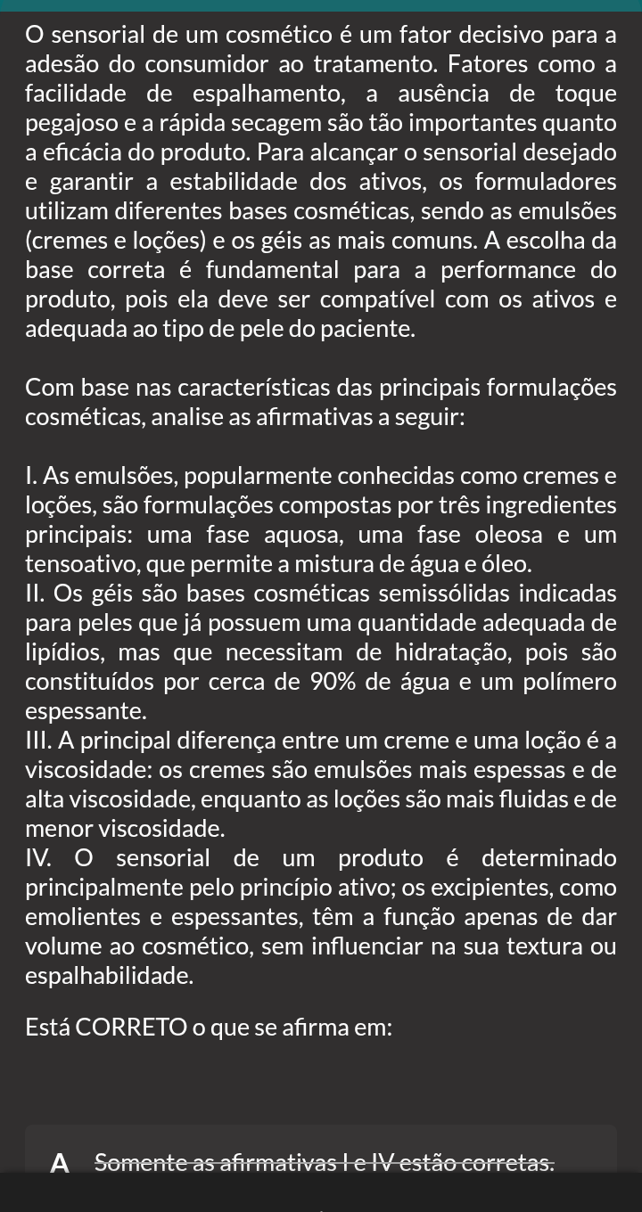 sensorial de um cosmético é um fator decisivo para a adesão do consumidor ao tratamento. Fatores como a facilidade de espalhamento, a ausência de toque pegajoso e a rápida secagem são tão importantes quanto a eficácia do produto. Para alcançar sensorial desejado e garantir a estabilidade dos ativos, os formuladores utilizam diferentes bases cosméticas, sendo as emulsões (cremes e loções) e os géis as mais comuns. A escolha da base correta é fundamental para a performance do produto, pois ela deve ser compatível com os ativos e adequada ao tipo de pele do paciente. Com base nas características das principais formulações cosméticas, analise as afirmativas a seguir: I. As emulsões, popularmente conhecidas como cremes e loções, são formulações compostas por três ingredientes principais: uma fase aquosa, uma fase oleosa e um tensoativo, que permite a mistura de água e óleo. II. Os géis são bases cosméticas semissólidas indicadas para peles que já possuem uma quantidade adequada de lipídios, mas que necessitam de hidratação, pois são constituídos por cerca de 90% de água e um polímero espessante. III. A principal diferença entre um creme e uma loção é a viscosidade: os cremes são emulsões mais espessas e de alta viscosidade, enquanto as loções são mais fluidas e de menor viscosidade. IV. sensorial de um produto é determinado principalmente pelo princípio ativo; os excipientes, como emolientes e espessantes, têm a função apenas de dar volume ao cosmético, sem influenciar na sua textura ou espalhabilidade. Está CORRETO que se afirma em: A Somente as afirmativas le IV estão corretas.