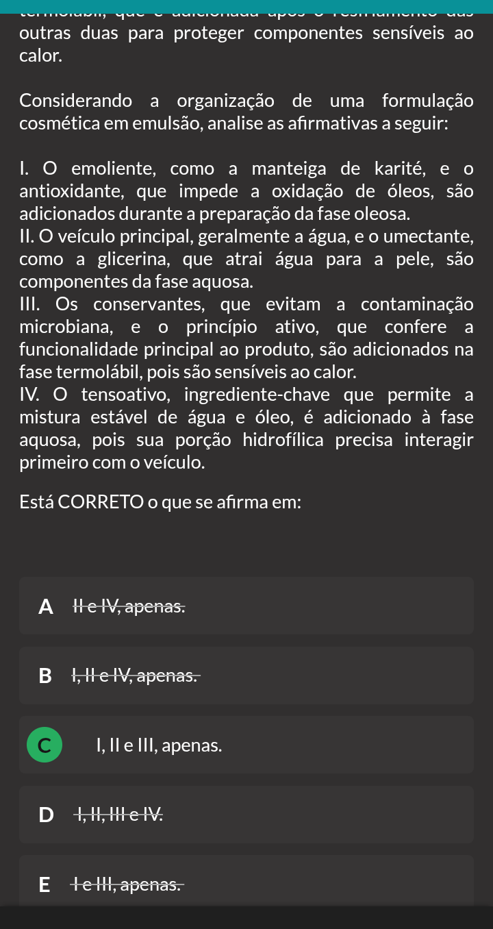 outras duas para proteger componentes sensíveis ao calor. Considerando a organização de uma formulação cosmética em emulsão, analise as afirmativas a seguir: I. emoliente, como a manteiga de karité, e o antioxidante, que impede a oxidação de óleos, são adicionados durante a preparação da fase oleosa. II. veículo principal, geralmente a água, e o umectante, como a glicerina, que atrai água para a pele, são componentes da fase aquosa. III. Os conservantes, que evitam a contaminação microbiana, e o princípio ativo, que confere a funcionalidade principal ao produto, são adicionados na fase termolábil, pois são sensíveis ao calor. IV. tensoativo, ingrediente-chave que permite a mistura estável de água e óleo, é adicionado à fase aquosa, pois sua porção hidrofílica precisa interagir primeiro com veículo. Está CORRETO o que se afirma em: A I, e III, apenas. D E