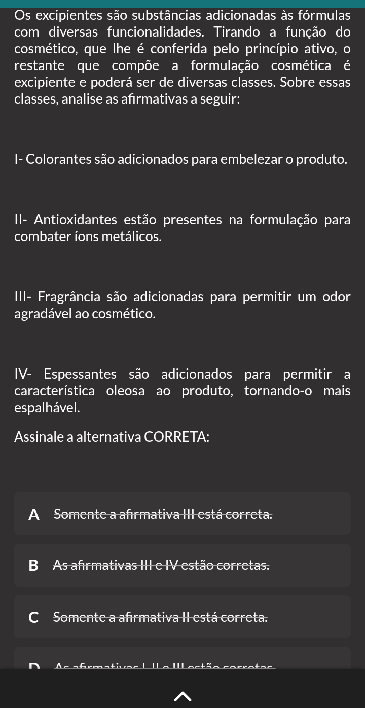 Os excipientes são substâncias adicionadas às fórmulas com diversas funcionalidades. Tirando a função do cosmético, que lhe é conferida pelo princípio ativo, o restante que compõe a formulação cosmética é excipiente e poderá ser de diversas classes. Sobre essas classes, analise as afirmativas a seguir: I- Colorantes são adicionados para embelezar o produto. II- Antioxidantes estão presentes na formulação para combater íons metálicos. III- Fragrância são adicionadas para permitir um odor agradável ao cosmético. IV- Espessantes são adicionados para permitir a característica oleosa ao produto, tornando-o mais espalhável. Assinale a alternativa CORRETA: A Somente a afirmativa está correta. As afirmativas e IV estão corretas. c Somente a afirmativa H está correta. D III estão