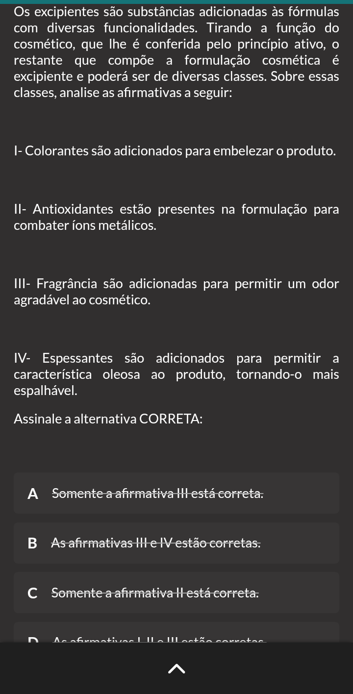 Os excipientes são substâncias adicionadas às fórmulas com diversas funcionalidades. Tirando a função do cosmético, que lhe é conferida pelo princípio ativo, o restante que compõe a formulação cosmética é excipiente e poderá ser de diversas classes. Sobre essas classes, analise as afirmativas a seguir: I- Colorantes são adicionados para embelezar produto. II- Antioxidantes estão presentes na formulação para combater íons metálicos. III- Fragrância são adicionadas para permitir um odor agradável ao cosmético. IV- Espessantes são adicionados para permitir a característica oleosa ao produto, tornando-o mais espalhável. Assinale a alternativa CORRETA: A Somente a afirmativa está correta. As afirmativas e IV estão corretas. c Somente a afirmativa H está correta.