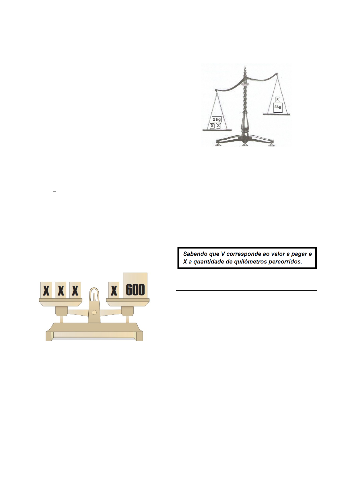 EQUAÇÕES 1) Túlio é agricultor e certo dia comprou 3 pacotes de sementes e 1 pacote de adubo, todos custando o mesmo valor. Além desses pacotes, comprou um par de luvas por R$ 12,00. No momento do pagamento, Túlio verificou que o total pago foi igual a R$ 84,00. Uma equação que permite calcular o valor x de cada pacote de semente é ------------------------------------------------------------------- 2) Douglas propôs a seguinte charada para seus amigos decifrarem: “A diferença entre o triplo do meu peso e sua quinta parte é igual a 70. Qual é o meu peso?” Denotando-se por x o peso de Douglas, a equação que traduz as informações contidas nessa charada é: ------------------------------------------------------------------- 3) O reservatório da casa de Rodrigo estava cheio de água. Ele retirou desse conteúdo para encher a piscina e, em seguida, adicionou 3 000 litros de água no reservatório. Com isso, o conteúdo do reservatório passou a ocupar a metade de sua capacidade inicial. Chamando de x a capacidade total desse reservatório, qual das equações permite calcular o valor de x? ------------------------------------------------------------------- 4) Numa balança, como representada abaixo, foram colocados objetos de maneira que a balança ficou em equilíbrio. Se a letra x representa o peso do objeto conforme a figura, para que o prato da esquerda tenha o mesmo peso do prato da direita o valor de x deve ser ------------------------------------------------------------------- 5) Uma fábrica de camisas paga aos seus funcionários um salário fixo de 400 reais, mais uma comissão de 20 reais por cada peça produzida. O dono da fábrica, no entanto, determinou que nenhum salário pago a seus funcionários poderá ultrapassar a quantia de 2 000 reais. A expressão que melhor representa a quantidade de camisas (x) que um funcionário dessa fábrica deve produzir para atender às determinações de seu dono é ------------------------------------------------------------------- 6) A figura abaixo mostra uma balança, na qual em cada um dos pratos há valores de pesos conhecidos e valores de pesos desconhecidos, representados por x. A expressão matemática que relaciona os pesos nos pratos da balança é ------------------------------------------------------------------- 7) Mário abriu sua carteira e deu um terço do dinheiro que tinha para o seu neto. Após isso, ele deu 6 reais para a sua neta, ficando com 8 reais em sua carteira. A equação que permite encontrar o valor que Mário tinha em sua carteira é: ------------------------------------------------------------------- 8) Numa corrida de táxi do Aeroporto de Palmas até a região norte da capital é cobrada uma taxa fixa de R$ 4,00 mais R$ 1,80 por quilômetro rodado. A expressão matemática do 1º grau que melhor representa essa situação é 9) Frederico é estudante de direito em uma Universidade pública, ele recebe uma mesada de seu pai para suas despesas com transporte e alimentação, num total de R$ 540,00 mensal. Desse total ele gasta R$ 120,00 com transporte e R$ 230,00 com alimentação. A expressão que representa a sua economia mensal é ------------------------------------------------------------------- 10) Uma prefeitura aplicou R$ 850 mil na construção de 3 creches e um parque infantil. O custo de cada creche foi de R$ 250 mil. A expressão que representa o custo do parque, em mil reais, é: ------------------------------------------------------------------- 11) A figura abaixo mostra uma roldana, na qual em cada um dos pratos há um peso de valor conhecido e esferas de peso x. Uma expressão matemática que relaciona os pesos nos pratos da roldana é: ------------------------------------------------------------------- 12) Uma pessoa compra x latas de azeitonas a R$ 5,00 cada uma e (x + 4) latas de palmito a R$ 7,00 cada uma. No total gastou R$ 172,00. A expressão matemática que relaciona com a situação acima é: ------------------------------------------------------------------- 13) Um número é maior do que outro 4 unidades e a soma desses dois números é 192. Se x é o menor desses números, então uma equação que permite calcular o valor de x é ------------------------------------------------------------------- 14) Janine tem hoje 4 anos e daqui a 8 anos sua idade será da idade de seu pai. A equação que permite calcular o valor x da idade que o pai de Janine tem hoje é: ------------------------------------------------------------------- 15) A balança abaixo está em equilíbrio, isto é, o peso dos pratos é igual. Considere que cada bolinha pesa 1 quilo e que x representa o peso de cada caixa. Então, a 16) sentença matemática que representa a igualdade dos pesos dos pratos e o valor do peso x de cada caixa são, respectivamente, ------------------------------------------------------------------- 16) Após vários cálculos, os engenheiros chegaram a esta equação. Veja no quadrinho: A equação reduzida, equivalente à equação encontrada por eles, é ------------------------------------------------------------------- 17) Em um estacionamento são cobrados, pela primeira hora, R$ 4,00 e, em cada hora seguinte, ou fração da hora, R$ 1,50. Denise pagou 10 reais, logo, seu veículo permaneceu estacionado, neste local, por até (A) 3 horas, porque 10 = 4 + 1,5x. (B) 3 horas, porque 10 = 4x – 1,5. (C) 5 horas, porque 10 = 4 + (x – 1) · 1,5. (D) 5 horas, porque 10 = 1,5 + (x – 1) · 4. ------------------------------------------------------------------- 18) Veja a conversa desses jovens. Essa situação pode ser representada pela equação: 19) Antonia é recepcionista e seu salário mensal é de 520 reais. Para aumentar a sua renda, ela borda toalhas e cobra por cada uma 40 reais. Este mês, ela teve uma renda total de 800 reais. Se x representa o número de toalhas que ela bordou, pode-se afirmar que, este mês, ela bordou (A) 33 toalhas, porque 800 = 40x – 520.