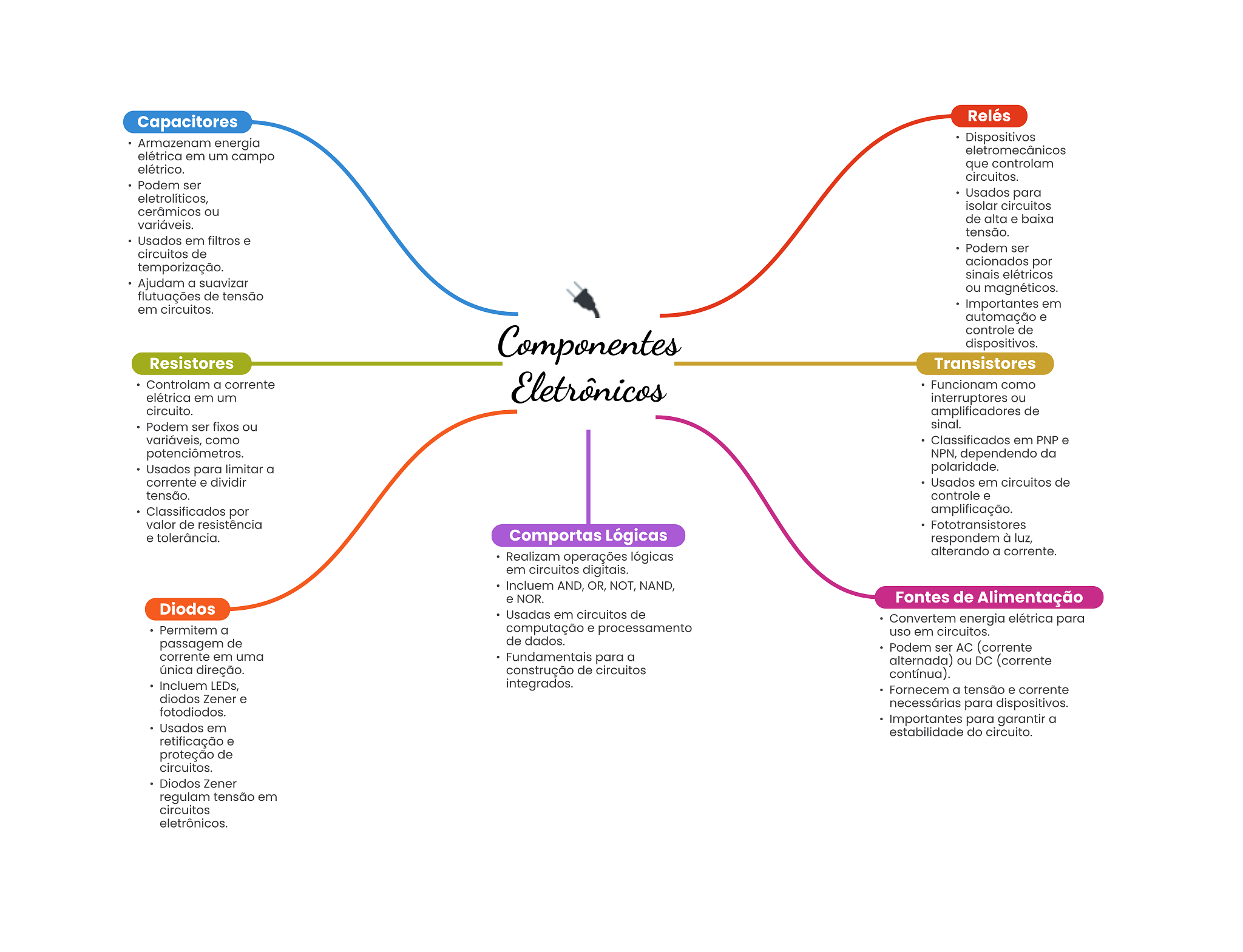 Capacitores Relés Armazenam energia Dispositivos eletromecânicos elétrica em um campo elétrico. que controlam circuitos. Podem ser eletrolíticos, Usados para isolar circuitos cerâmicos ou variáveis. de alta e baixa tensão. Usados em filtros e circuitos de Podem ser temporização. acionados por sinais elétricos Ajudam a suavizar ou magnéticos. flutuações de tensão em circuitos. Importantes em automação e controle de Componentes dispositivos. Resistores Transistores Controlam a corrente elétrica em um Eletrônicos Funcionam como interruptores ou circuito. amplificadores de Podem ser fixos ou sinal. variáveis, como Classificados em PNP e NPN, dependendo da Usados para limitar a polaridade. corrente e dividir Usados em circuitos de tensão. controle e Classificados por amplificação. valor de resistência Fototransistores e tolerância. Comportas Lógicas respondem à luz, Realizam operações lógicas alterando a corrente. em circuitos digitais. Incluem AND, OR, NOT, NAND, e NOR. Fontes de Alimentação Diodos Usadas em circuitos de Convertem energia elétrica para Permitem a computação e processamento uso em circuitos. passagem de de dados. Podem ser AC (corrente corrente em uma Fundamentais para a alternada) ou DC (corrente única direção. construção de circuitos contínua). Incluem LEDs, integrados. Fornecem a tensão e corrente diodos Zener e necessárias para dispositivos. fotodiodos. Importantes para garantir a Usados em estabilidade do circuito. retificação e proteção de circuitos. Diodos Zener regulam tensão em circuitos eletrônicos.