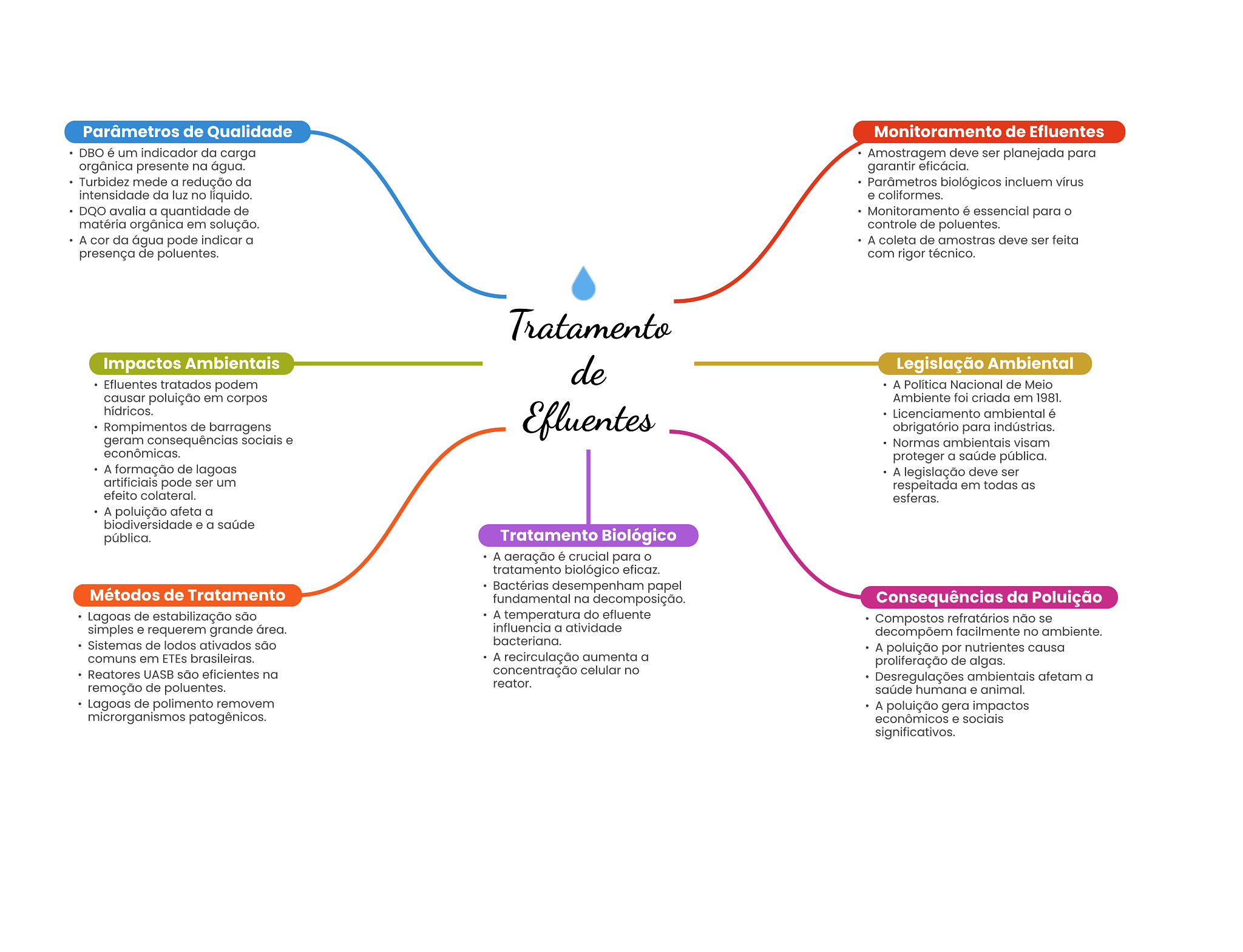 Parâmetros de Qualidade Monitoramento de Efluentes DBO é um indicador da carga Amostragem deve ser planejada para orgânica presente na água. garantir eficácia. Turbidez mede a redução da Parâmetros biológicos incluem vírus intensidade da luz no líquido. e coliformes. DQO avalia a quantidade de Monitoramento é essencial para matéria orgânica em solução. controle de poluentes. A cor da água pode indicar a A coleta de amostras deve ser feita presença de poluentes. com rigor técnico. Tratamento Impactos Ambientais de Legislação Ambiental Efluentes tratados podem A Política Nacional de Meio causar poluição em corpos Ambiente foi criada em 1981. hídricos. Efluentes Licenciamento ambiental é Rompimentos de barragens obrigatório para indústrias. geram consequências sociais e Normas ambientais visam econômicas. proteger a saúde pública. A formação de lagoas A legislação deve ser artificiais pode ser um respeitada em todas as efeito colateral. esferas. A poluição afeta a biodiversidade e a saúde pública. Tratamento Biológico A aeração é crucial para tratamento biológico eficaz. Bactérias desempenham papel Métodos de Tratamento fundamental na decomposição. Consequências da Poluição Lagoas de estabilização são A temperatura do efluente - Compostos refratários não se simples e requerem grande área. influencia a atividade decompõem facilmente no ambiente. Sistemas de lodos ativados são bacteriana. A poluição por nutrientes causa comuns em ETEs brasileiras. A recirculação aumenta a proliferação de algas. Reatores UASB são eficientes na concentração celular no Desregulações ambientais afetam a remoção de poluentes. reator. saúde humana e animal. Lagoas de polimento removem A poluição gera impactos microrganismos patogênicos. econômicos e sociais significativos.