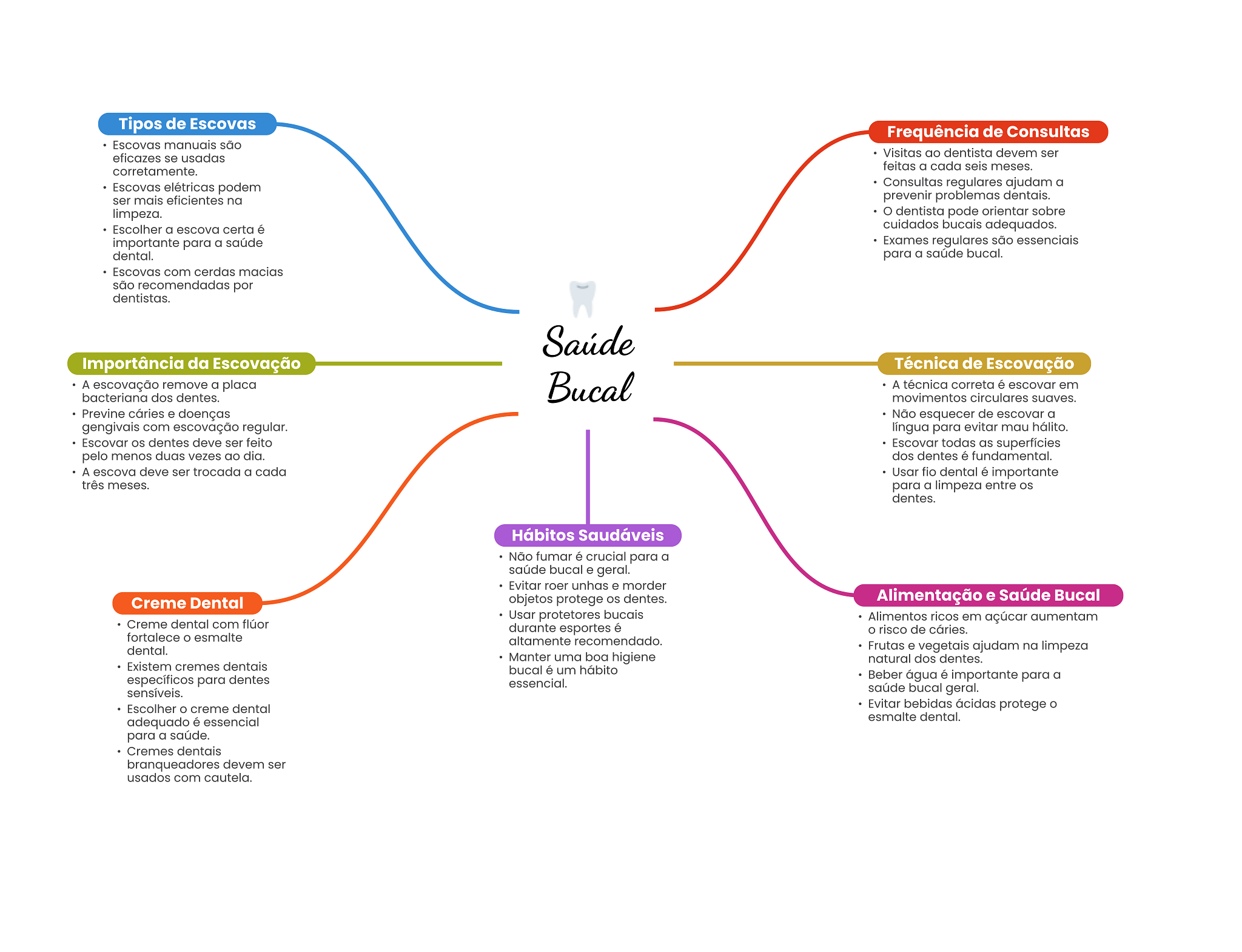 Tipos de Escovas Frequência de Consultas Escovas manuais são eficazes se usadas Visitas ao dentista devem ser corretamente. feitas a cada seis meses. Escovas elétricas podem Consultas regulares ajudam a ser mais eficientes na prevenir problemas dentais. limpeza. dentista pode orientar sobre Escolher a escova certa é cuidados bucais adequados. importante para a saúde Exames regulares são essenciais dental. para a saúde bucal. Escovas com cerdas macias são recomendadas por dentistas. Saúde Importância da Escovação Técnica de Escovação A escovação remove a placa bacteriana dos dentes. Bucal A técnica correta é escovar em movimentos circulares suaves. Previne cáries e doenças Não esquecer de escovar a gengivais com escovação regular. língua para evitar mau hálito. Escovar OS dentes deve ser feito Escovar todas as superfícies pelo menos duas vezes ao dia. dos dentes é fundamental. A escova deve ser trocada a cada Usar fio dental é importante três meses. para a limpeza entre OS dentes. Hábitos Saudáveis Não fumar é crucial para a saúde bucal e geral. Evitar roer unhas e morder Creme Dental objetos protege OS dentes. Alimentação e Saúde Bucal Usar protetores bucais Creme dental com flúor Alimentos ricos em açúcar aumentam durante esportes é O risco de cáries. fortalece esmalte altamente recomendado. dental. Frutas e vegetais ajudam na limpeza Manter uma boa higiene natural dos dentes. Existem cremes dentais bucal é um hábito específicos para dentes Beber água é importante para a essencial. sensíveis. saúde bucal geral. Escolher creme dental Evitar bebidas ácidas protege adequado é essencial esmalte dental. para a saúde. Cremes dentais branqueadores devem ser usados com cautela.