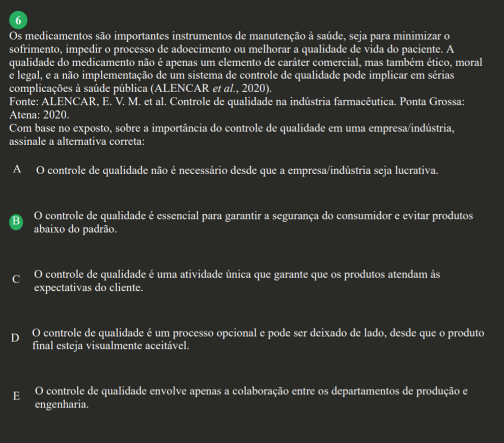 6 Os medicamentos são importantes instrumentos de manutenção à saúde, seja para minimizar o sofrimento, impedir processo de adoecimento ou melhorar a qualidade de vida do paciente. A qualidade do medicamento não é apenas um elemento de caráter comercial, mas também ético, moral e legal, e a não implementação de um sistema de controle de qualidade pode implicar em sérias complicações à saúde pública (ALENCAR et al., 2020). Fonte: ALENCAR, E. V.M. et al. Controle de qualidade na indústria farmacêutica. Ponta Grossa: Atena: 2020. Com base no exposto, sobre a importância do controle de qualidade em uma empresa/indústria, assinale a alternativa correta: A controle de qualidade não é necessário desde que a empresa/indústria seja lucrativa. controle de qualidade é essencial para garantir a segurança do consumidor e evitar produtos abaixo do padrão. O controle de qualidade é uma atividade única que garante que os produtos atendam às expectativas do cliente. D controle de qualidade é um processo opcional e pode ser deixado de lado, desde que o produto final esteja visualmente aceitável. E O controle de qualidade envolve apenas a colaboração entre os departamentos de produção e engenharia.