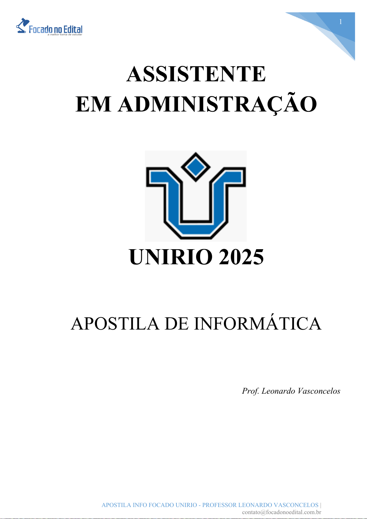 1 APOSTILA INFO FOCADO UNIRIO - PROFESSOR LEONARDO VASCONCELOS | contato@focadonoedital.com.br ASSISTENTE EM ADMINISTRAÇÃO UNIRIO 2025 APOSTILA DE INFORMÁTICA Prof. Leonardo Vasconcelos 188.807.337-37 2 APOSTILA INFO FOCADO UNIRIO - PROFESSOR LEONARDO VASCONCELOS | contato@focadonoedital.com.br SUMÁRIO 1.CONCEITOS E FUNDAMENTOS BÁSICOS ..................................................................................... 3 2.CONHECIMENTO E UTILIZAÇÃO DOS PRINCIPAIS SOFTWARES UTILITÁRIOS (COMPACTADORES DE ARQUIVOS, CHAT, CLIENTES DE E-MAILS, REPRODUTORES DE VÍDEO, VISUALIZADORES DE IMAGEM, ANTIVÍRUS). ......................................................... 3 3.UTILIZAÇÃO DE FERRAMENTAS DE INTELIGÊNCIA ARTIFICIAL: ASPECTOS LEGAIS, ÉTICOS E TÉCNICOS. ......................................................................................................... 15 4.PERIFÉRICOS DE COMPUTADORES. ........................................................................................... 21 5.AMBIENTES OPERACIONAIS: UTILIZAÇÃO BÁSICA DOS SISTEMAS OPERACIONAIS WINDOWS 10 E 11. ................................................................................................................................. 28 6.UTILIZAÇÃO DE FERRAMENTAS DE TEXTO, PLANILHA E APRESENTAÇÃO DO PACOTE MICROSOFT OFFICE (WORD, EXCEL E POWERPOINT) - VERSÕES 2013, 2016 E 365. ............................................................................................................................................................. 82 WORD ........................................................................................................................................................ 82 EXCEL ....................................................................................................................................................... 95 POWERPOINT ........................................................................................................................................ 104 7.CONCEITOS DE TECNOLOGIAS RELACIONADAS À INTERNET, BUSCA E PESQUISA NA WEB. ................................................................................................................................................. 135 8.NAVEGADORES DE INTERNET: MICROSOFT EDGE, MOZILLA FIREFOX, GOOGLE CHROME. .............................................................................................................................................. 149 9.CONCEITOS BÁSICOS DE SEGURANÇA NA INTERNET E VÍRUS DE COMPUTADORES. .................................................................................................................................................................. 156 188.807.337-37 3 APOSTILA INFO FOCADO UNIRIO - PROFESSOR LEONARDO VASCONCELOS | contato@focadonoedital.com.br 1.Conceitos e fundamentos básicos VISÃO GERAL DAS PARTES DE UM COMPUTADOR E DAS SUAS FUNÇÕES. A informática é um meio de obter informações de forma rápida e automática utilizando equipamentos como: Microcomputadores PC’s (Desktops), Mainframes, Notebooks, Tablet e outros tipos de computadores da era digital. Está basicamente dividida em 02 partes: uma física e outra lógica. Entretanto não deixando de esclarecer conceitos de Firmware e Peopleware. HARDWARE E SOFTWARE. · Hardware: É a parte física de um computador, ou seja, o que podemos tocar. · Software: É a parte lógica, os programas de computadores. · Firmware: São softwares que se encontram armazenados em chip. · Peopleware: São os usuários de computadores. 2.Conhecimento e utilização dos principais softwares utilitários (compactadores de arquivos, chat, clientes de e-mails, reprodutores de vídeo, visualizadores de imagem, antivírus). É a parte lógica do computador. Nada mais, nada menos que os programas que estão armazenados ou que controlam a parte física. Embora os dispositivos de armazenamento tenham a função de armazenar arquivos, torna-se impossível cumprir sua função sem ter o que chamamos de sistema de arquivos que é basicamente uma estrutura que indica como os arquivos serão gravados. Sistema de Arquivos FAT (Table allocation File) Trata-se de um sistema que funciona através de uma espécie de tabela que contém indicações para onde estão as informações de cada arquivo. Sistema de Arquivos NTFS (New Tecnology File System) O sistema de arquivos NTFS é completamente seguro e confiável, possui características importantes, que o fez ser considerado um bom sistema de arquivos. É tolerante a falhas. Importância dos dados Algo muito importante é saber que os dados de nosso computador ou diretamente falando, arquivos, são de grande valor e significância para nós. Estamos falando de uma música, de uma foto, de um documento, trabalhos de estudos, etc... 188.807.337-37 4 APOSTILA INFO FOCADO UNIRIO - PROFESSOR LEONARDO VASCONCELOS | contato@focadonoedital.com.br Pensando no fato de ser bastante importante para nós, na mesma hora nos vem em mente o que não pode acontecer: a perda de tais arquivos. Para tal situação precisamos entender sobre o que se chama de segurança de dados (Back-Up). TIPOS DE SOFTWARES Freeware: O Freeware é um programa gratuito, ou seja, qualquer um pode usar. Entretanto possui seu código fonte fechado. Software Livre (open source): É um padrão de software totalmente gratuito onde qualquer um pode editar, alterar, etc... Pra isso se torna regra manter seu código fonte disponível para os demais. Obs: GPL – Licença púbica global Shareware: São programas pagos que necessitam de uma licença, para sua utilização. Exemplos de programas Shareware: Windows, Suíte Office, Brazip entre outros. Há bloqueios de determinados pontos do software. Adware: São programas que exibem propagandas sem a autorização do usuário deixando o computador mais lento. Demo e Trial: Demo é uma versão de software para demonstração, ou seja, alguns recursos ainda não são liberados ou ainda está em 