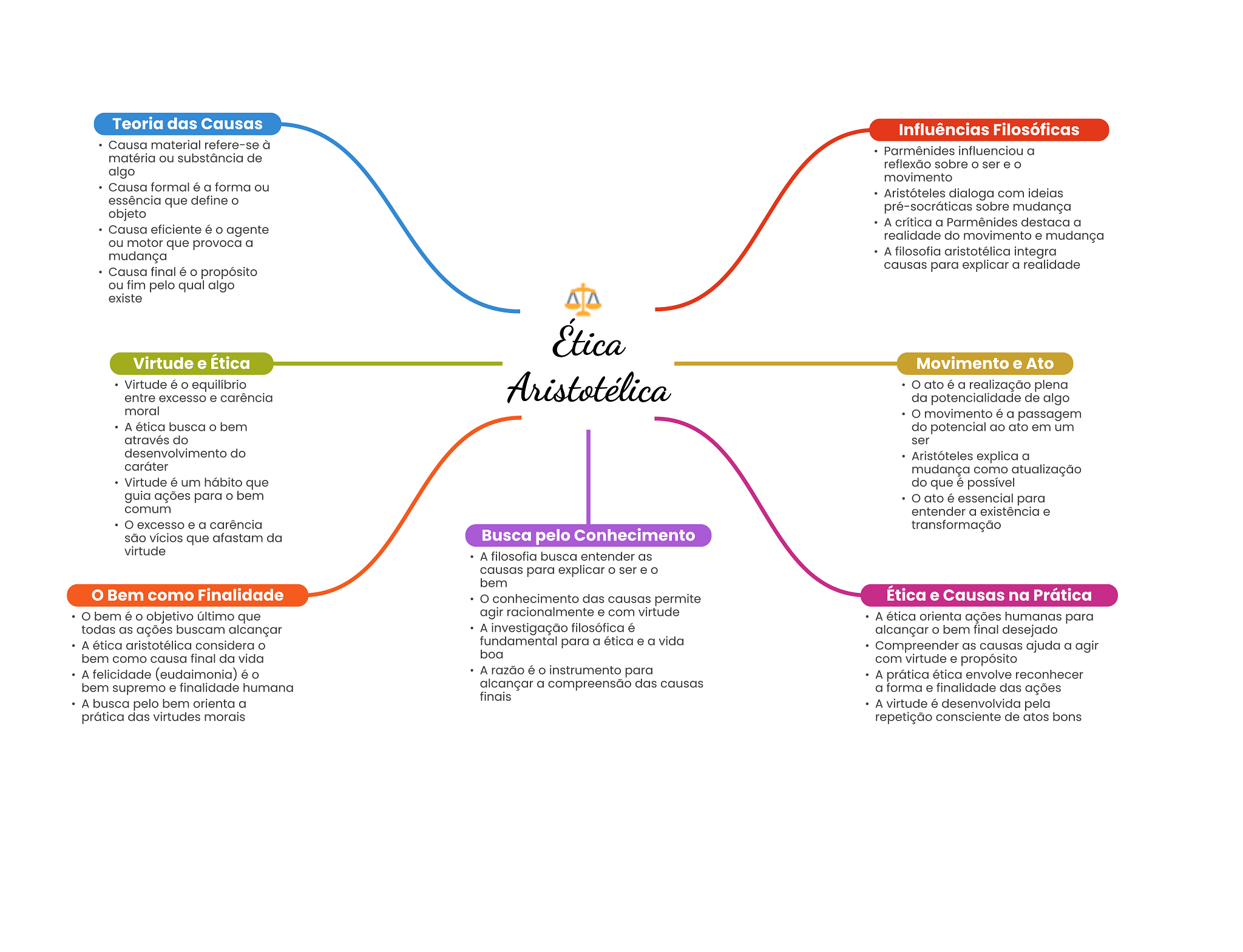 Teoria das Causas Influências Filosóficas Causa material refere-se à Parmênides influenciou a matéria ou substância de reflexão sobre O ser e algo movimento Causa formal é a forma ou Aristóteles dialoga com ideias essência que define pré-socráticas sobre mudança objeto A crítica a Parmênides destaca a Causa eficiente é agente realidade do movimento e mudança ou motor que provoca a mudança A filosofia aristotélica integra Causa final é propósito causas para explicar a realidade ou fim pelo qual algo existe Ética Virtude e Ética Movimento e Ato Virtude é equilíbrio Aristotélica ato é a realização plena entre excesso e carência da potencialidade de algo moral movimento é a passagem A ética busca bem do potencial ao ato em um através do ser desenvolvimento do Aristóteles explica a caráter mudança como atualização Virtude é um hábito que do que é possível guia ações para O bem ato é essencial para comum entender a existência e excesso e a carência transformação são vícios que afastam da Busca pelo Conhecimento virtude A filosofia busca entender as causas para explicar ser e bem Bem como Finalidade conhecimento das causas permite Ética e Causas na Prática bem é objetivo último que agir racionalmente e com virtude A ética orienta ações humanas para todas as ações buscam alcançar A investigação filosófica é alcançar O bem final desejado A ética aristotélica considera fundamental para a ética e a vida Compreender as causas ajuda a agir bem como causa final da vida boa com virtude e propósito A felicidade (eudaimonia) é A razão é instrumento para A prática ética envolve reconhecer bem supremo e finalidade humana alcançar a compreensão das causas a forma e finalidade das ações finais A busca pelo bem orienta a A virtude é desenvolvida pela prática das virtudes morais repetição consciente de atos bons
