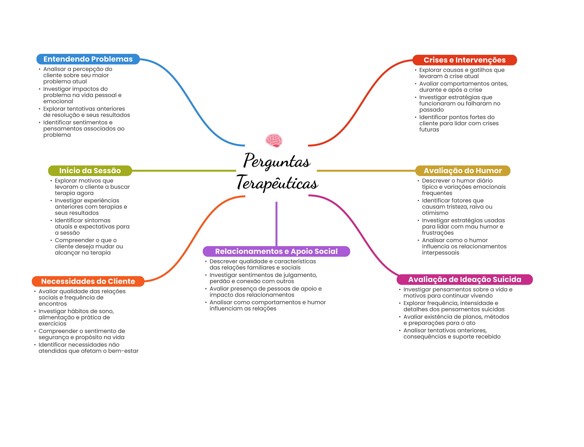 Entendendo Problemas Crises e Intervenções Analisar a percepção do Explorar causas e gatilhos que cliente sobre seu maior levaram à crise atual problema atual Avaliar comportamentos antes, Investigar impactos do durante e após a crise problema na vida pessoal e Investigar estratégias que emocional funcionaram ou falharam no Explorar tentativas anteriores passado de resolução e seus resultados Identificar pontos fortes do Identificar sentimentos e cliente para lidar com crises pensamentos associados ao futuras problema Perguntas Início da Sessão Avaliação do Humor Explorar motivos que levaram cliente a buscar Terapêuticas Descrever humor diário típico e variações emocionais terapia agora frequentes Investigar experiências Identificar fatores que anteriores com terapias e causam tristeza, raiva ou seus resultados otimismo Identificar sintomas Investigar estratégias usadas atuais e expectativas para para lidar com mau humor e a sessão frustrações Compreender que Analisar como O humor cliente deseja mudar ou influencia relacionamentos alcançar na terapia Relacionamentos e Apoio Social interpessoais Descrever qualidade e características das relações familiares e sociais Investigar sentimentos de julgamento, Necessidades do Cliente perdão e conexão com outros Avaliação de Ideação Suicida Avaliar qualidade das relações Avaliar presença de pessoas de apoio e Investigar pensamentos sobre a vida e sociais e frequência de impacto dos relacionamentos motivos para continuar vivendo encontros Analisar como comportamentos e humor Explorar frequência, intensidade e Investigar hábitos de sono, influenciam as relações detalhes dos pensamentos suicidas alimentação e prática de Avaliar existência de planos, métodos exercícios e preparações para ato Compreender sentimento de Analisar tentativas anteriores, segurança e propósito na vida consequências e suporte recebido Identificar necessidades não atendidas que afetam bem-estar