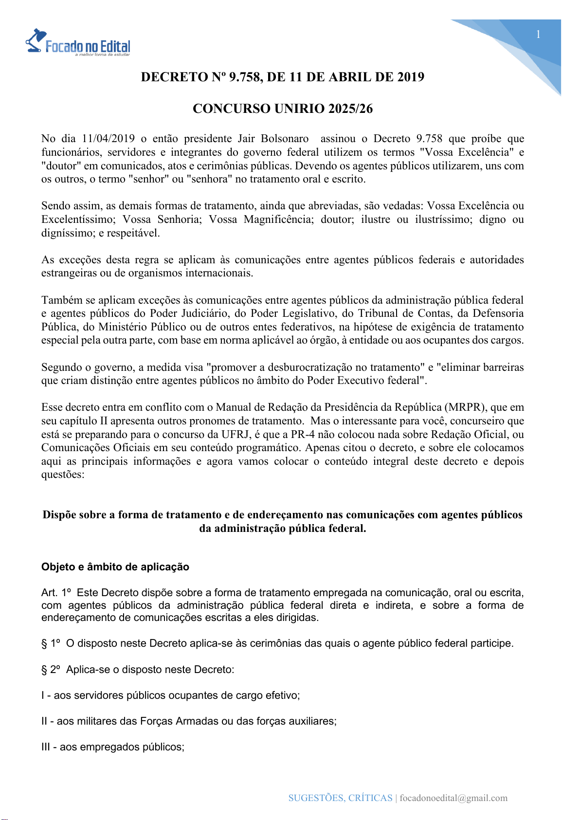 1 SUGESTÕES, CRÍTICAS | focadonoedital@gmail.com DECRETO Nº 9.758, DE 11 DE ABRIL DE 2019 CONCURSO UNIRIO 2025/26 No dia 11/04/2019 o então presidente Jair Bolsonaro assinou o Decreto 9.758 que proíbe que funcionários, servidores e integrantes do governo federal utilizem os termos "Vossa Excelência" e "doutor" em comunicados, atos e cerimônias públicas. Devendo os agentes públicos utilizarem, uns com os outros, o termo "senhor" ou "senhora" no tratamento oral e escrito. Sendo assim, as demais formas de tratamento, ainda que abreviadas, são vedadas: Vossa Excelência ou Excelentíssimo; Vossa Senhoria; Vossa Magnificência; doutor; ilustre ou ilustríssimo; digno ou digníssimo; e respeitável. As exceções desta regra se aplicam às comunicações entre agentes públicos federais e autoridades estrangeiras ou de organismos internacionais. Também se aplicam exceções às comunicações entre agentes públicos da administração pública federal e agentes públicos do Poder Judiciário, do Poder Legislativo, do Tribunal de Contas, da Defensoria Pública, do Ministério Público ou de outros entes federativos, na hipótese de exigência de tratamento especial pela outra parte, com base em norma aplicável ao órgão, à entidade ou aos ocupantes dos cargos. Segundo o governo, a medida visa "promover a desburocratização no tratamento" e "eliminar barreiras que criam distinção entre agentes públicos no âmbito do Poder Executivo federal". Esse decreto entra em conflito com o Manual de Redação da Presidência da República (MRPR), que em seu capítulo II apresenta outros pronomes de tratamento. Mas o interessante para você, concurseiro que está se preparando para o concurso da UFRJ, é que a PR-4 não colocou nada sobre Redação Oficial, ou Comunicações Oficiais em seu conteúdo programático. Apenas citou o decreto, e sobre ele colocamos aqui as principais informações e agora vamos colocar o conteúdo integral deste decreto e depois questões: Dispõe sobre a forma de tratamento e de endereçamento nas comunicações com agentes públicos da administração pública federal. Objeto e âmbito de aplicação Art. 1º Este Decreto dispõe sobre a forma de tratamento empregada na comunicação, oral ou escrita, com agentes públicos da administração pública federal direta e indireta, e sobre a forma de endereçamento de comunicações escritas a eles dirigidas. § 1º O disposto neste Decreto aplica-se às cerimônias das quais o agente público federal participe. § 2º Aplica-se o disposto neste Decreto: I - aos servidores públicos ocupantes de cargo efetivo; II - aos militares das Forças Armadas ou das forças auxiliares; III - aos empregados públicos; 188.807.337-37 2 SUGESTÕES, CRÍTICAS | focadonoedital@gmail.com IV - ao pessoal temporário; V - aos empregados, aos conselheiros, aos diretores e aos presidentes de empresas públicas e sociedades de economia mista; VI - aos empregados terceirizados que exercem atividades diretamente para os entes da administração pública federal; VII - aos ocupantes de cargos em comissão e de funções de confiança; VIII - às autoridades públicas de qualquer nível hierárquico, incluídos os Ministros de Estado; e IX - ao Vice-Presidente e ao Presidente da República. § 3º Este Decreto não se aplica: I - às comunicações entre agentes públicos federais e autoridades estrangeiras ou de organismos internacionais; e II - às comunicações entre agentes públicos da administração pública federal e agentes públicos do Poder Judiciário, do Poder Legislativo, do Tribunal de Contas, da Defensoria Pública, do Ministério Público ou de outros entes federativos, na hipótese de exigência de tratamento especial pela outra parte, com base em norma aplicável ao órgão, à entidade ou aos ocupantes dos cargos. Pronome de tratamento adequado Art. 2º O único pronome de tratamento utilizado na comunicação com agentes públicos federais é “senhor”, independentemente do nível hierárquico, da natureza do cargo ou da função ou da ocasião. Parágrafo único. O pronome de tratamento é flexionado para o feminino e para o plural. Formas de tratamento vedadas Art. 3º É vedado na comunicação com agentes públicos federais o uso das formas de tratamento, ainda que abreviadas: I - Vossa Excelência ou Excelentíssimo; II - Vossa Senhoria; III - Vossa Magnificência; IV - doutor; V - ilustre ou ilustríssimo; VI - digno ou digníssimo; e VII - respeitável. 188.807.337-37 3 SUGESTÕES, CRÍTICAS | focadonoedital@gmail.com § 1º O agente público federal que exigir o uso dos pronomes de tratamento de que trata o caput , mediante invocação de normas especiais referentes ao cargo ou carreira, deverá tratar o interlocutor do mesmo modo. § 2º É vedado negar a realização de ato administrativo ou admoestar o interlocutor nos autos do expediente caso haja erro na forma de tratamento empregada. Endereçamento de comunicações Art. 4º O endereçamento das comunicações dirigidas a agentes públicos federais não conterá pronome de tratamento ou o nome do agente público. Parágrafo único. Poderão constar o pronome de tratamento, na forma deste Decreto, e o nome do destinatário nas hipóteses de: I - a mera indicação do cargo ou da função e do setor da administração ser insuficiente para a identificação do destinatário; ou II - a correspondência ser dirigida à pessoa de agente público específico. Vamos ver umas questão sobre o Decreto: 1. O Decreto Federal nº 9.758/2019 dispõe sobre a forma de tratamento empregada na comunicação, oral ou escrita, com agentes públicos da Administração Pública Federal. Considerando a quem se aplica o que determina o Decreto citado, marque a resposta INCORRETA: A) Aos ocupantes de cargo em comissão e de função de confiança. B) Ao pessoal temporário. C) Às autoridades públicas de qualquer nível hierárquico, exceto aos Ministros de Estado. D) Aos e