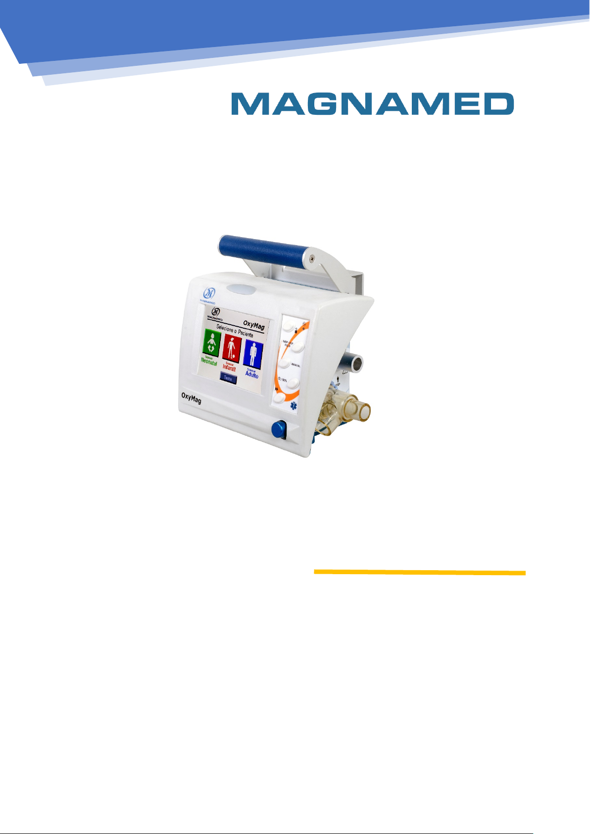 Manual de Operação OxyMag - Ventilador de Transporte e Emergência Registro na ANVISA nº 80659160004 Este manual de operação contempla o modelo de ventilador pulmonar de transporte e emergência 1600185-08: OxyMag – Versão 2.n, desenvolvido e fabricado pela Magnamed Tecnologia Médica S/A. Revisão deste manual de operação: nº 20 Todos os direitos reservados pela Magnamed Tecnologia Médica S/A Rua Santa Mônica 801/831 – Capuava CEP: 0671-865 – Cotia – SP – Brasil Tel/Fax: +55 (11) 4616-9699 Inscrição Estadual: 149.579.528.111 CNPJ: 01.298.443/0002-54 E-mail: magnamed@magnamed.com.br Website: www.magnamed.com.br Responsável Técnico: Tatsuo Suzuki Inscrição CREA SP: 0600629049 Responsável Legal: Tatsuo Suzuki É proibida a reprodução total ou parcial desta obra através de qualquer forma ou meio, sejam eles eletrônicos ou mecânicos, incluindo processos reprográficos, sem a expressa autorização da empresa. (Lei nº 9.610/1.998) mailto:magnamed@magnamed.com.br http://www.magnamed.com.br/ Índice Analítico ÍNDICE ANALÍTICO..................................................... 3 A. DEFINIÇÕES ...................................................... 5 B. ADVERTÊNCIA ................................................... 5 C. ATENÇÃO ......................................................... 7 D. OBSERVAÇÃO .................................................... 7 1. DESCRIÇÃO GERAL .......................................... 8 1.1 USO PRETENDIDO .............................................. 8 1.2 ITENS OPCIONAIS COMPATÍVEIS COM OS PRODUTOS .. 9 2. DESEMBALANDO O OXYMAG........................ 10 2.1 VERIFICAÇÕES INICIAIS ...................................... 10 2.2 PEÇAS E ACESSÓRIOS ...................................... 11 ACESSÓRIOS OPCIONAIS QUE PODEM SER ADQUIRIDOS PARA O MODELO OXYMAG .................................. 12 3. IDENTIFICAÇÃO DOS COMPONENTES ............ 15 3.1 COMPONENTES DO VENTILADOR DE TRANSPORTE... 15 4. DESCRIÇÃO DO DISPLAY ............................... 18 4.1 MODALIDADES ................................................. 18 4.2 ALARMES, MONITOR E STATUS ........................... 18 4.3 MONITOR, MENUS E GRÁFICOS........................... 18 4.4 AJUSTES DOS PARÂMETROS DA VENTILAÇÃO ......... 18 5. PREPARAÇÃO PARA O USO ........................... 19 5.1 MONTAGEM DO OXYMAG – VENTILADOR DE TRANSPORTE ................................................................... 19 5.2 MÁSCARA DE VENTILAÇÃO NÃO-INVASIVA NOS VENTILADORES .................................................................. 21 5.3 CONEXÃO À REDE ELÉTRICA ............................... 22 5.4 MONTAGEM DO SUPORTE VERTICAL .................... 22 6. VERIFICAÇÕES ANTES DO USO ...................... 24 6.1 PROCEDIMENTOS INICIAIS .................................. 24 6.2 AJUSTES DO VENTILADOR .................................. 25 SEQUÊNCIA NORMAL DE INICIALIZAÇÃO ............ 27 SEQUÊNCIA DE TESTES................................. 29 DIAGNÓSTICO DE FALHA ............................... 31 7. SENSOR DE CAPNOGRAFIA (ETCO2) .............. 33 7.1 INSTRUÇÕES DE USO ........................................ 33 7.2 MONTAGEM DO SENSOR .................................... 33 7.3 POSICIONAMENTO DO SENSOR ........................... 35 7.4 PROCEDIMENTO DE ZERAMENTO DO SENSOR ........ 36 7.5 INFORMAÇÕES SOBRE O LED ............................. 37 7.6 MANUTENÇÃO PREVENTIVA DO SENSOR DE ETCO2 37 7.7 ESPECIFICAÇÕES TÉCNICAS DO CAPNÓGRAFO ...... 38 8. OXÍMETRO (MASIMO) ..................................... 42 8.1 PRINCÍPIO DE OPERAÇÃO .................................. 42 8.2 MONTAGEM DO SENSOR ................................... 45 9. DESCRIÇÃO DAS MODALIDADES ................... 46 9.1 VCV – VENTILAÇÃO DE VOLUME CONTROLADO ......46 9.2 PCV – VENTILAÇÃO DE PRESSÃO CONTROLADA ......48 9.3 PLV – VENTILAÇÃO DE PRESSÃO LIMITADA ............50 9.4 V-SIMV – VENTILAÇÃO SINCRONIZADA MANDATÓRIA INTERMITENTE - CICLO VOLUME CONTROLADO ........................52 9.5 P-SIMV – VENTILAÇÃO MANDATÓRIA SINCRONIZADA INTERMITENTE - CICLO DE PRESSÃO CONTROLADA ....................54 9.6 CPAP/PSV - VENTILAÇÃO DE PRESSÃO CONTÍNUA COM PRESSÃO DE SUPORTE ..................................................56 9.7 DUALPAP – VENTILAÇÃO EM DOIS NÍVEIS DE PRESSÃO POSITIVA CONTÍNUA ...........................................................58 9.8 APRV – VENTILAÇÃO POR ALÍVIO DE PRESSÃO NAS VIAS AÉREAS (MODALIDADE OBTIDA COM A RELAÇÃO INVERTIDA DO DUALPAP) 60 10. ALARMES DISPONÍVEIS .................................. 62 10.1 DESCRIÇÃO DE CONTROLE DE ALARME ..............62 10.2 AJUSTE DOS ALARMES ..................................68 10.3 VENTILAÇÃO MANUAL NO PACIENTE .................68 10.4 TESTE DE ALARME ........................................69 ALARME DE ALTA PRESSÃO: ............................69 ALARME DE FALHA DE ALIMENTAÇÃO ELÉTRICA: ..69 ALARME DE FRAÇÃO INSPIRATÓRIA DE OXIGÊNIO:69 11. LIMPEZA E ESTERILIZAÇÃO ............................ 70 11.1 LIMPEZA DO EQUIPAMENTO .............................70 SUPERFÍCIES EXTERNAS DO VENTILADOR ..........70 TELA SENSÍVEL AO TOQUE (TOUCH SCREEN) ......70 CIRCUITO RESPIRATÓRIO, SENSOR DE FLUXO PROXIMAL E VÁLVULA EXPIRATÓRIA ........................................71 11.2 ESTERILIZAÇÃO ............................................71 11.3 MÉTODOS DE PROCESSAMENTO ......................72 12. MANUTENÇÃO PREVENTIVA .......................... 73 12.1 INDICAÇÃO DA NECESSIDADE DE MANUTENÇÃO PERIÓDICA 73 12.2 VERIFICAÇÕES DIÁRIAS E/OU ANTES DO USO ......73 12.3 BATERIA INTERNA DE LÍTIO .............................73 12.4 SENSOR INTERNO DE CONCENTRAÇÃO DE O2 ....74 12.5 SUBSTITUIÇÃO DO FILTRO DE AR AMBIENTE .......75 12.6 ENCAMINHANDO O PRODUTO PARA SERVIÇO DE REPARO 76 13. DESCARTE ..................................................... 77 14. DESLI