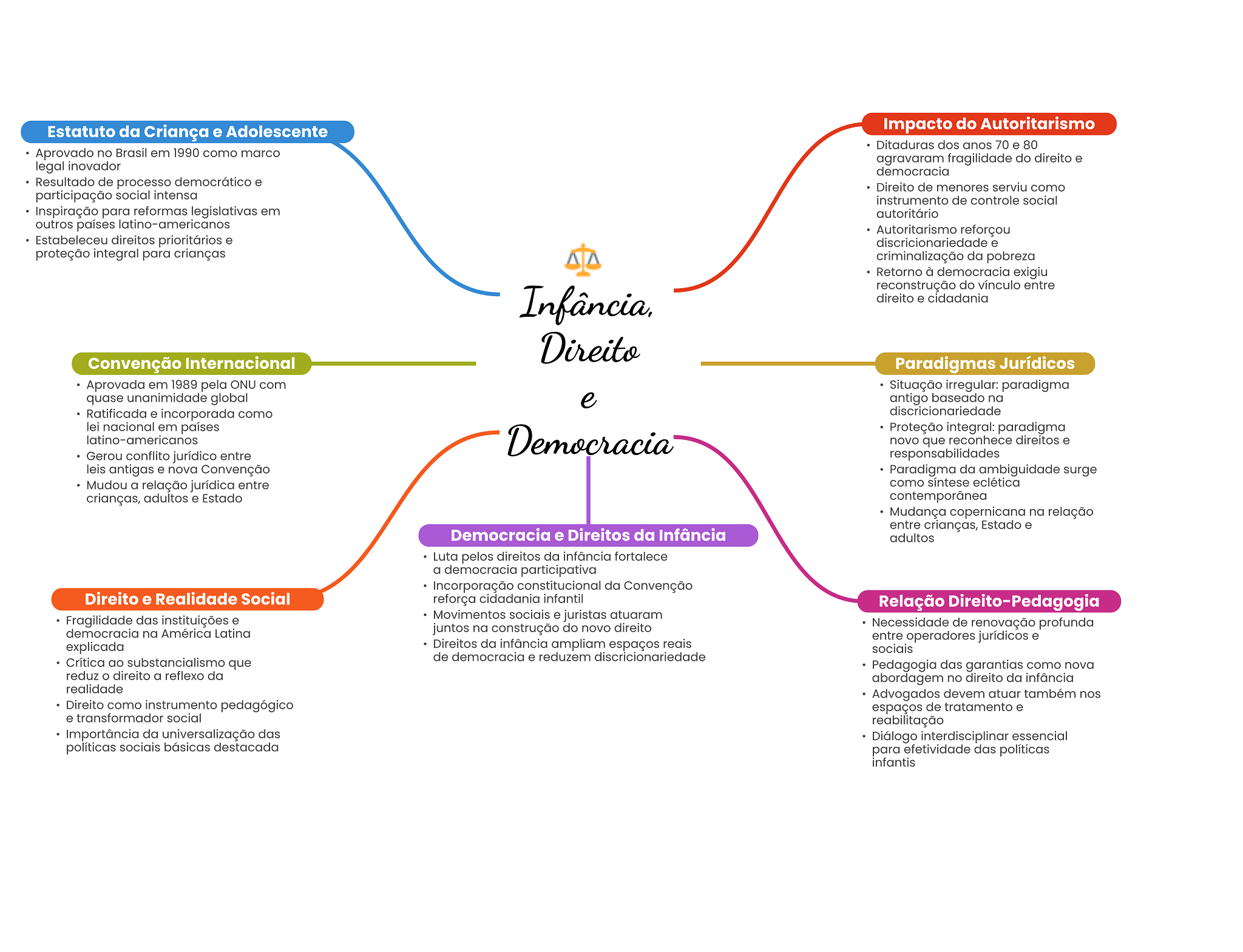 Estatuto da Criança e Adolescente Impacto do Autoritarismo Ditaduras dos anos 70 e 80 Aprovado no Brasil em 1990 como marco agravaram fragilidade do direito e legal inovador democracia Resultado de processo democrático e Direito de menores serviu como participação social intensa instrumento de controle social Inspiração para reformas legislativas em autoritário outros países latino-americanos Autoritarismo reforçou Estabeleceu direitos prioritários e discricionariedade e proteção integral para crianças criminalização da pobreza Retorno à democracia exigiu reconstrução do vínculo entre Infância, direito e cidadania Direito Convenção Internacional Paradigmas Jurídicos Aprovada em 1989 pela ONU com Situação irregular: paradigma quase unanimidade global e antigo baseado na Ratificada e incorporada como discricionariedade lei nacional em países Democracia Proteção integral: paradigma latino-americanos novo que reconhece direitos e Gerou conflito jurídico entre responsabilidades leis antigas e nova Convenção Paradigma da ambiguidade surge Mudou a relação jurídica entre como síntese eclética crianças, adultos e Estado contemporânea Mudança copernicana na relação entre crianças, Estado e Democracia e Direitos da Infância adultos Luta pelos direitos da infância fortalece a democracia participativa Incorporação constitucional da Convenção Direito e Realidade Social reforça cidadania infantil Relação Direito-Pedagogia Fragilidade das instituições e Movimentos sociais e juristas atuaram democracia na América Latina juntos na construção do novo direito Necessidade de renovação profunda entre operadores jurídicos e explicada Direitos da infância ampliam espaços reais sociais de democracia e reduzem discricionariedade Crítica ao substancialismo que Pedagogia das garantias como nova reduz direito a reflexo da abordagem no direito da infância realidade Advogados devem atuar também nos Direito como instrumento pedagógico espaços de tratamento e e transformador social reabilitação Importância da universalização das Diálogo interdisciplinar essencial políticas sociais básicas destacada para efetividade das políticas infantis