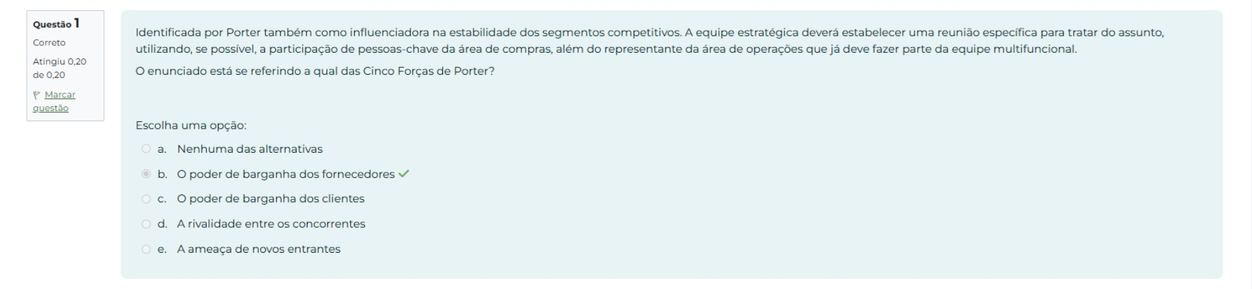 Questão 1 Identificada por Porter também como influenciadora na estabilidade dos segmentos competitivos. A equipe estratégica deverá estabelecer uma reunião específica para tratar do assunto, Correto utilizando, se possível, a participação de pessoas-chave da área de compras, além do representante da área de operações que já deve fazer parte da equipe multifuncional. Atingiu 0,20 de 0,20 enunciado está se referindo a qual das Cinco Forças de Porter? P Marcar Escolha uma opção: a. Nenhuma das alternativas b. O poder de barganha dos fornecedores C. poder de barganha dos clientes d. A rivalidade entre concorrentes e. A ameaça de novos entrantes